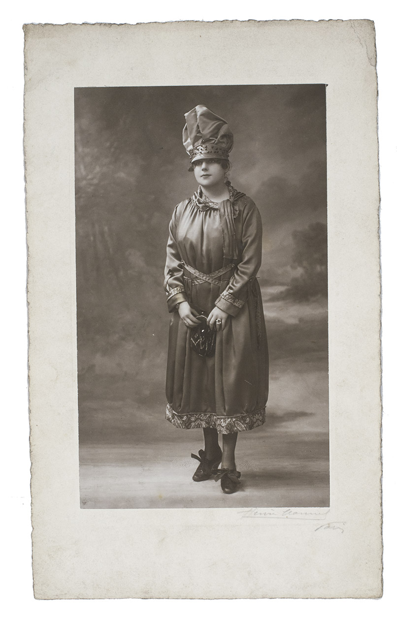 Although the photographs bear no captions, one is stamped and inscribed on the back (visible when held up in front of a light source, as the photograph is mounted on a sheet of paper) showing clothing by the maison Lieser & Michels.