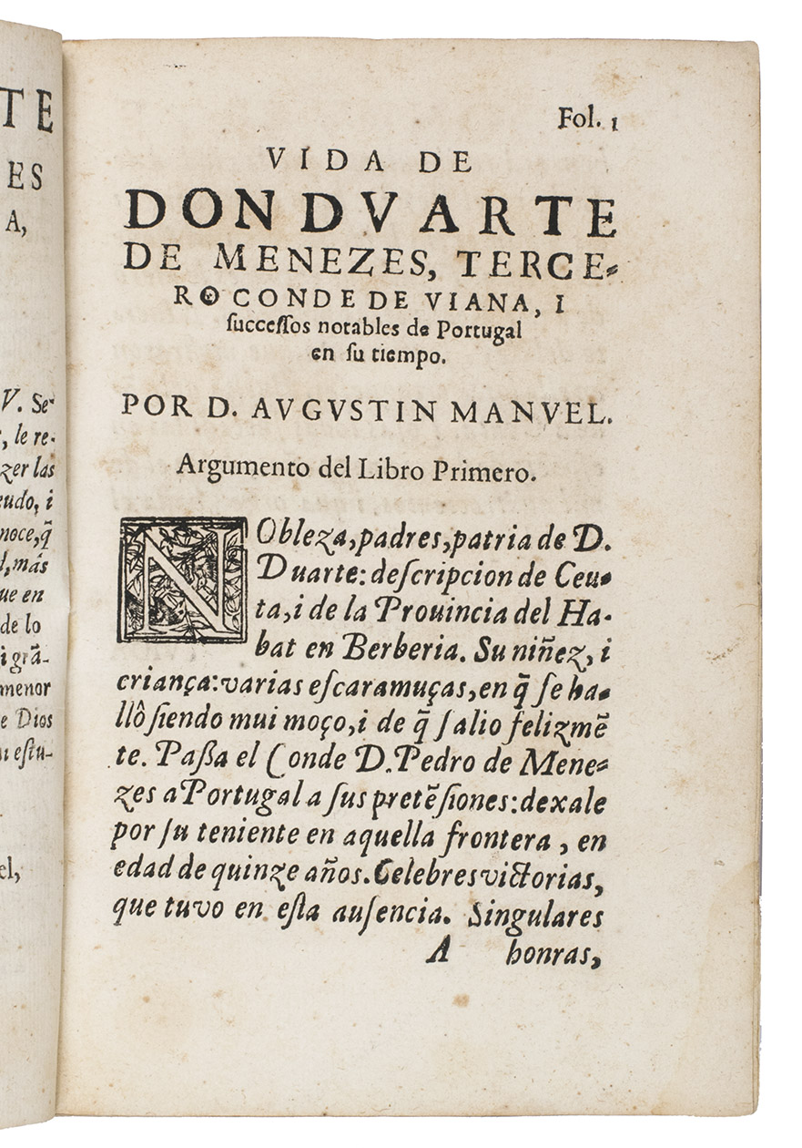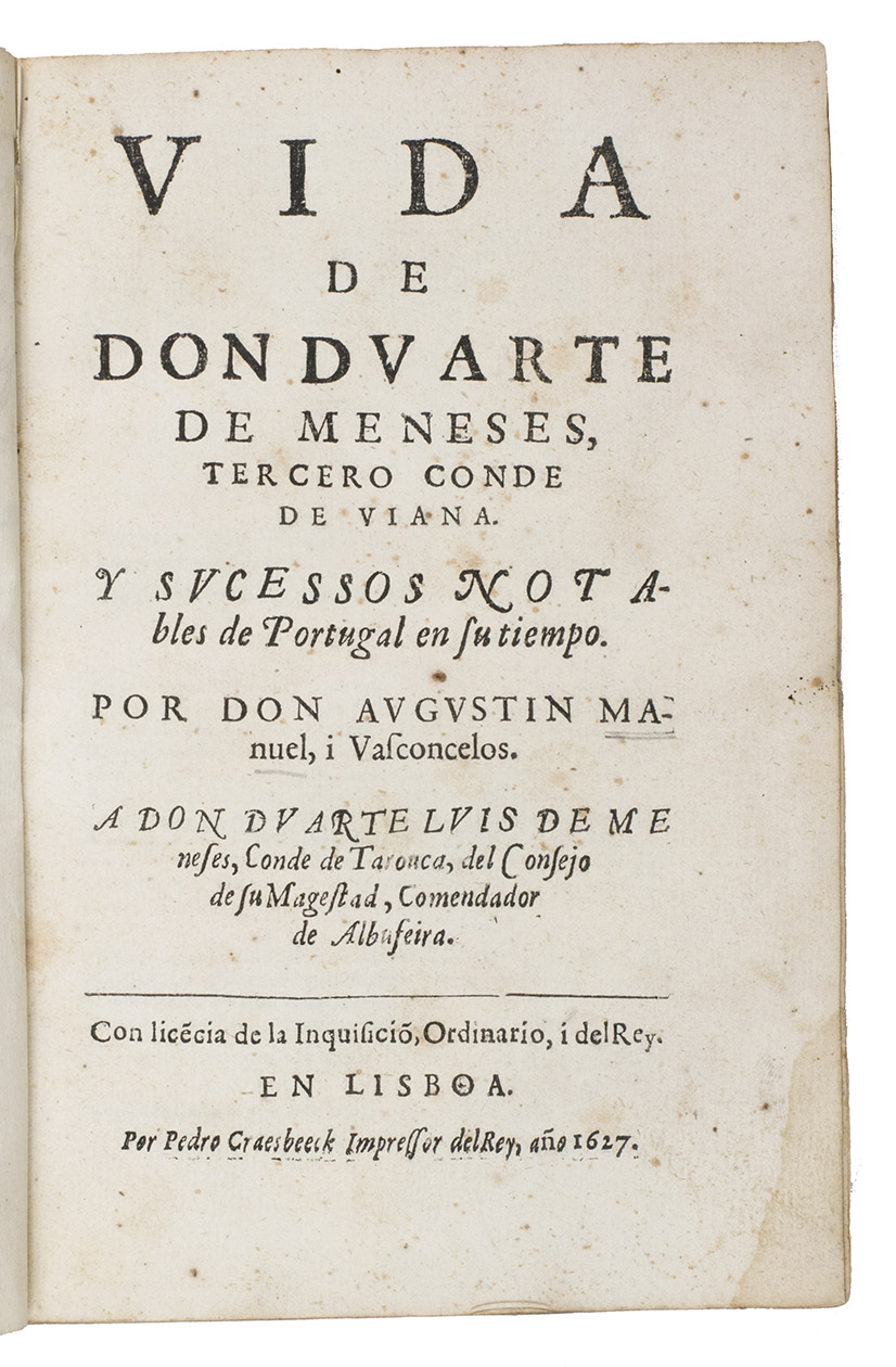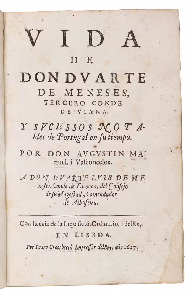 First edition of the first biography of Don Duarte de Meneses (1414-1464), a Portuguese nobleman, who fought extensively in Morocco. According to Martins Costa, he was one of the most notable warriors of the late Middle Ages and managed to climb the social ladder because of his military prowess.