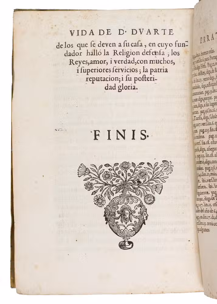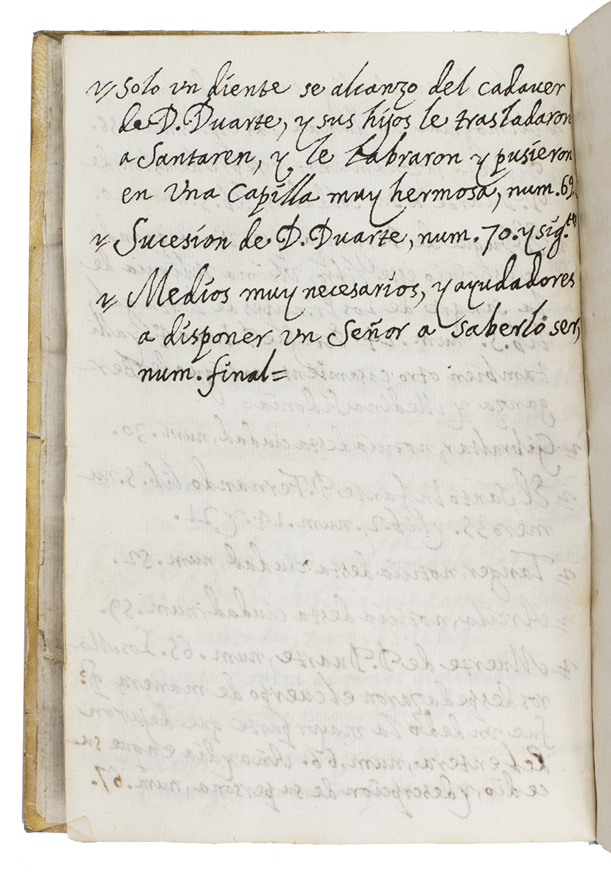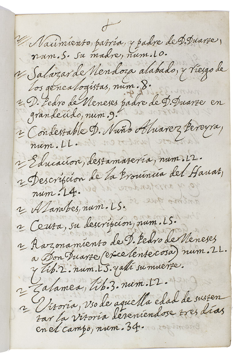 With the bookplate of Antonio Cánovas del Castillo mounted on the front pastedown, a handwritten Spanish annotation with a short summary of different parts of the work in a 20th-century (?) hand on the second and third free flyleafs, and a small annotation in the top corner of the last pastedown ("50f"). The parchment is creased and dented, with some loss of material on the spine. With a waterstain in the lower corner of the first 20 leaves, a small pen mark on leaf 55 and 56, slight foxing and browning throughout. Otherwise in good condition. Iberian books B71213; Innocencio I, 196; Maggs 495, 565; Palau 150183; Reiss & Auvermann auction 40, 307/308; Salvá 3469; cf. Martins Costa, Duarte de Meneses (1414-1464): O sangue e as armas no final de Idade Média. In: E-strategica 2, 2018, p. 25-47.