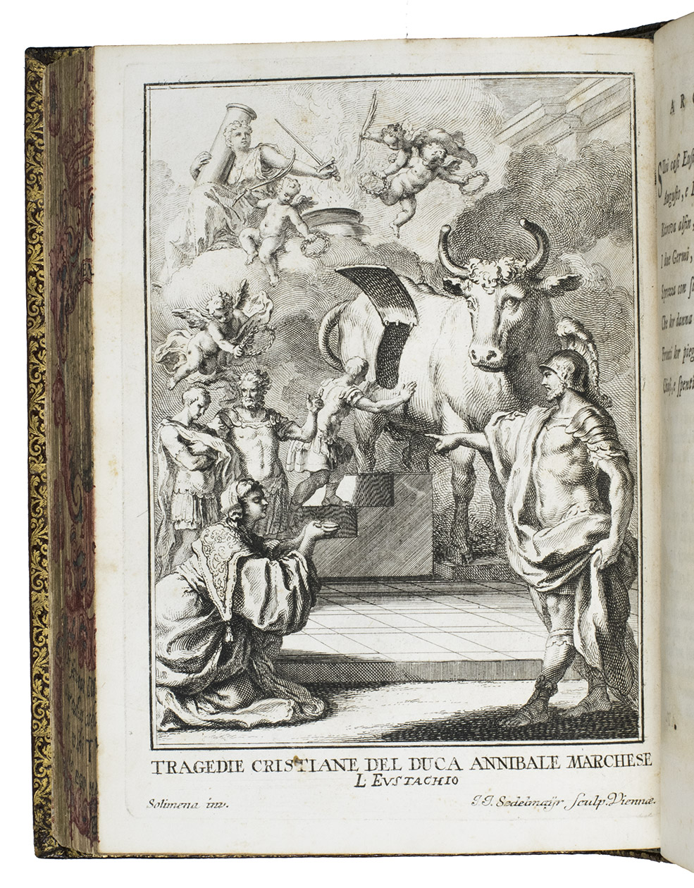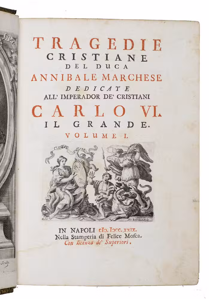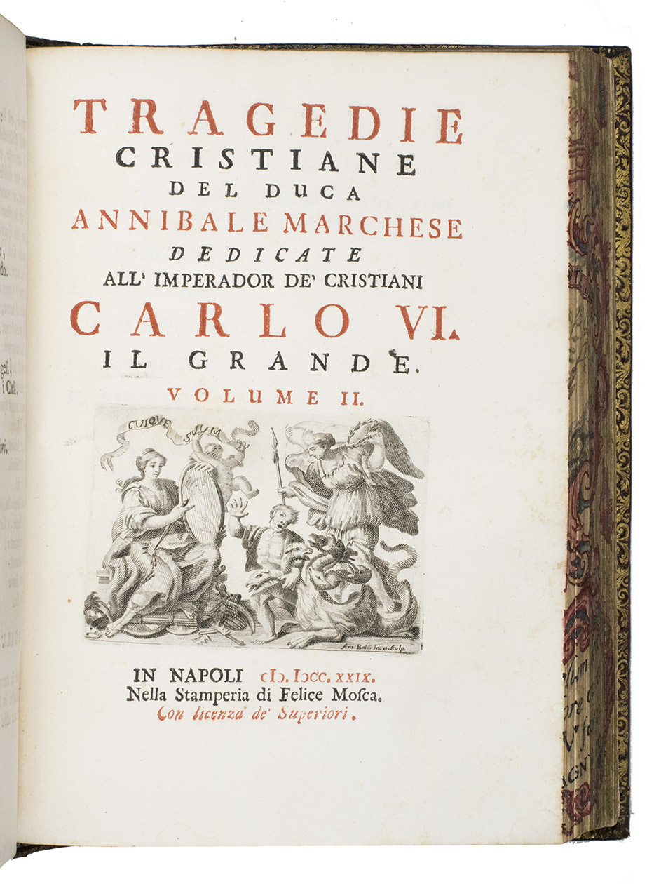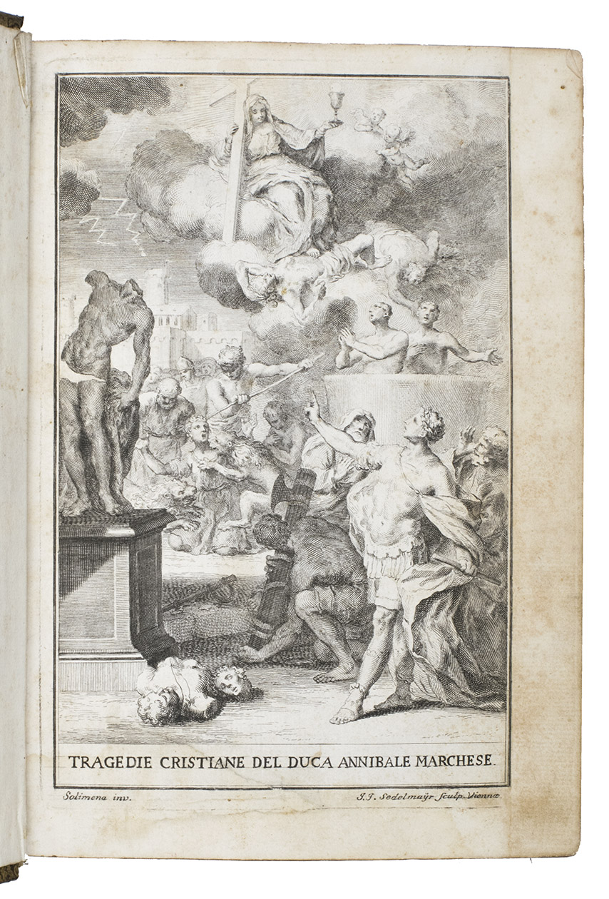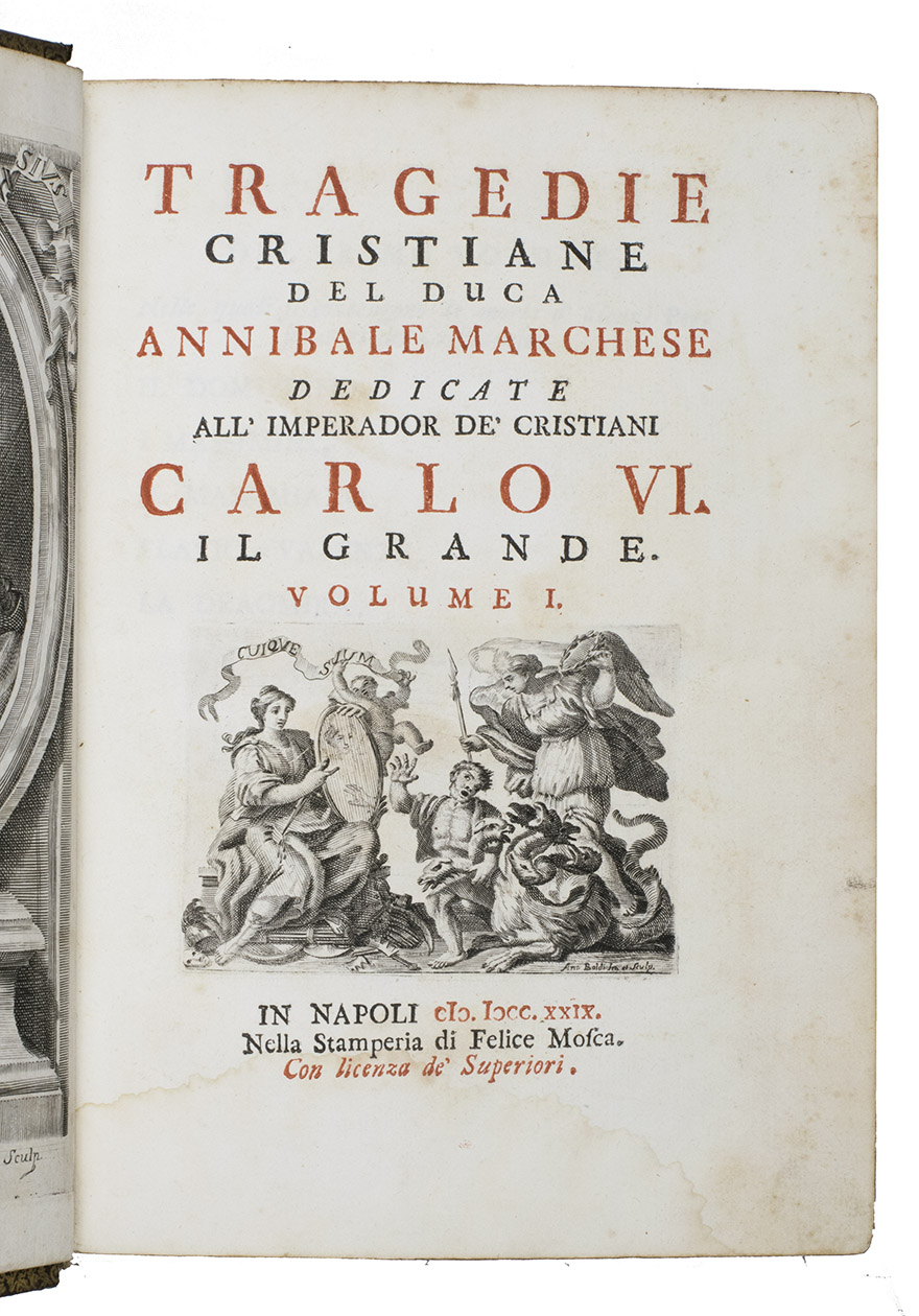First and only edition of a collection of 10 Italian Christian tragedies, written by the Naples poet Duca Annibale Marchese (1687-1753). It is illustrated with beautiful engravings after the important Italian baroque painter Francesco Solimena (1657-1747) and complemented with the engraved music for the choruses of the five tragedies in the second volume, composed by some of the most foremost Italian and German 17th- and 18th-century composers, like Tommaso Carapella (1655-1736), Domenico Sarro (1679-1744), Leonardo Vinci (1690-1730) Francesco Durante (1684-1755), Johann Adolf Hasse (1699-1783), Nicola Fago (1677-1745) and more.