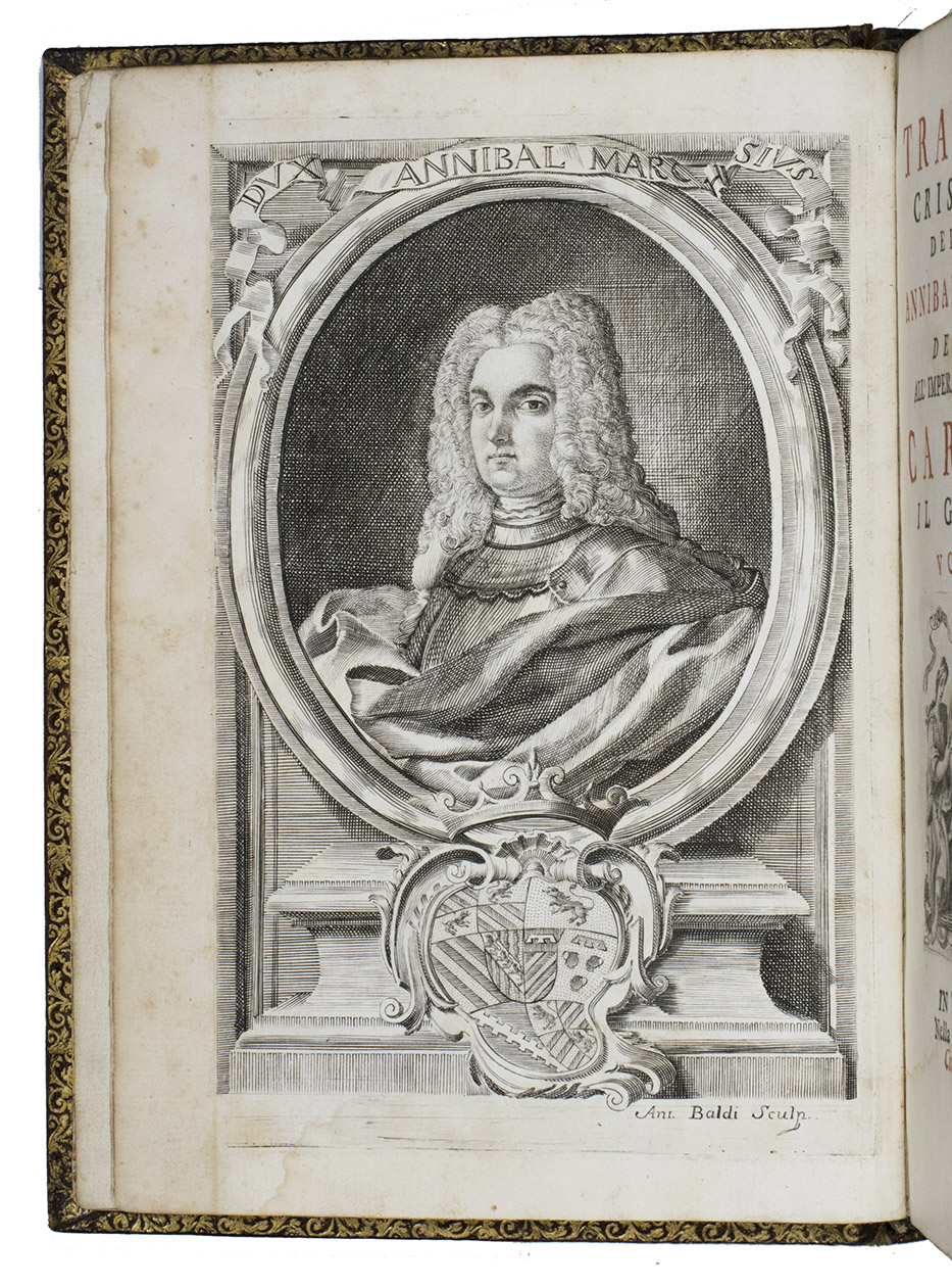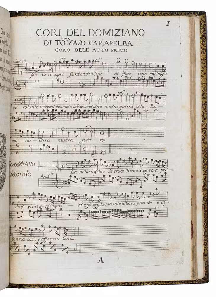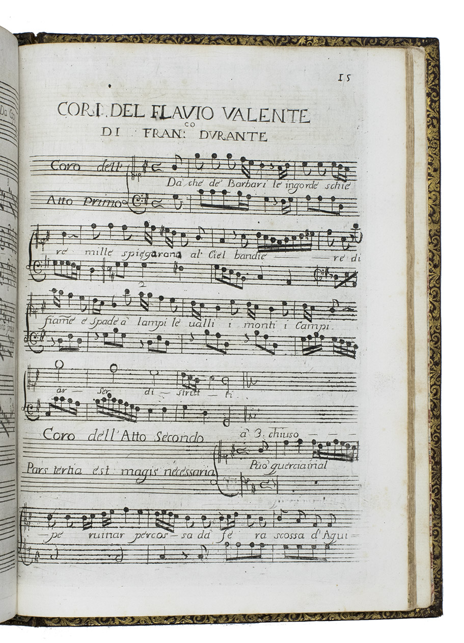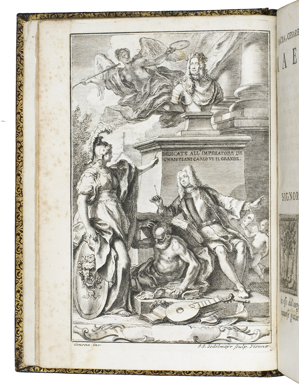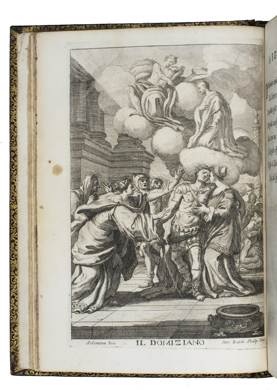 First and only edition of a collection of 10 Italian Christian tragedies, written by the Naples poet Duca Annibale Marchese (1687-1753). It is illustrated with beautiful engravings after the important Italian baroque painter Francesco Solimena (1657-1747) and complemented with the engraved music for the choruses of the five tragedies in the second volume, composed by some of the most foremost Italian and German 17th- and 18th-century composers, like Tommaso Carapella (1655-1736), Domenico Sarro (1679-1744), Leonardo Vinci (1690-1730) Francesco Durante (1684-1755), Johann Adolf Hasse (1699-1783), Nicola Fago (1677-1745) and more.