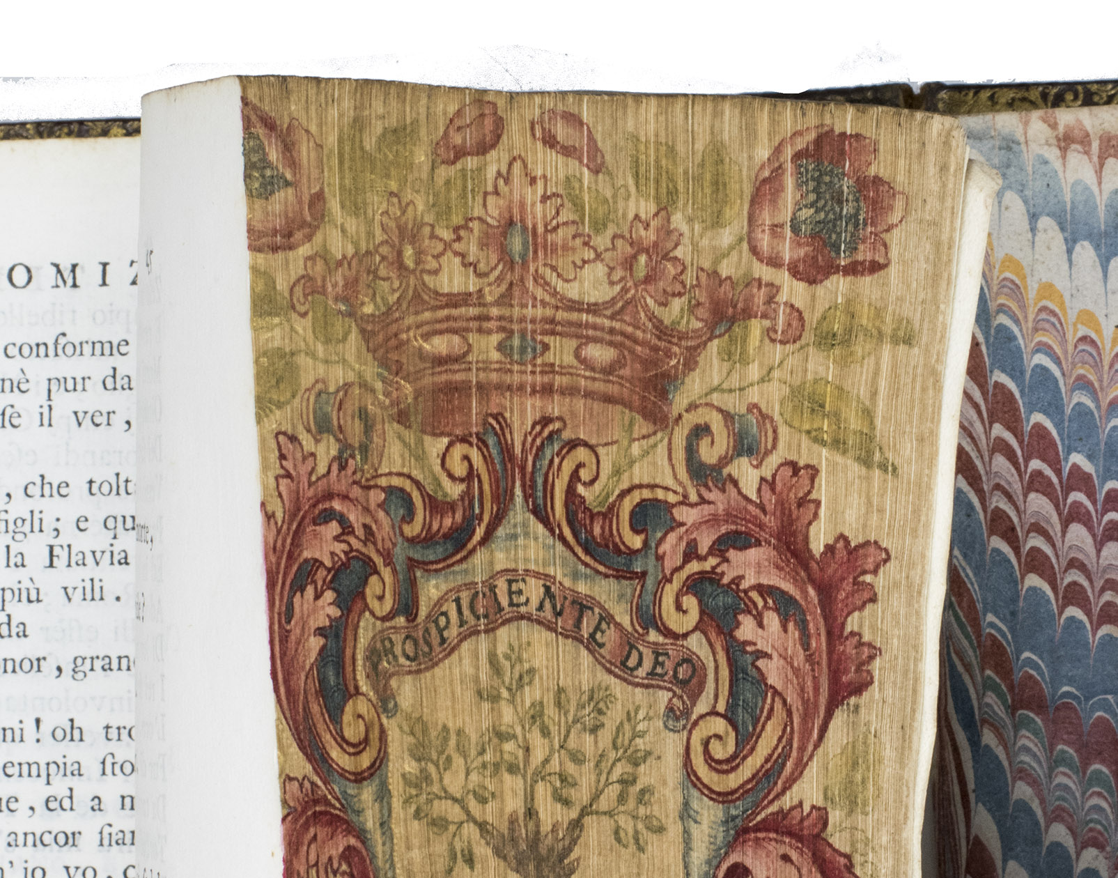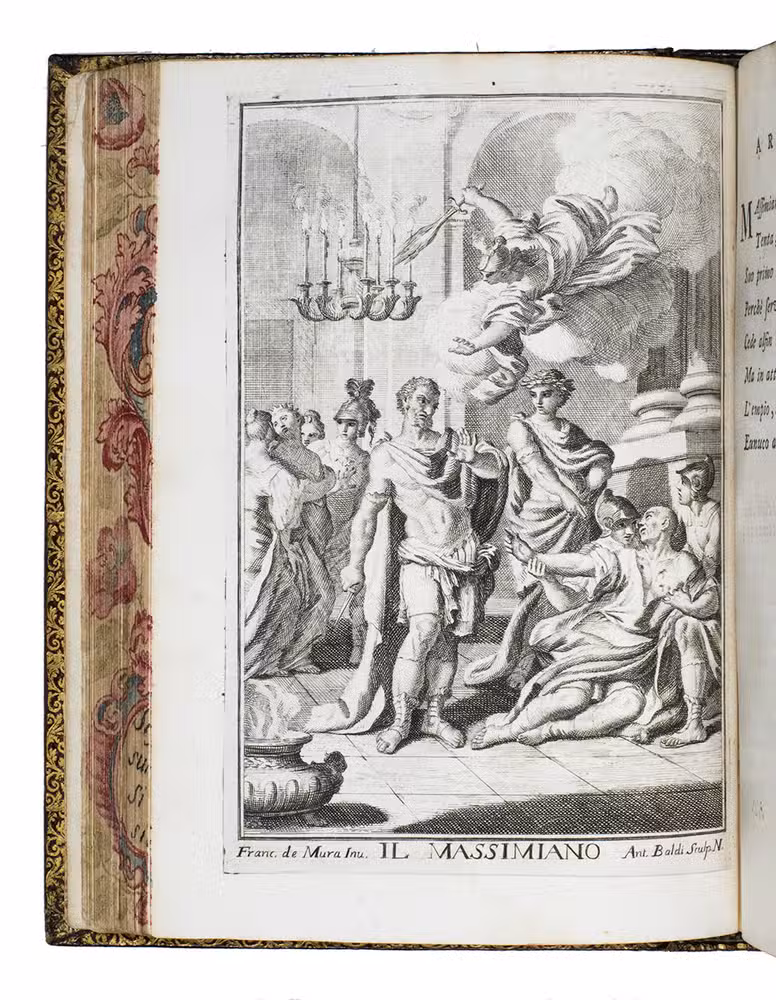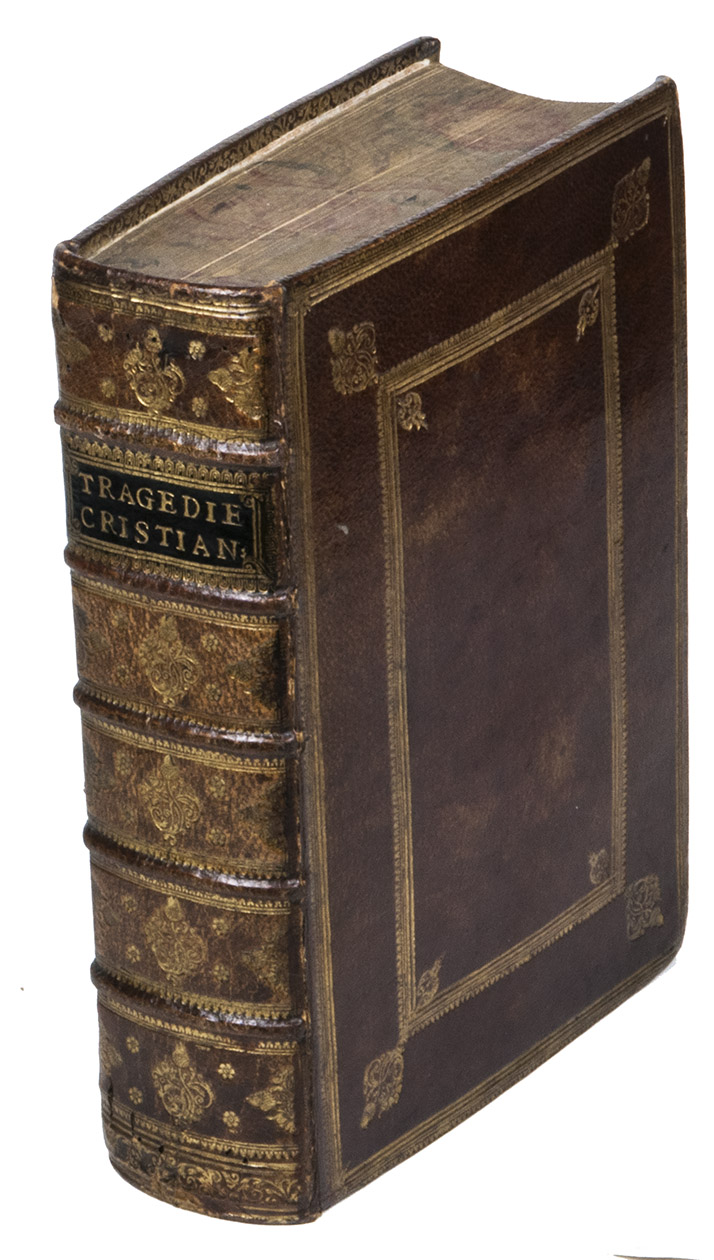Naples, Felice Mosca, 1729. 2 volumes in 1. Large 8vo. With two title-pages in red and black, an engraved frontispiece by Jeremias Jakob Sedelmayr after Francesco Solimena, an engraved author's portrait by Antonio Baldi and 11 engraved plates by Sedelmayr and Baldi after Solimena, accompanying the 10 tragedies and the dedication. Also with some engraved initials, woodcut tailpieces and 40 pages of engraved polyphonic music for the choruses. Contemporary gold-tooled brown goatskin morocco, gilt and gauffered edges with an intricate fore-edge painting, incorporating both a closed and fanned design for the fore-edge. The head and foot edges are painted with floral and botanical designs. [4], [16], 502; [4], 504, [2]; pp. plus 40 pp. of engraved music.
