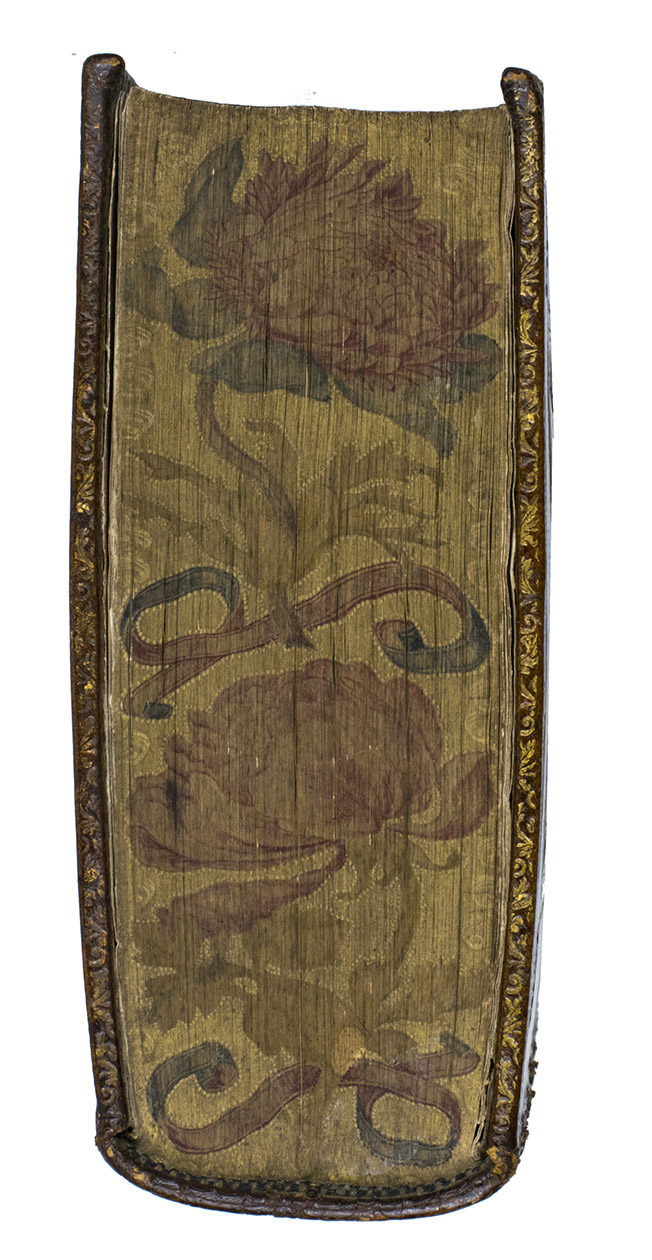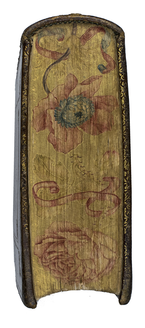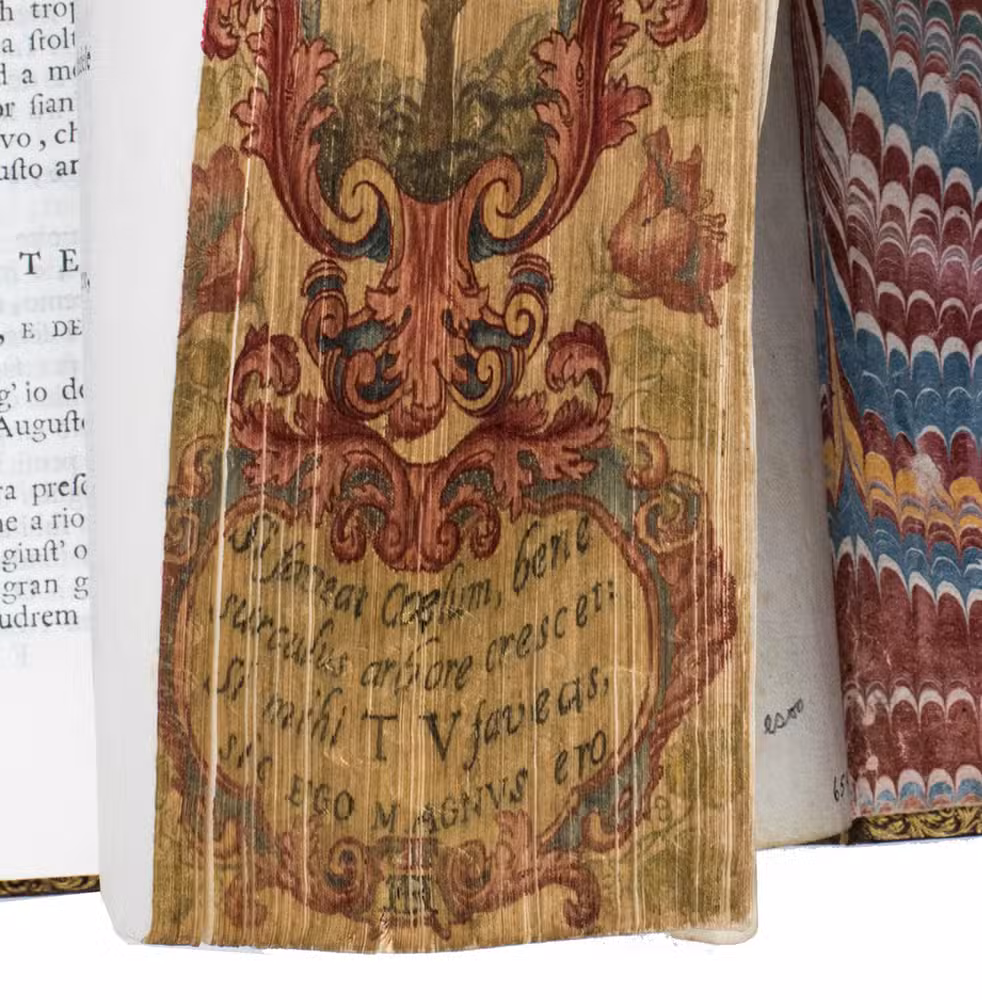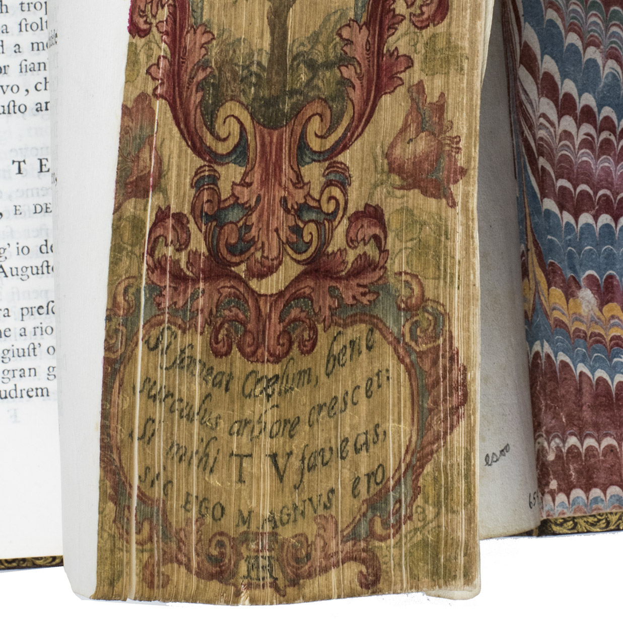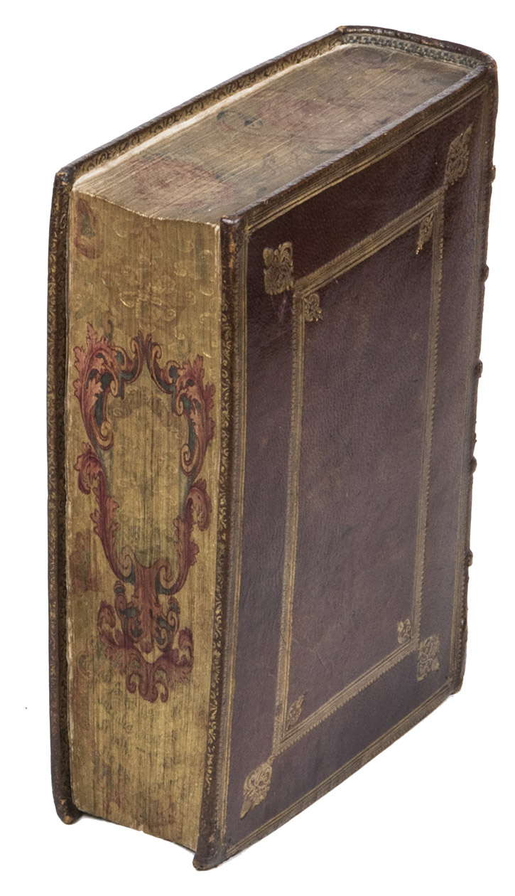 With the armorial bookplate of James Whittle and another bookplate of the California collector and philanthropist Dorothy Jayne Pedrini Shea, both on the front paste-down. Also with the bookplate of Randall J. Moskovitz M.D. loosely inserted, whose estate holds many books with fore-edge paintings. Binding only slightly worn around the edges and corners, a few wormholes on the spine. Some browning and foxing, some marginal water stains in the foot margin of the first few leaves (the preliminaries; not affecting the plates). Overall in good condition. A fascinating binding with two bright and detailed fore-edge paintings on the fore-edge, one when it is closed and another when it is fanned open. ICCU, NAPE 006664 & 006666; for the emblem ofthe fore-edge painting: Emblemata: Handbuch zur Sinnbildkunst des XVI. und XVII. Jahrhunderts, col. 165; Bernhard Schirg, "The Daphnic fate of Camerarius; Swedens first printed emblem book revealed in Olof Rudbeck the youngers botanical dissertation (1686)", in: Intersections: interdisciplinary studies in early modern Europe, 50 (2017): Emblems and the natural world, p. 564, no. 11.