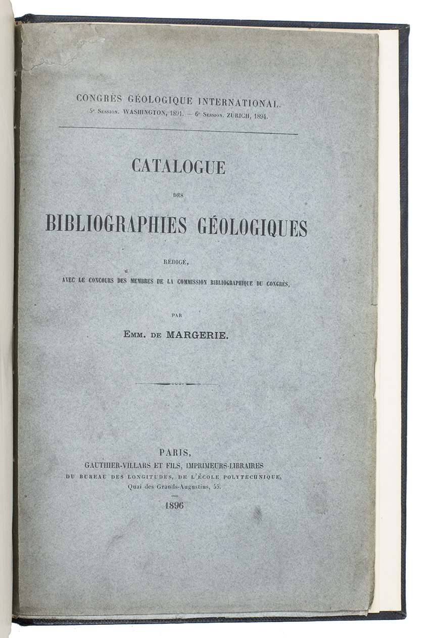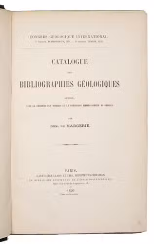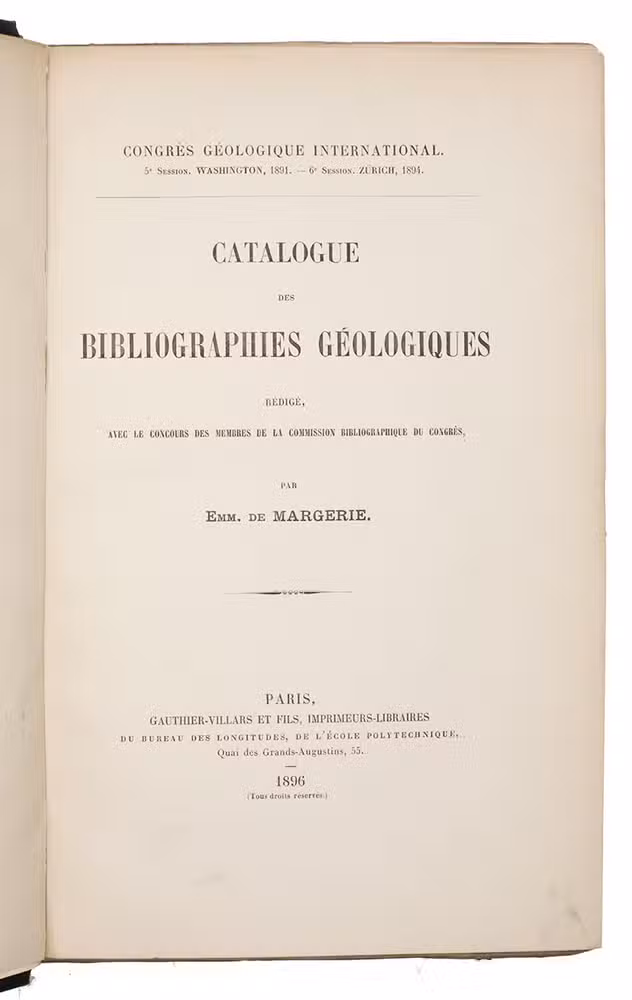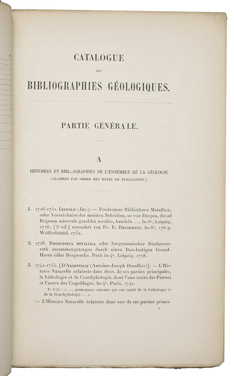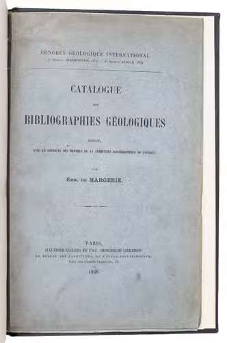 Reference work by Emmanuel de Margerie, author of many geological and geomorphological studies, that lists bibliographies that are published on geology, mineralogy and natural history in general. He divides them into two main sections, namely more general bibliographies and the more regional bibliographies, for example for Germany, Italy or France, but also Asia, Africa and the Americas. This catalogue is even nowadays still of value.