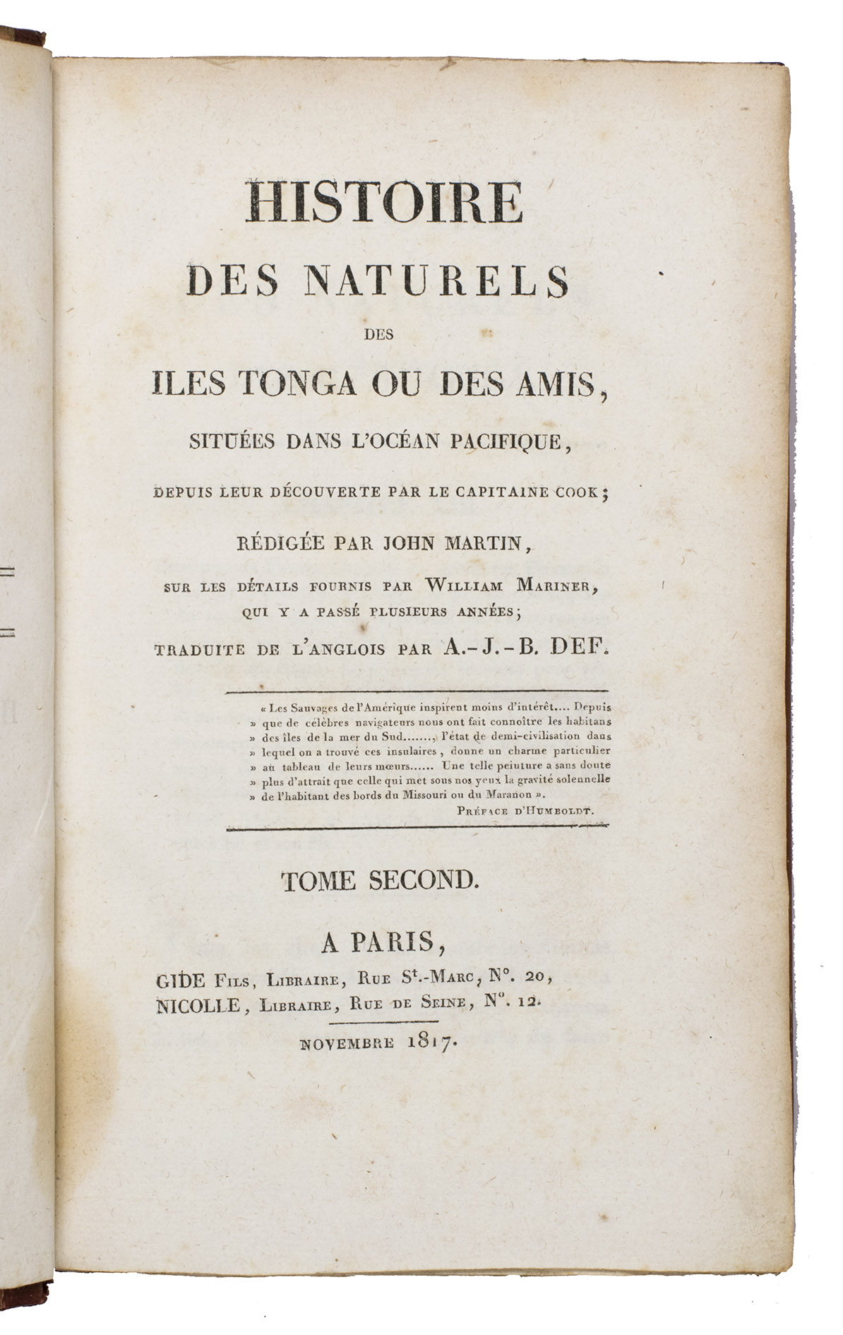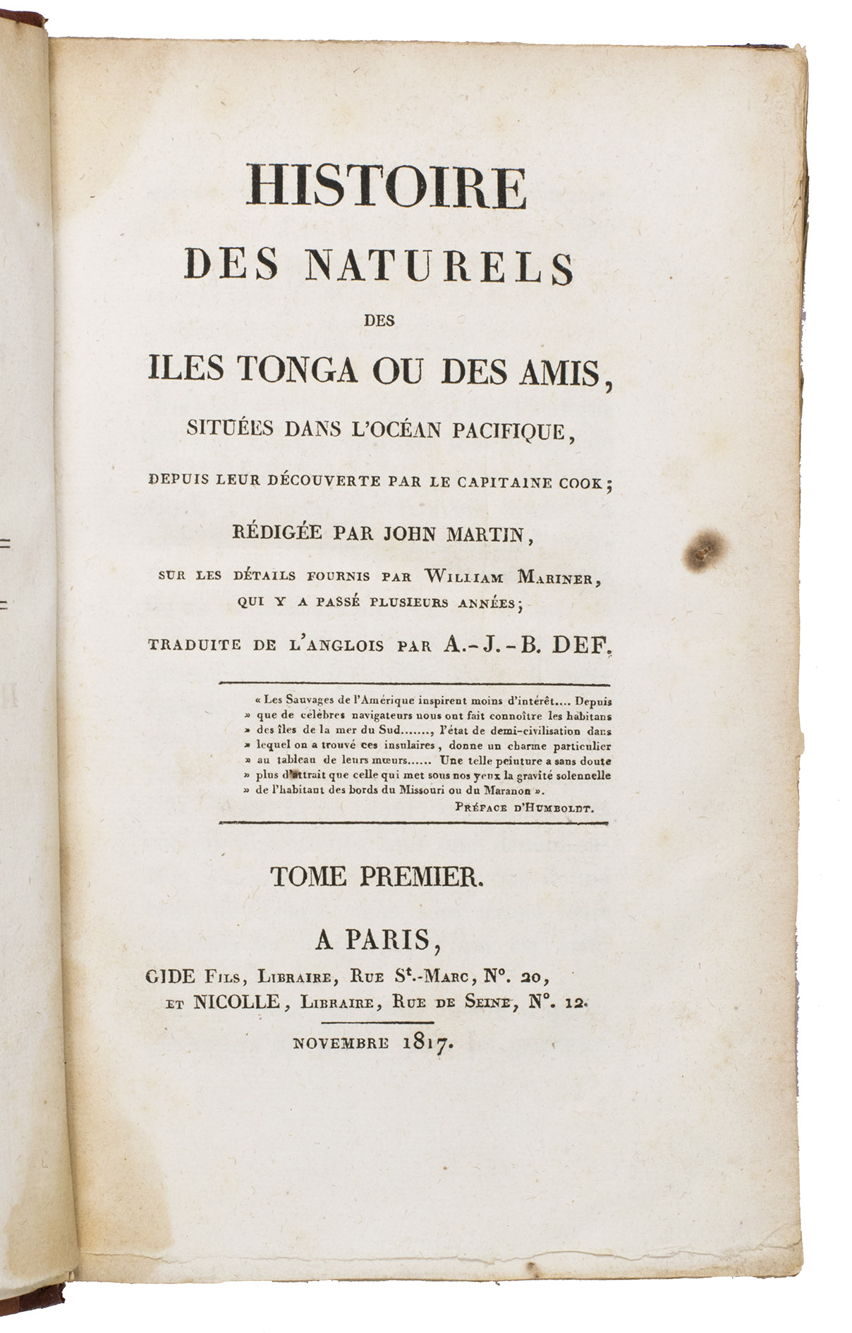 Histoire des naturels des Iles Tonga ou des Amis, situées dans l'Océan Pacifique depuis leur découverte par le Capitaine Cook; rédigée par John Martin, sur les détails fournis par William Mariner, qui y a passé plusieurs années; ...
