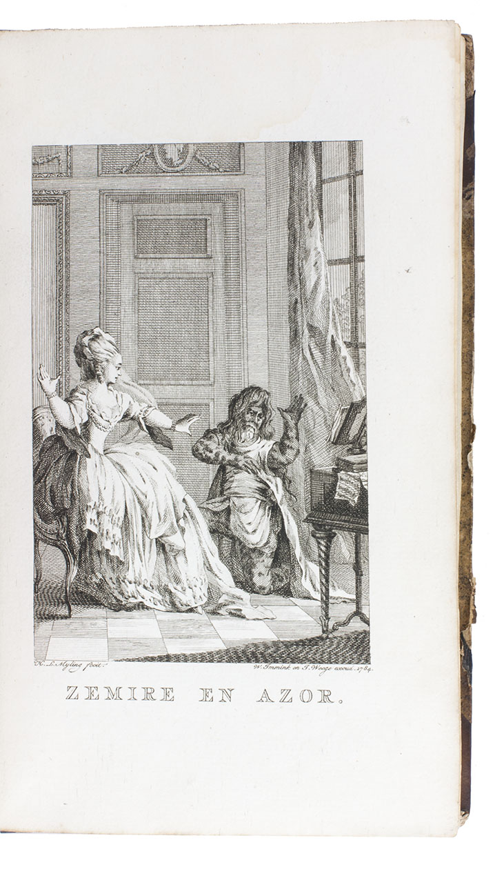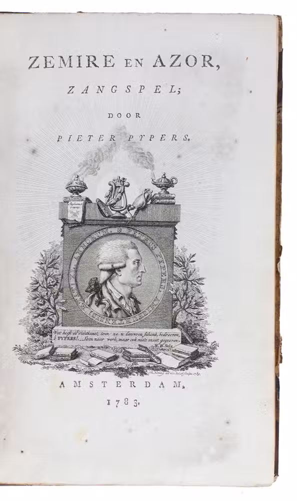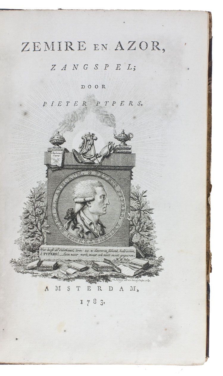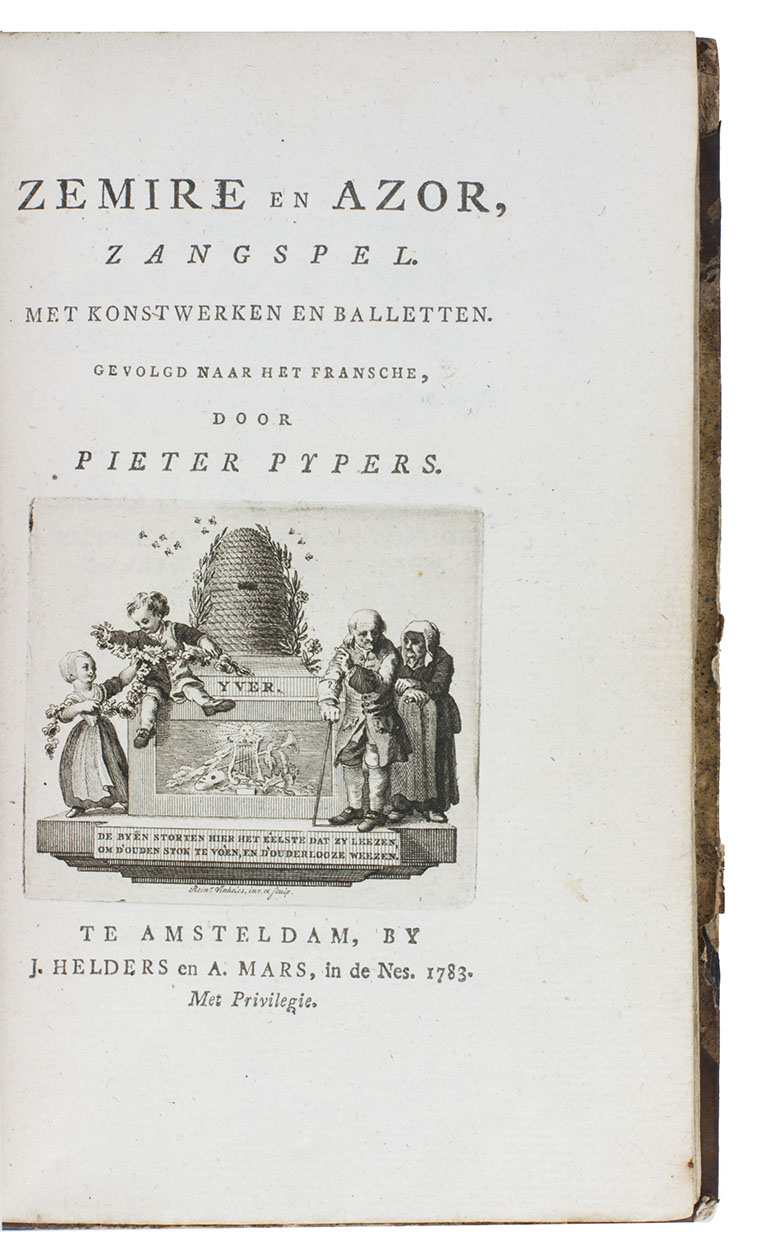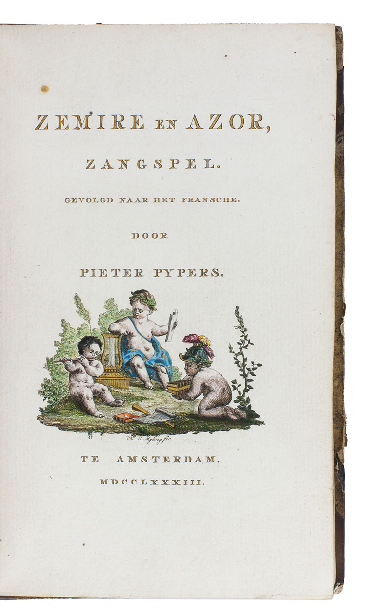 Splendid copy, luxuriously extra-illustrated 5 years after the original publication, of the first edition of Pijpers's Dutch adaptation of Marmontel's 1771 Zémire et Azor, a version of the fairytale Beauty and the beast. It is signed in brown ink by the author, and on the last page by G. de Visscher (one of the delegates of the Amsterdam theatre) as a warrant of authenticity, with the privilege to the printers Helders and Mars, dated "Amsteldam, den. 6 Augustus, 1783". STCN notes that some copies, like ours, have 2 additional folia: an illustrated typographical title page (with Pijpers's roundel portrait on a monument), dated "1783" in letterpress, but the engraving itself dated 1789, and a poem by Pieter Pijpers, entitled "Op Myne afbeelding", dated 1789. Apart from these extra leaves, our copy is embellished with 6 plates with scenes of the play from the original French edition of Marmontel's play, published in Paris, 1771, here all beautifully coloured, and with 3 extra plates by Dutch artists, probably made to illustrate a third edition; a second edition appeared in 1786.