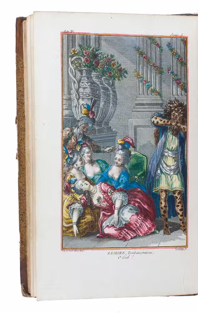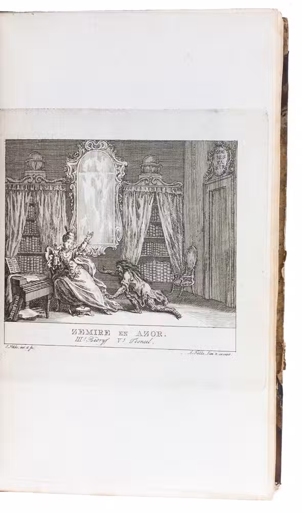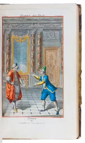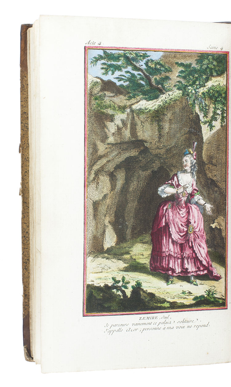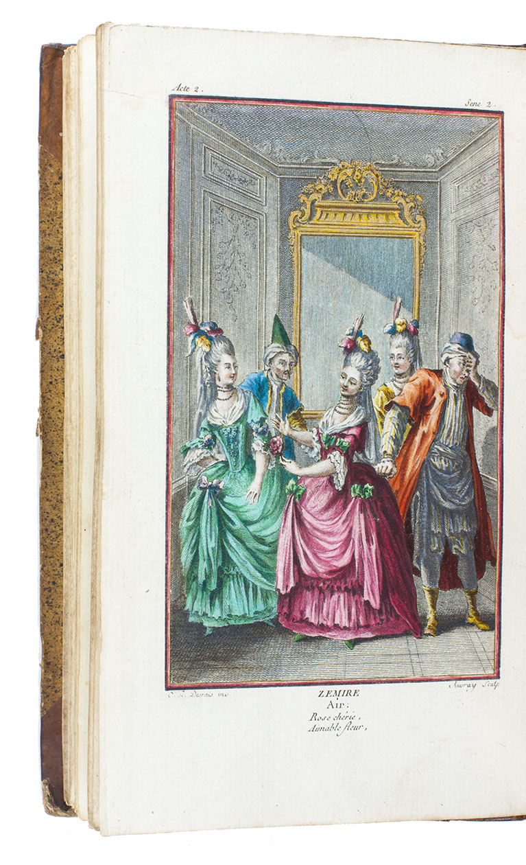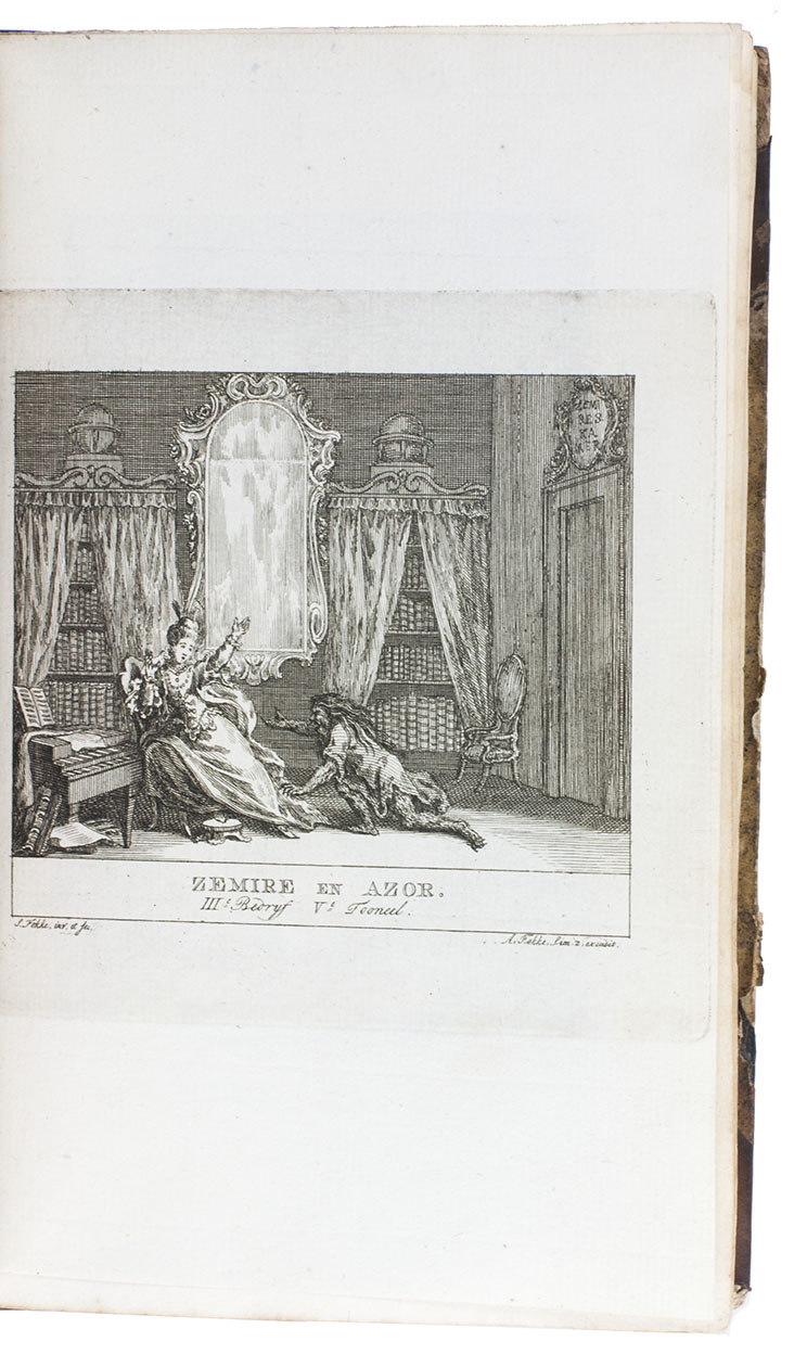 Splendid copy, luxuriously extra-illustrated 5 years after the original publication, of the first edition of Pijpers's Dutch adaptation of Marmontel's 1771 Zémire et Azor, a version of the fairytale Beauty and the beast. It is signed in brown ink by the author, and on the last page by G. de Visscher (one of the delegates of the Amsterdam theatre) as a warrant of authenticity, with the privilege to the printers Helders and Mars, dated "Amsteldam, den. 6 Augustus, 1783". STCN notes that some copies, like ours, have 2 additional folia: an illustrated typographical title page (with Pijpers's roundel portrait on a monument), dated "1783" in letterpress, but the engraving itself dated 1789, and a poem by Pieter Pijpers, entitled "Op Myne afbeelding", dated 1789. Apart from these extra leaves, our copy is embellished with 6 plates with scenes of the play from the original French edition of Marmontel's play, published in Paris, 1771, here all beautifully coloured, and with 3 extra plates by Dutch artists, probably made to illustrate a third edition; a second edition appeared in 1786.