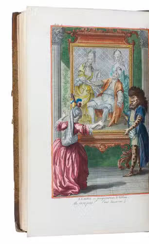 With generous margins and many deckles intact. In very good condition, with only occasional very minor spotting and a water stain in one of the blank guard leaves protecting the coloured plates. Corners bumped and back board rubbed. Desirable, extra-illustrated Dutch Beauty and the beast, incorporating lavishly coloured Dutch and French plates. Van Aken, Cat. Ned. Toneel II, p. 351 (mentioning only a title vignette); Moderne Encyclopedie van de Wereldliteratuur, vol. 7, p. 239; STCN (8 copies, only 3 with engr. title).