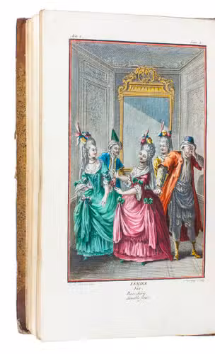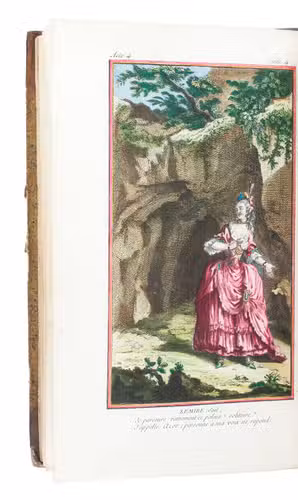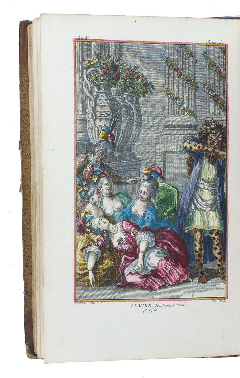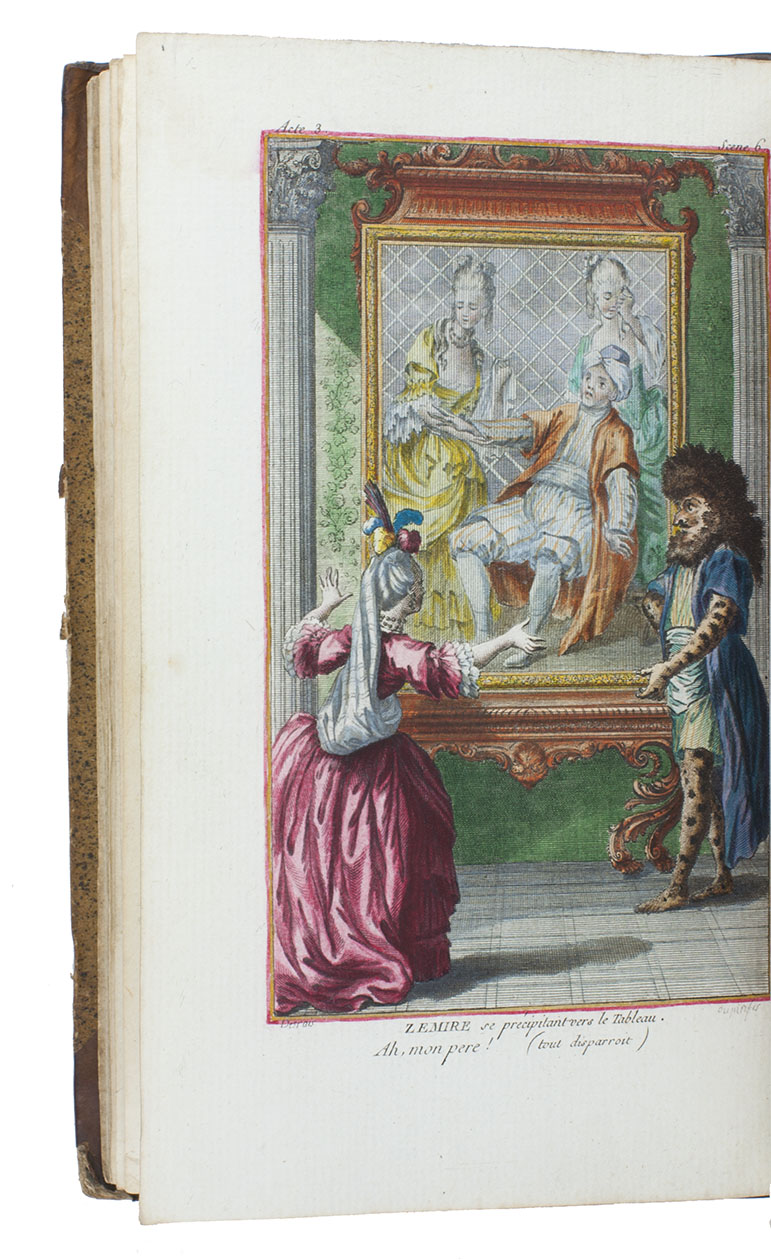 Amsterdam, Jan Helders, Abraham Mars, 1783. 8vo. With an engraved title page including a vignette by H.L. Meyling, a letterpress title page with an emblematic engraved vignette by Reinier Vinkeles. Extra added in this copy are an additional letterpress title page, also dated "1783", but with a portrait of Pieter Pijpers engraved by Theodorus Koning dated 1789, accompanied by the letterpress explanatory leaf with a poem "Op myne afbeelding door Theodorus Koning", dated 1789, signed by Pijpers in brown ink. Further with 3 extra added engraved plates (2 full-page and 1 half-page), plus 1 repeated in an earlier state with no lettering, depicting scenes from the play by various Dutch artists (A. Fokke, H.L. Myling, W. Immink, A. Hulk Jacobsz), 1 dated 1784. And finally with 6 engraved plates by various French artists, made for the original French edition. The engraved title is richly coloured and highlighted with gold (incl. the lettering) by a contemporary hand. The 6 French plates are splendidly coloured and highlighted with gold and gum arabic by a contemporary hand. Contemporary half calf, gold-tooled spine with one brown and a green morocco title label lettered in gold and fleurons in the remaining compartments, sprinkled paper sides. [16], 76, [2] pp.