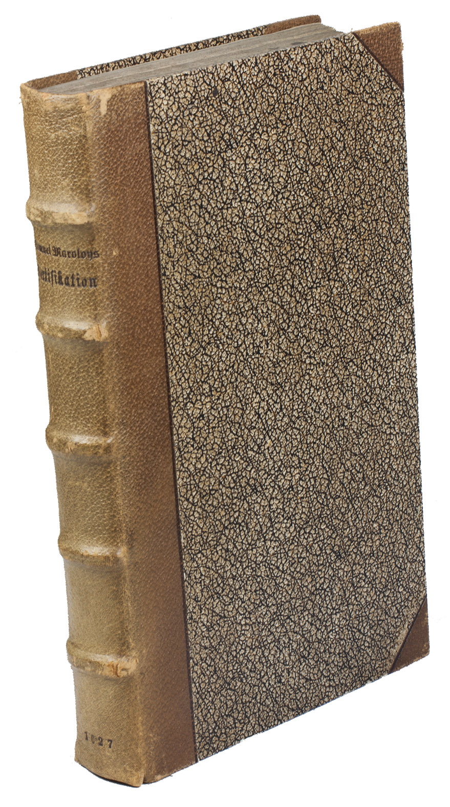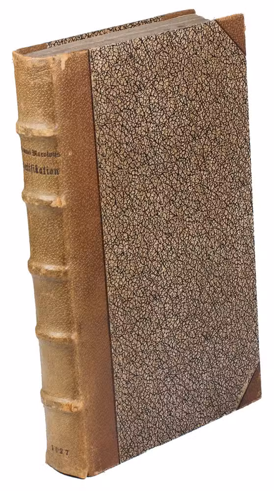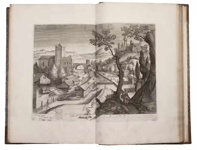 Amsterdam, Johannes Janssonius, 1627. With an engraved title-page with the German title on a letterpress slip, 47 numbered double-page engraved plates. 2 works in 1 volume. Folio. 20th-century half tan leather. Engraved title-page + 111, [1 blank] pp. + a folding table; engraved title-page + 187, [1 blank] pp.