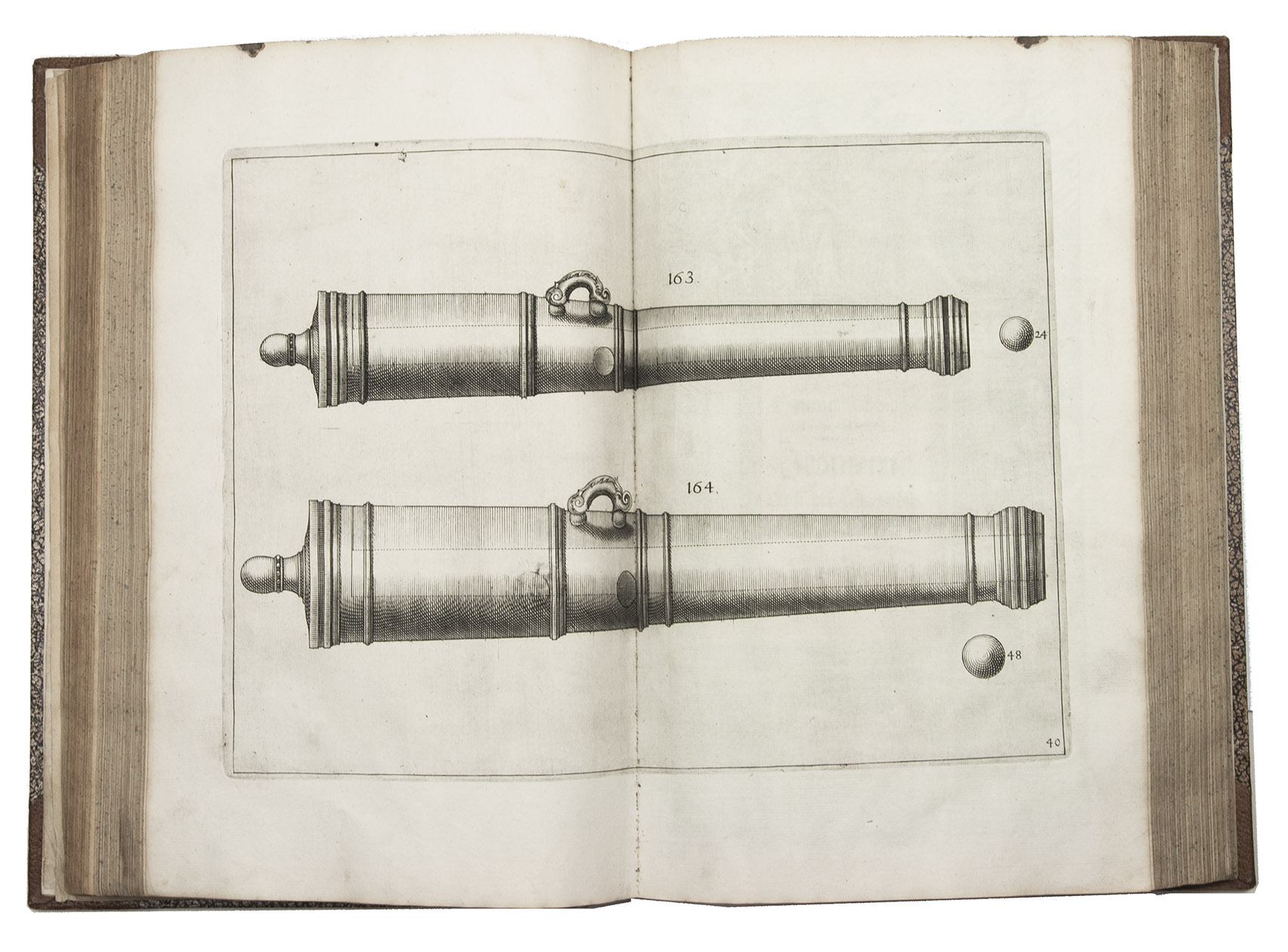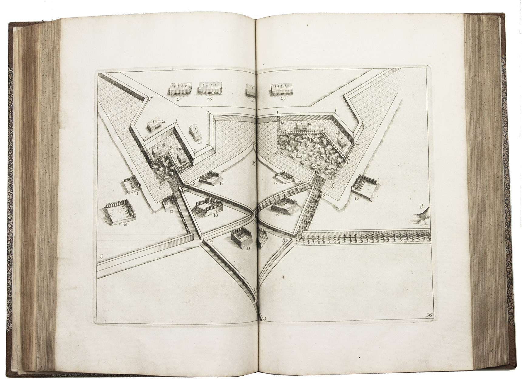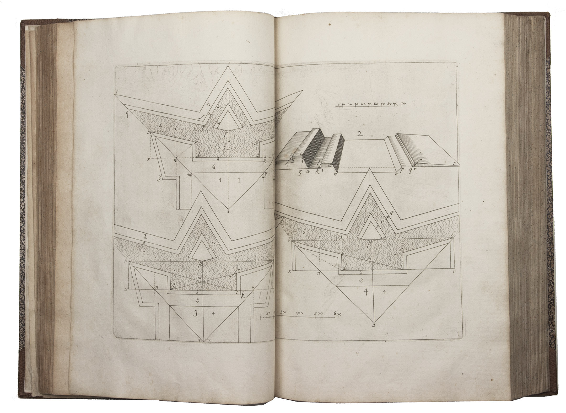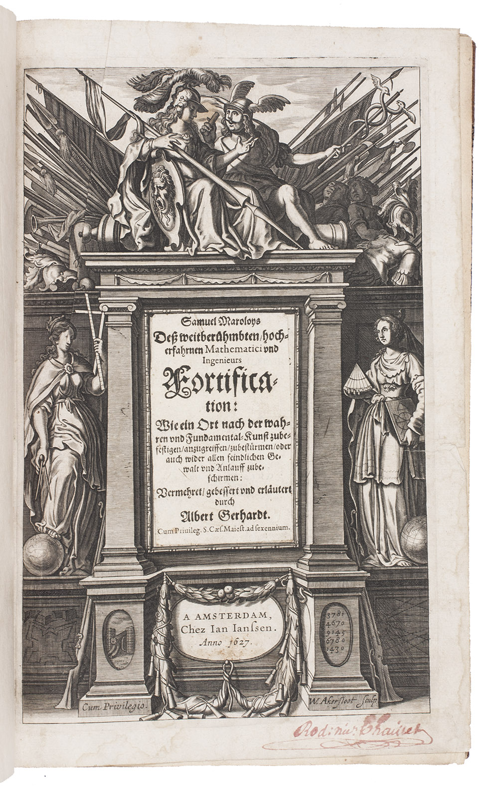 First German edition of the first systematic manual of Dutch fortification, with the accompanying second German edition of a manual of geometry, both by Samuel Marolois (ca. 1572-1626/27), a Dutch military engineer who taught practical mathematics in The Hague, first published in French in 1615 and 1616 but here translated from the French editions of 1627, where Albert Girard for the first time greatly revised and expanded the Fortification. The plates of the Fortification show fortification plans, sections, elevations, perspective (including bird's-eye) views, profiles, etc., as well as building equipment and materials, cannons, and the layout of camps and barracks. Some of the fortification plans are based on real cities, including Coevorden and Oostende. The Geometria covers plane and solid geometry, surveying, mensuration, the making of maps and ground-plans, and fortification. Its plates include surveying instruments, fortification plans and a stunning and detailed view of a town on a waterway in a hilly landscape. A graphic curiosity is the use of a picture of an eye to indicate sighting lines.