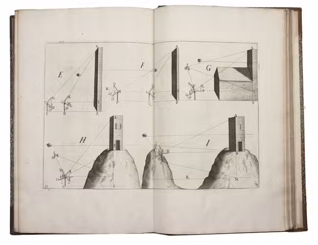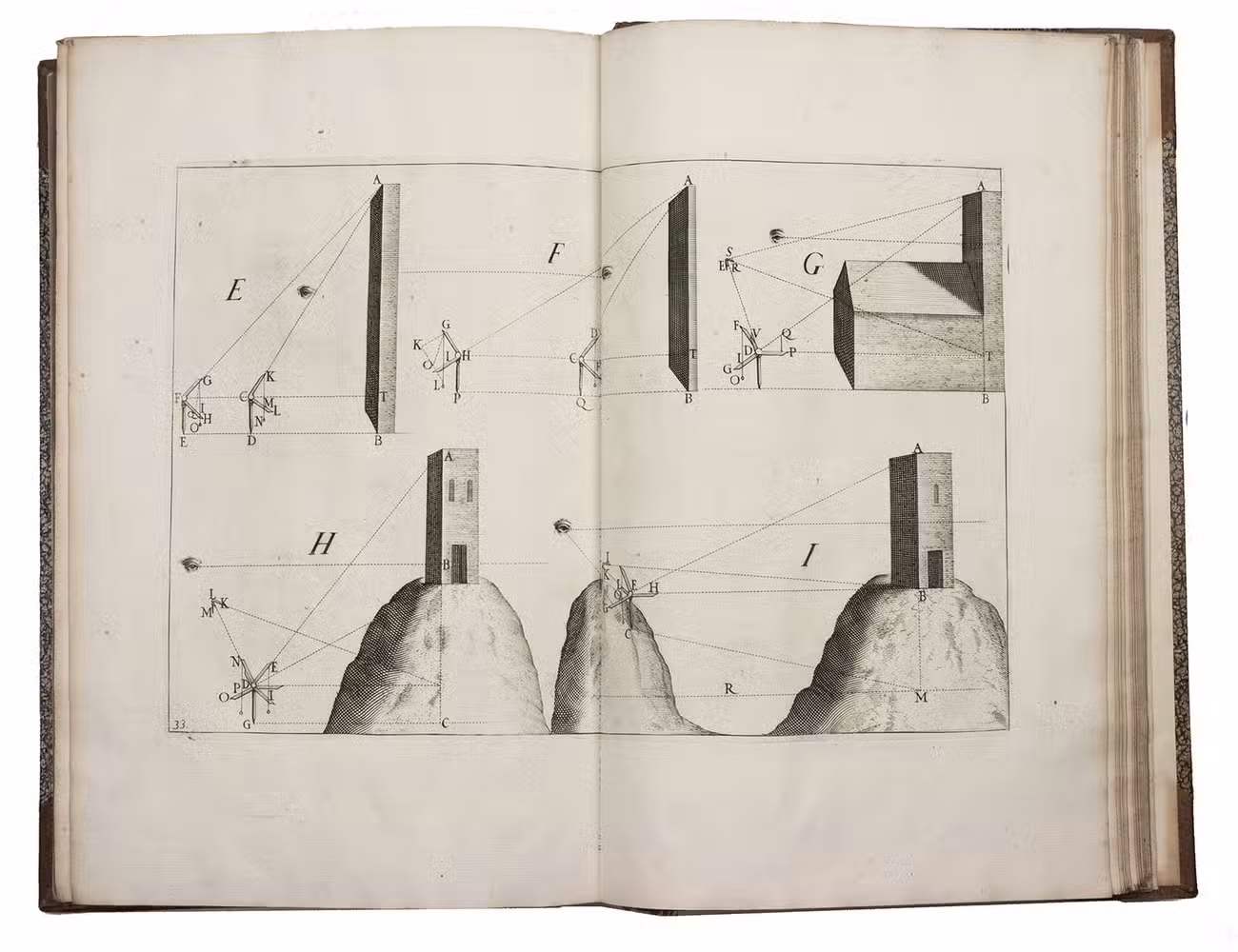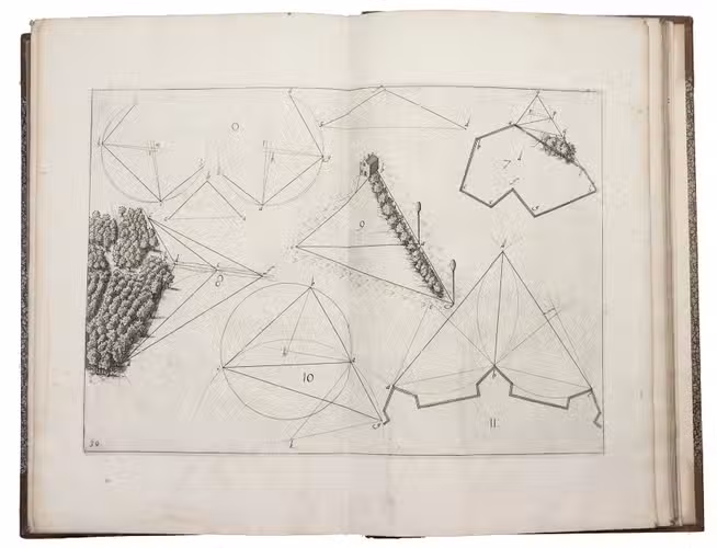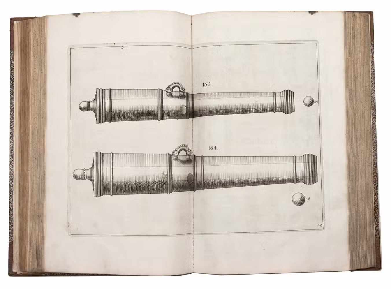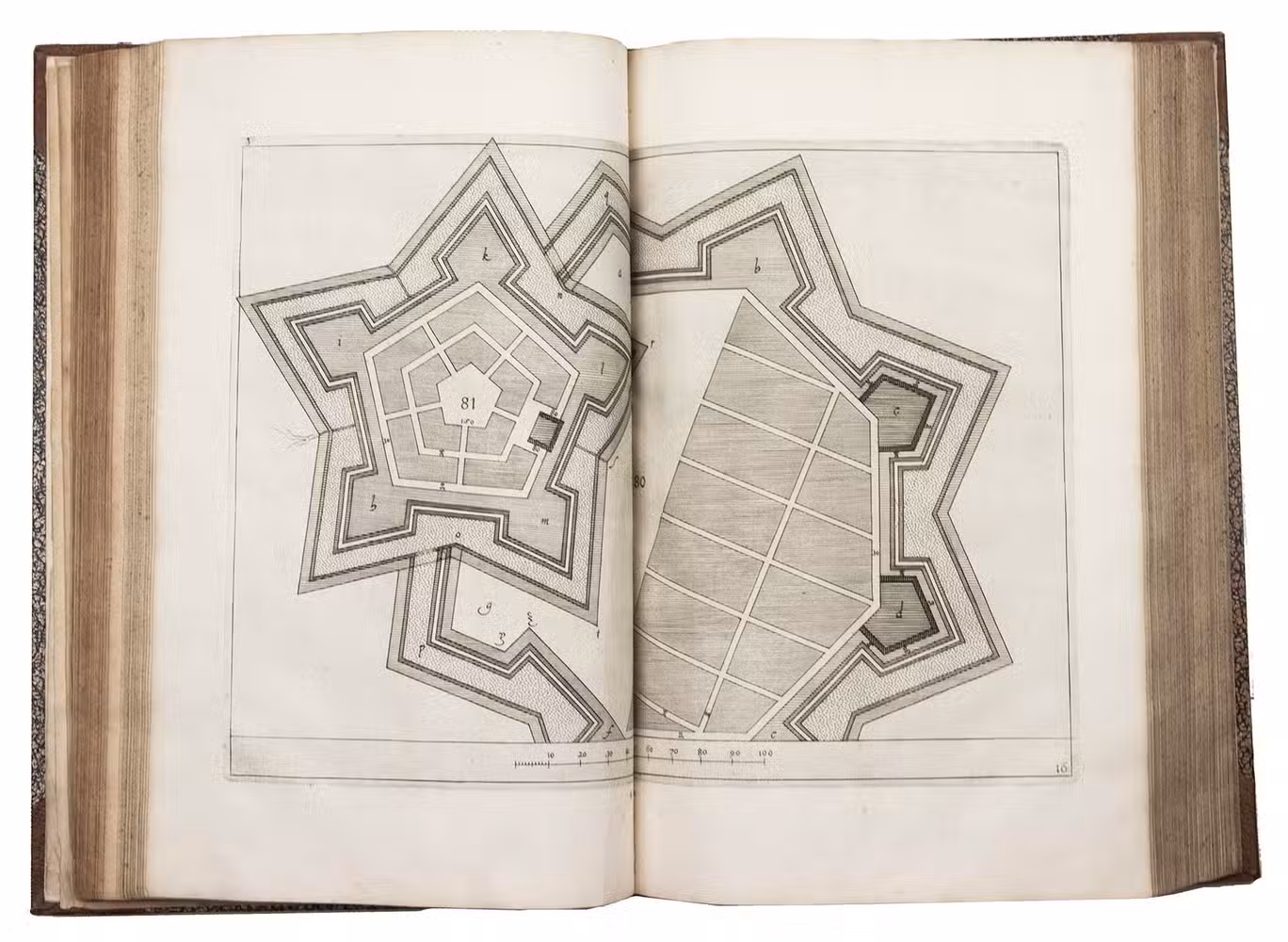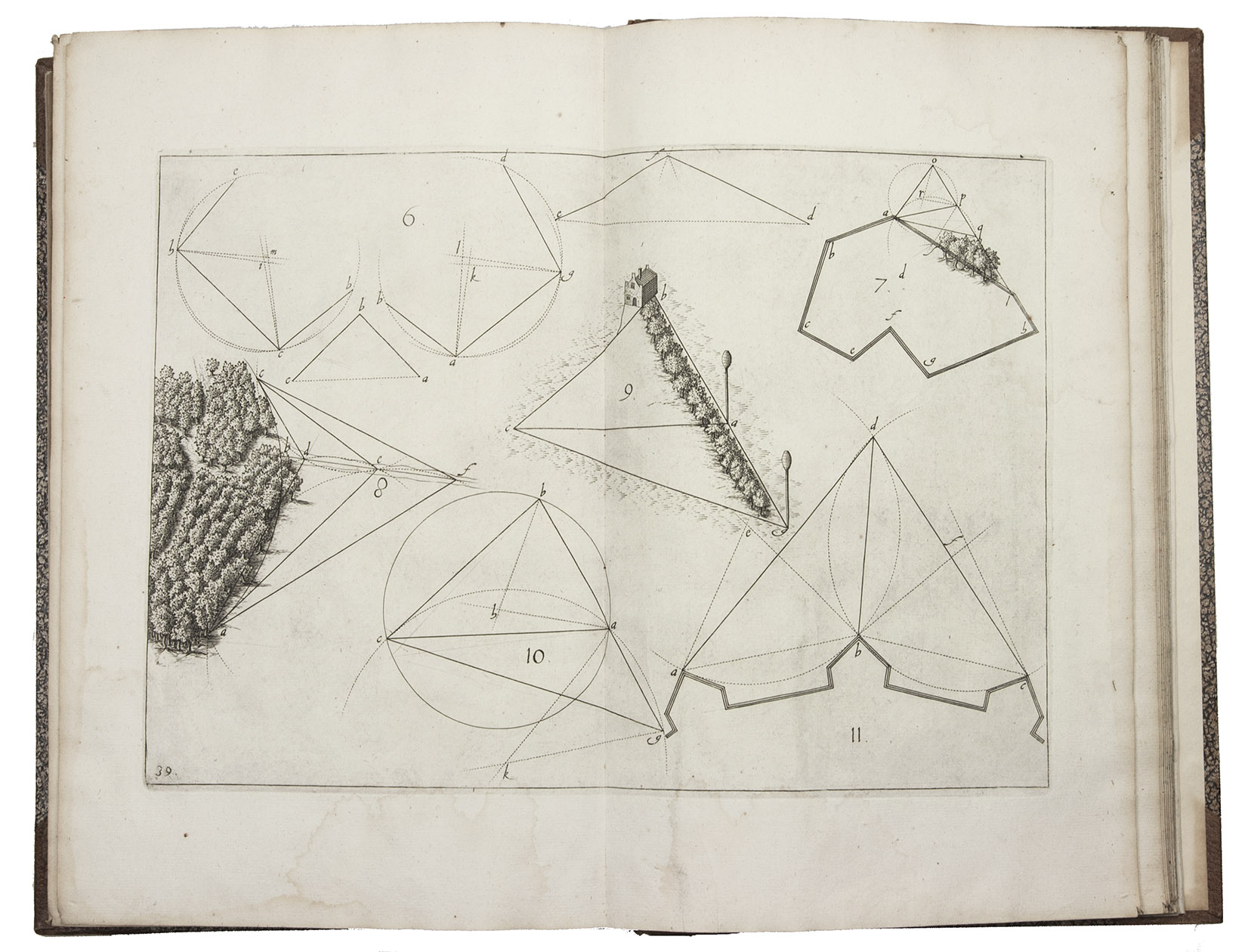 First German edition of the first systematic manual of Dutch fortification, with the accompanying second German edition of a manual of geometry, both by Samuel Marolois (ca. 1572-1626/27), a Dutch military engineer who taught practical mathematics in The Hague, first published in French in 1615 and 1616 but here translated from the French editions of 1627, where Albert Girard for the first time greatly revised and expanded the Fortification. The plates of the Fortification show fortification plans, sections, elevations, perspective (including bird's-eye) views, profiles, etc., as well as building equipment and materials, cannons, and the layout of camps and barracks. Some of the fortification plans are based on real cities, including Coevorden and Oostende. The Geometria covers plane and solid geometry, surveying, mensuration, the making of maps and ground-plans, and fortification. Its plates include surveying instruments, fortification plans and a stunning and detailed view of a town on a waterway in a hilly landscape. A graphic curiosity is the use of a picture of an eye to indicate sighting lines.
