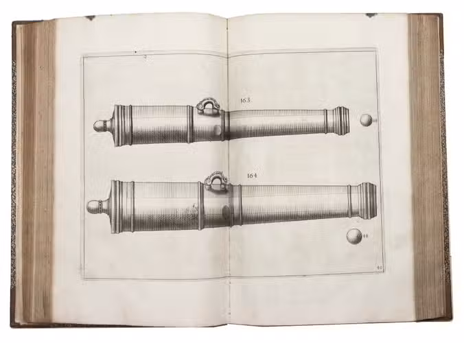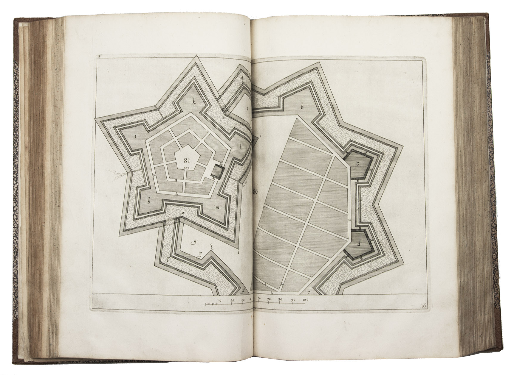 With an old owner's name. With a couple creases and a marginal tear in the first engraved title-page, the letterpress leaves of the first work somewhat browned and occasional mostly marginal water stains (slightly affecting the last three lines of text or the foot of an engraved figure in a few leaves), but still in good condition, most of the plates very good, and with generous margins. Important and very well-illustrated manual of Dutch fortification. Cockle 821; Jordan 2383 & 2385 (5 & 1 copies); STCN (1 copy of each).