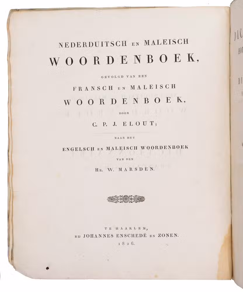 Cornelis Pieter Jacob Elout (1795-1843) further advanced the Malay lexicography. Born in Haarlem, Elout initially prepared for a civilian career, yet his life took a decisive turn when he accompanied his father to Java in 1814. There, he distinguished himself both militarily and administratively. His involvement in quelling uprisings in Cheribon and Palembang earned him the Military William Order (the oldest and hightest honour of the Kingdom of the Netherlands), and he played a decisive role in consolidating Dutch authority over Sumatra and other islands in the region. Under the guidance of Professor Reinwardt, he attained a profound command of High Malay. This linguistic expertise informed his administrative innovations, including the establishment of a Department for Indigenous Affairs, tasked with translating and publishing Malay-language texts, regulating correspondence with local rulers, and overseeing diplomatic missions. His linguistic scholarship culminated in the publication of the work Maleische spraakkunst (1824) and the Dutch-French-Malay dictionary (1825 and 1826), which were both translations and expansions of Marsdens Grammar and dictionary of the Malay language (1812).Marsden himself acknowledged the improvements Elout had made, praising the humility with which these enhancements were incorporated.