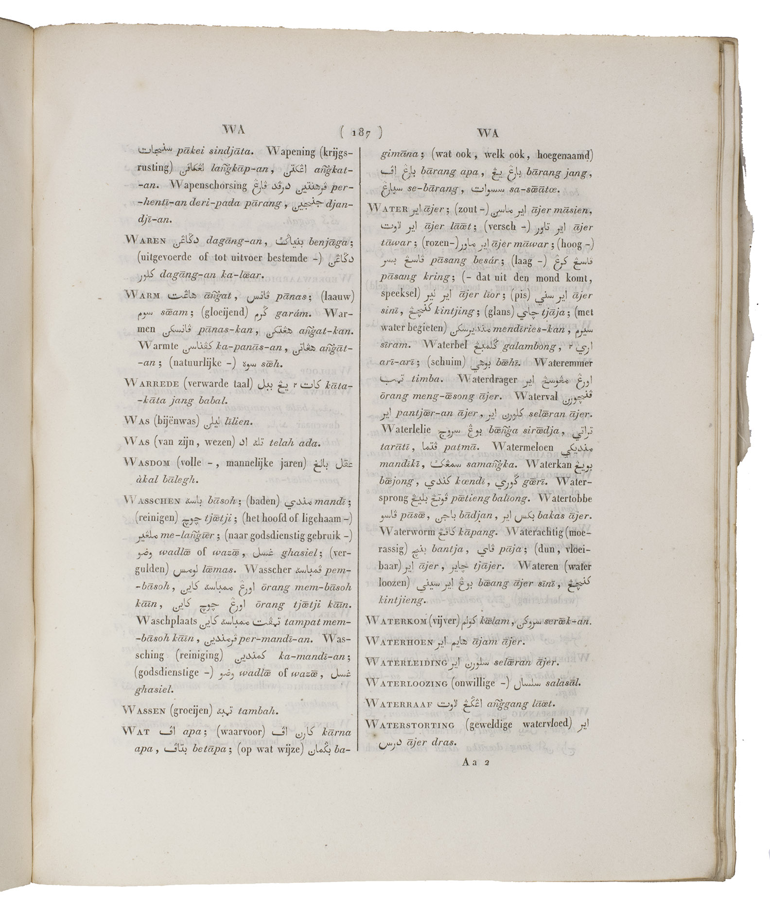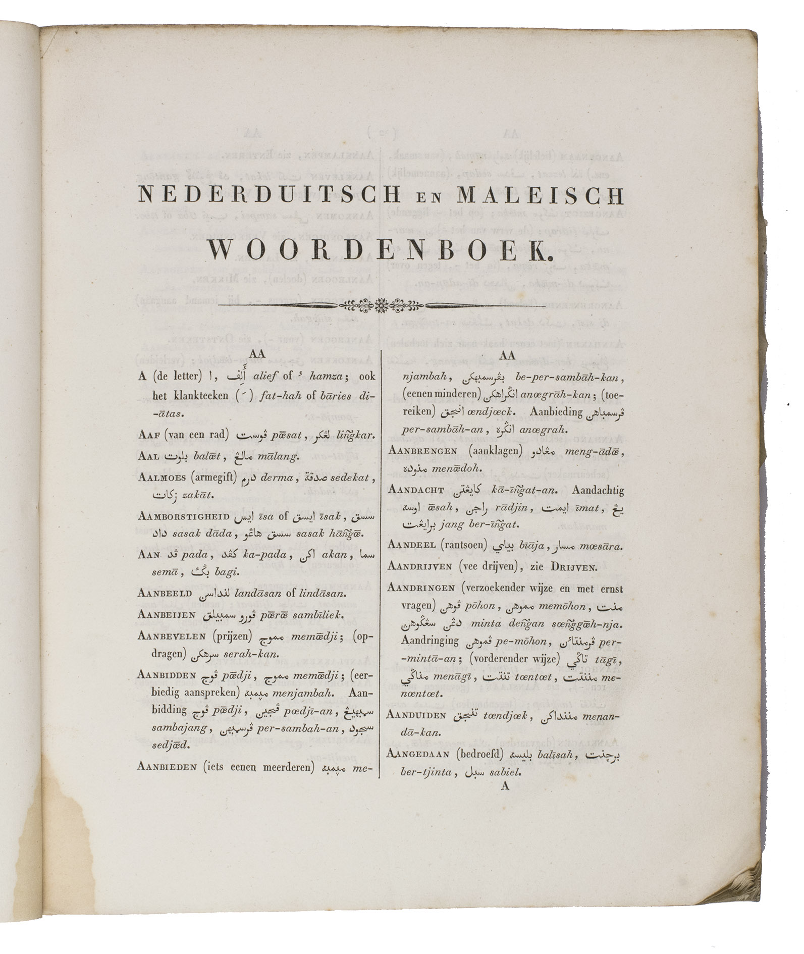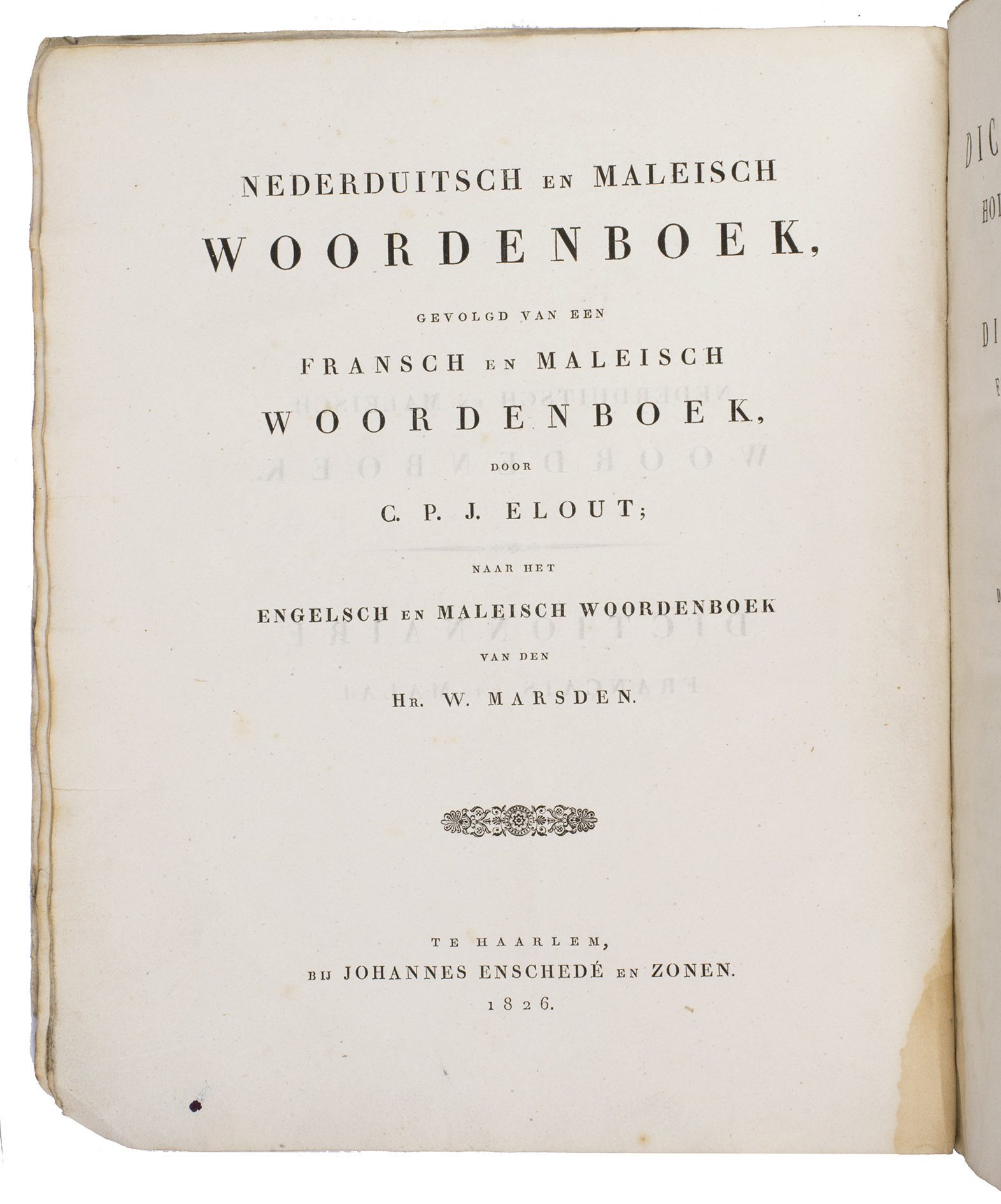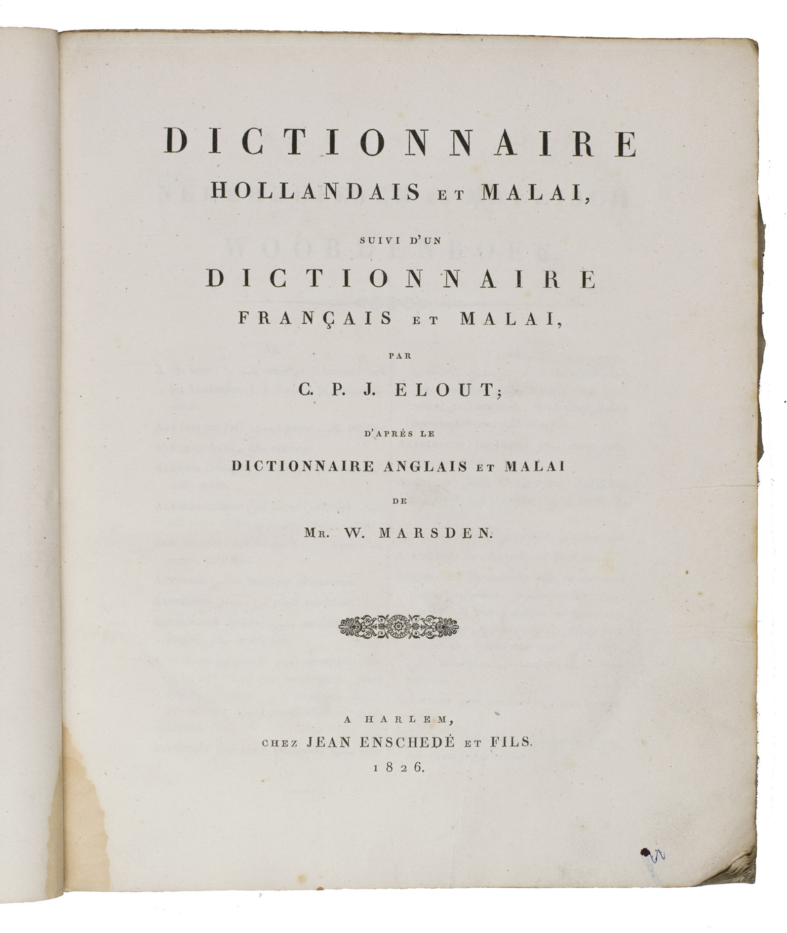 Second edition of a remarkable Dutch-Malay and French-Malay dictionary, partially based on and translated from William Marsdens famous English-Malay dictionary, and is otherwise compiled by Cornelis Pieter Jacob Elout. The Malay words are given in both Jawi script and phonetic transcription in italics, the Dutch and French words are given in roman script. 1825 as Maleisch, Nederduitsch en Fransch woordenboek ... | Dictionnaire Malai, Hollandais et Français ... also by Johannes Enschedé and sons. Elout based his work on the foundational English-Malay dictionary of the British linguist William Marsden (1754-1836), whose pioneering work on the Malay language was an essential tool for the British East India Company in the Malay Archipelago. At the time of publication, both Dutch and French were official languages in the Netherlands, thus explaining the work being bilingual and having both a Dutch and a French title page.