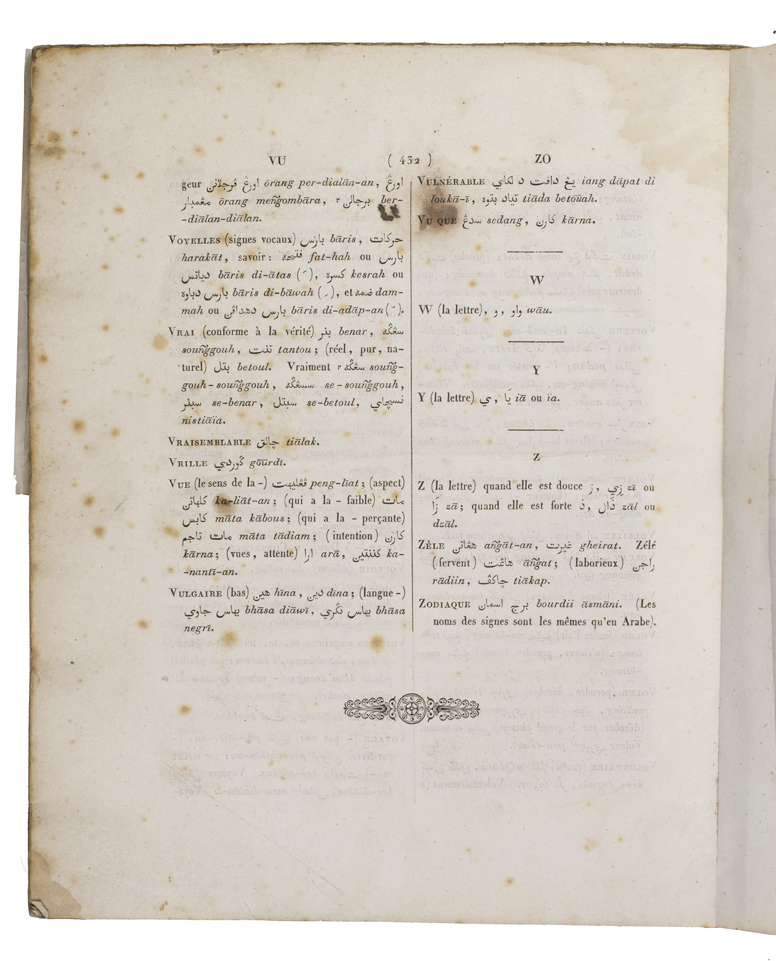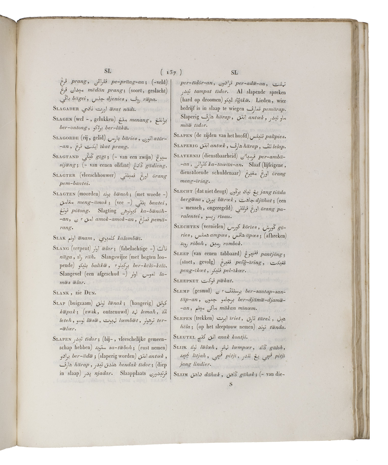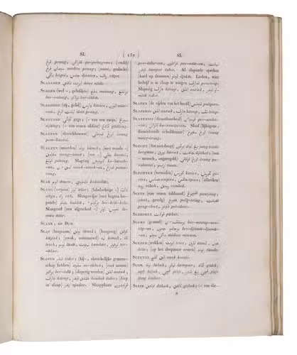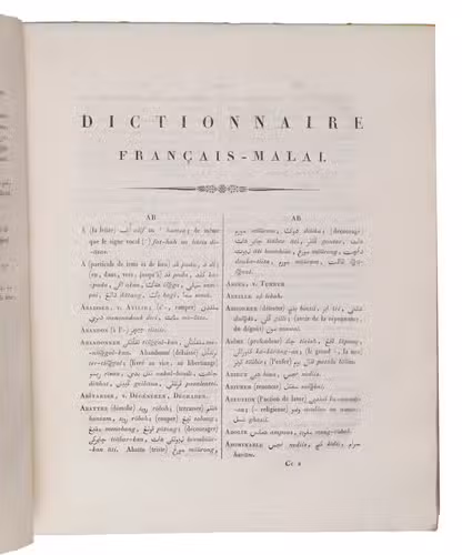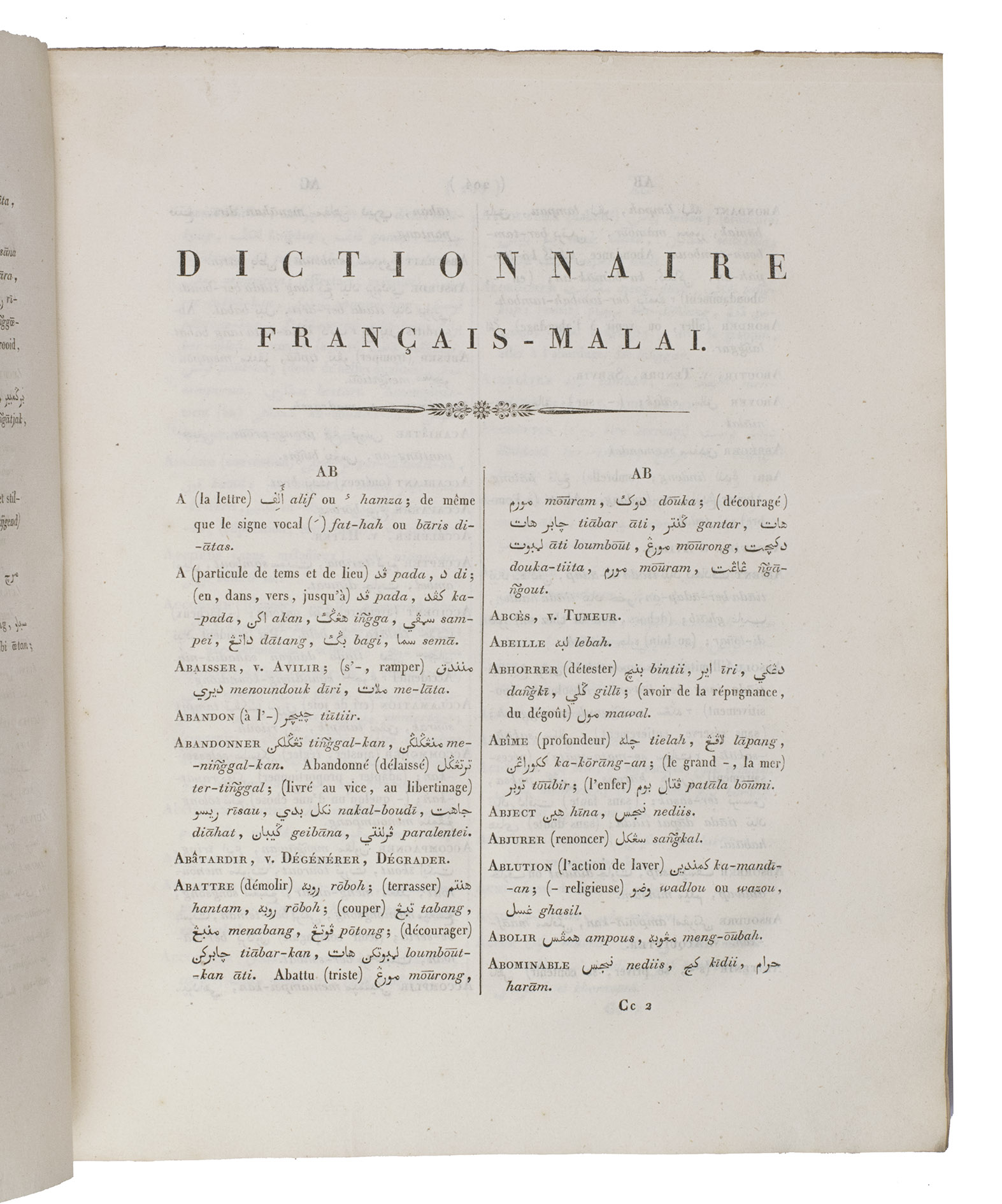 Second edition of a remarkable Dutch-Malay and French-Malay dictionary, partially based on and translated from William Marsdens famous English-Malay dictionary, and is otherwise compiled by Cornelis Pieter Jacob Elout. The Malay words are given in both Jawi script and phonetic transcription in italics, the Dutch and French words are given in roman script. 1825 as Maleisch, Nederduitsch en Fransch woordenboek ... | Dictionnaire Malai, Hollandais et Français ... also by Johannes Enschedé and sons. Elout based his work on the foundational English-Malay dictionary of the British linguist William Marsden (1754-1836), whose pioneering work on the Malay language was an essential tool for the British East India Company in the Malay Archipelago. At the time of publication, both Dutch and French were official languages in the Netherlands, thus explaining the work being bilingual and having both a Dutch and a French title page.