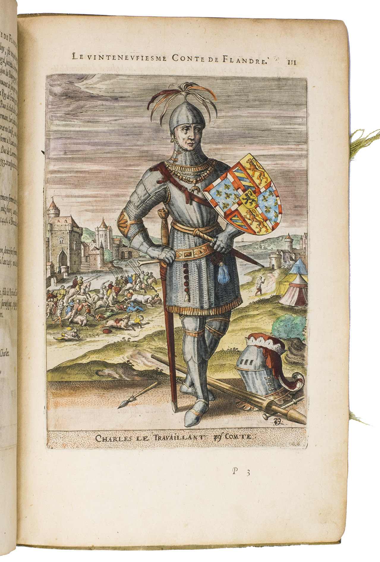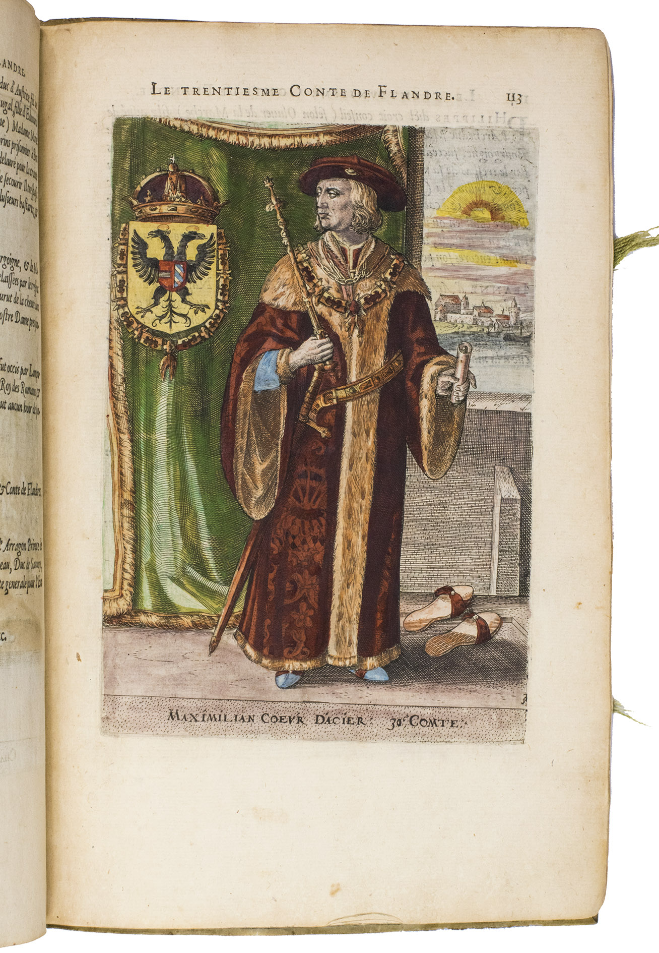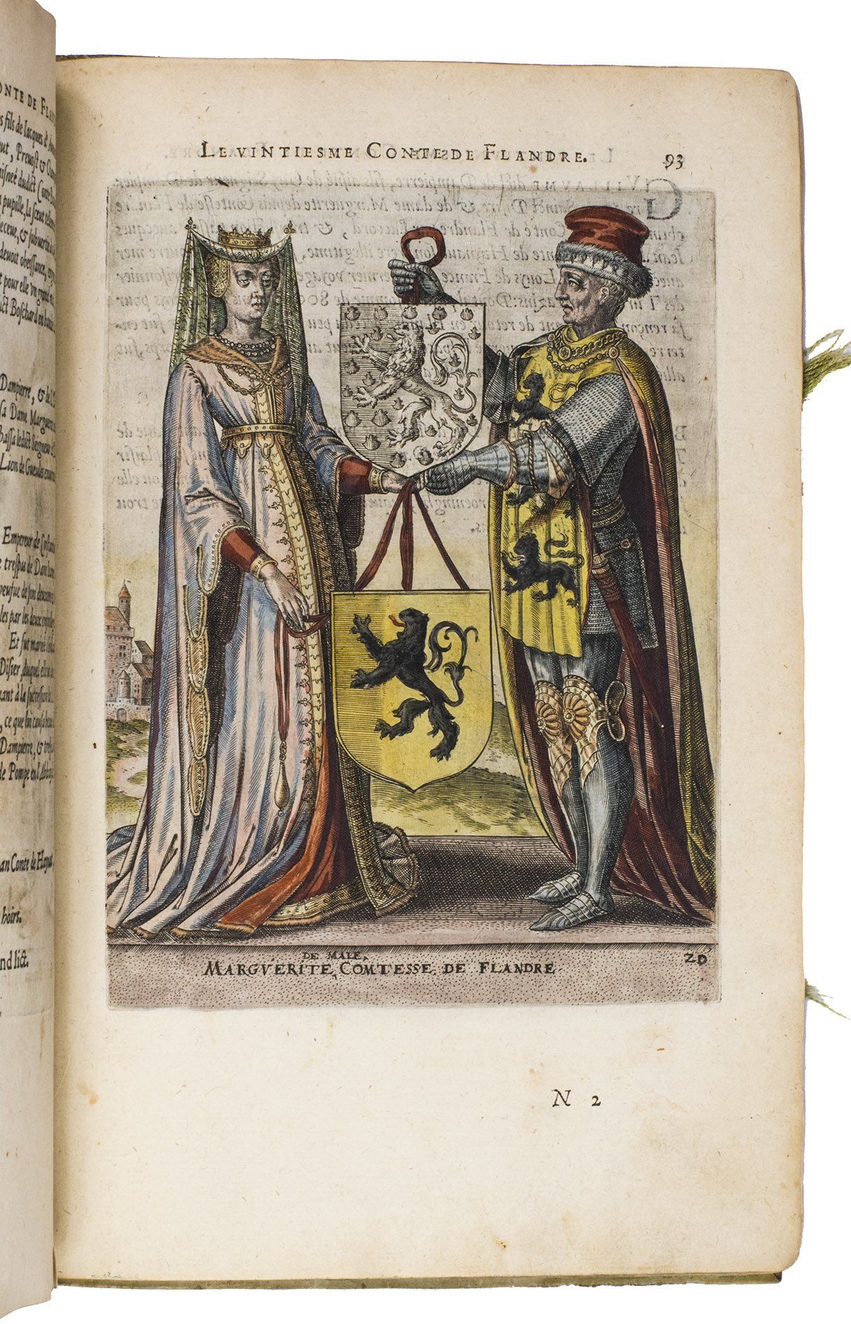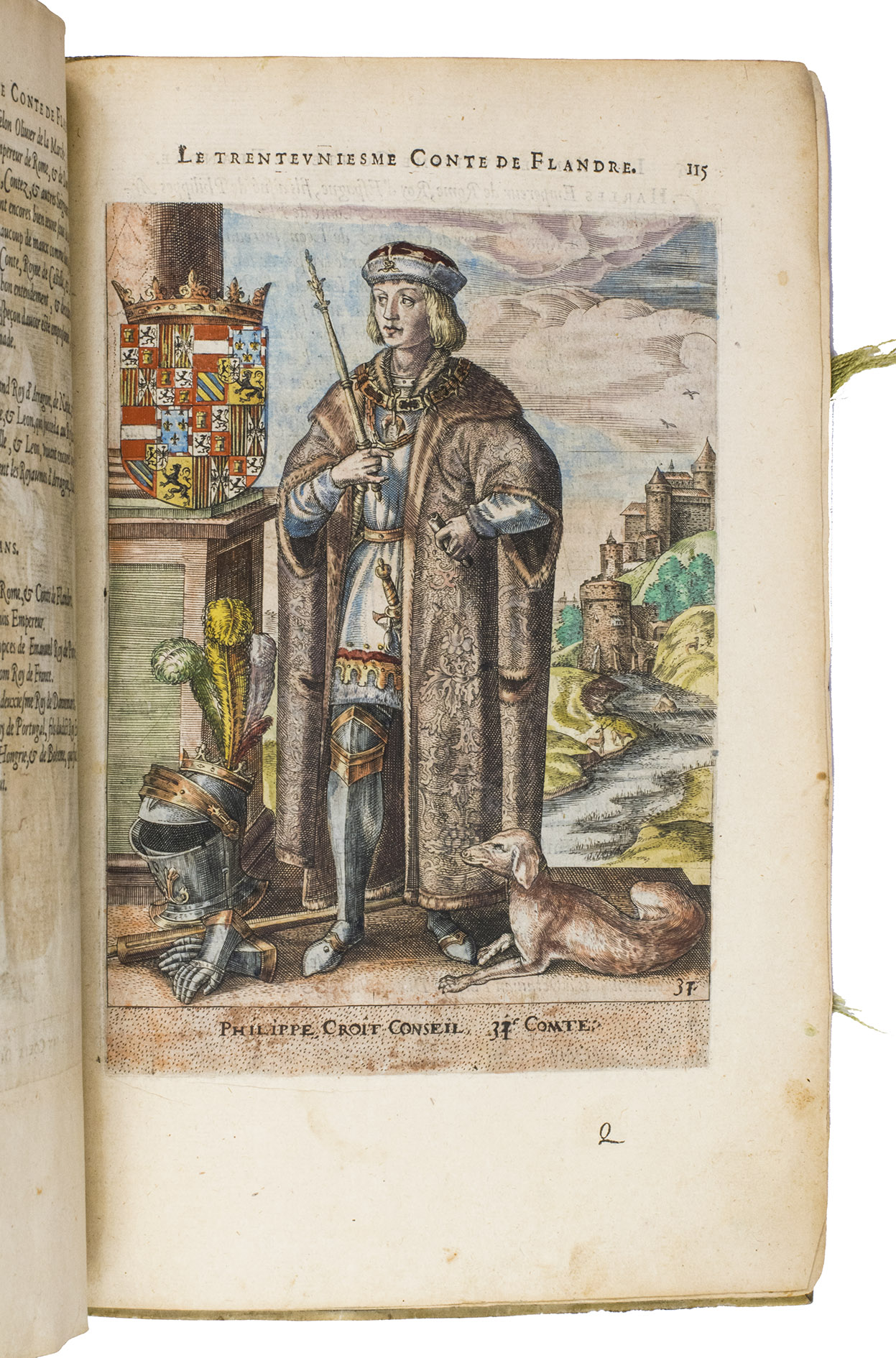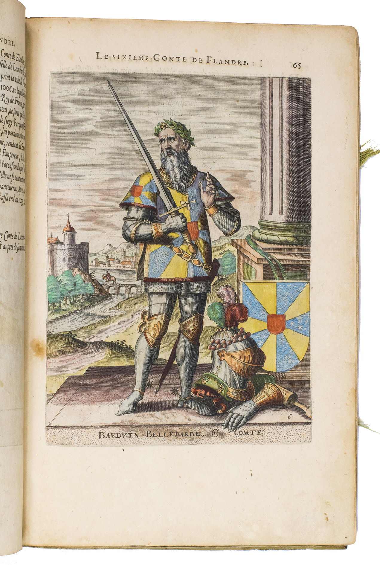 Antwerp, (colophon: Andre Bax for) Pierre Balthasar (also known as Pieter Balten), [1580]. Folio. With an engraved title-page, a full-page engraved plate with the dedication, a full-page engraved plate showing the coats-of-arms of the Foresters of Flanders and the counts of Flanders and a map of Flanders, a full-page engraving showing verse below an allegorical scene of death, 40 full-page engraved portraits of the Foresters and Counts of Flanders, 30 small coats-of-arms in the text, and numerous woodcut decorated initials. All illustrations (except for the initials) are expertly coloured by hand. Contemporary parchment, sewn on 4 supports laced through the joints, with remnants of green closing ties. [6], 119, [2], [1 blank] pp.