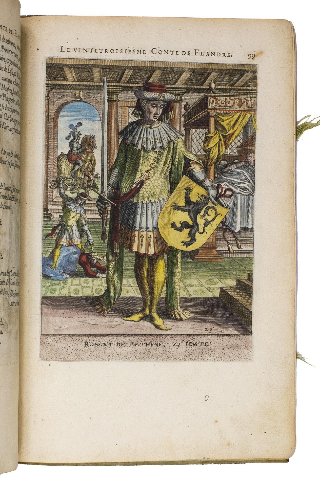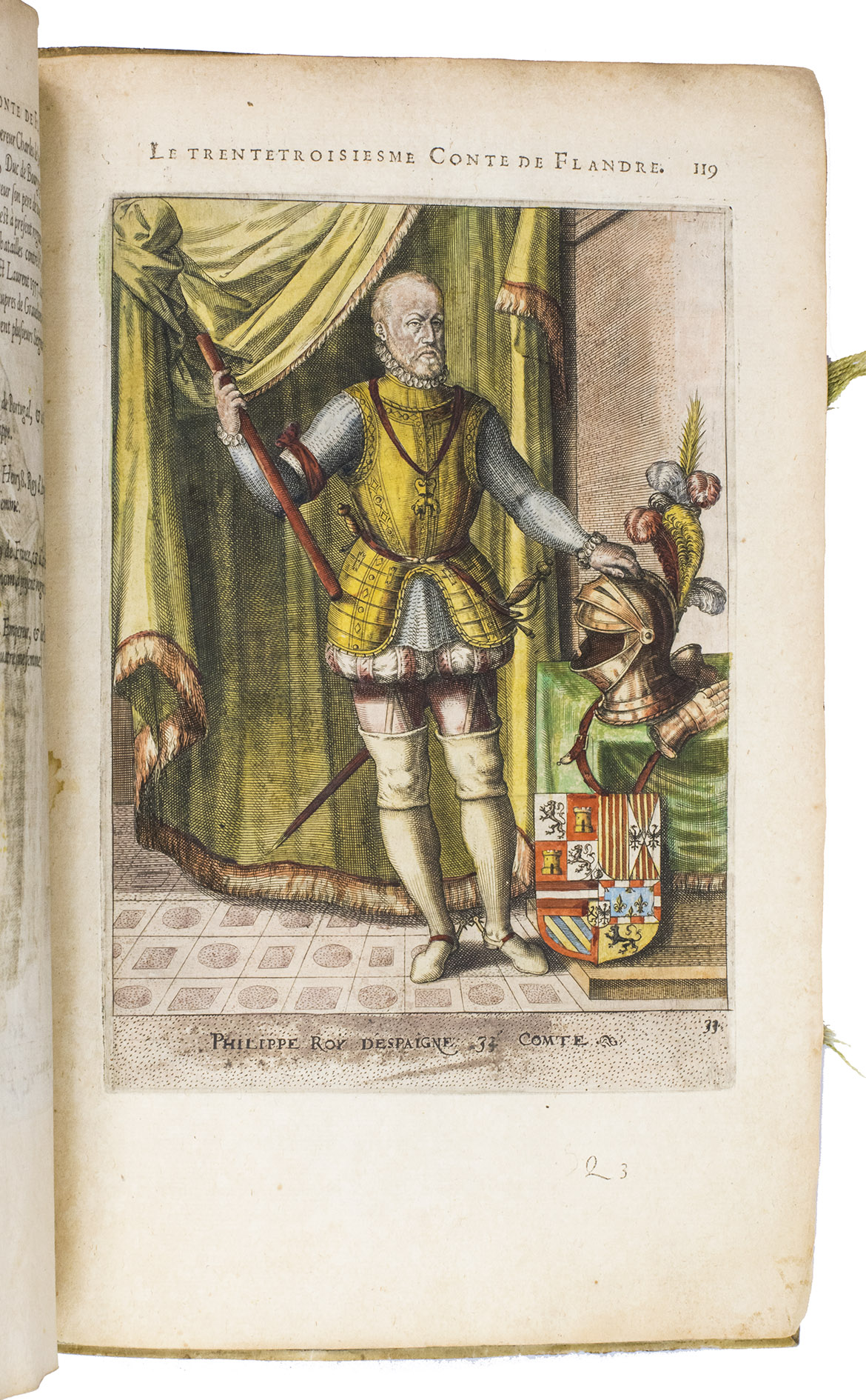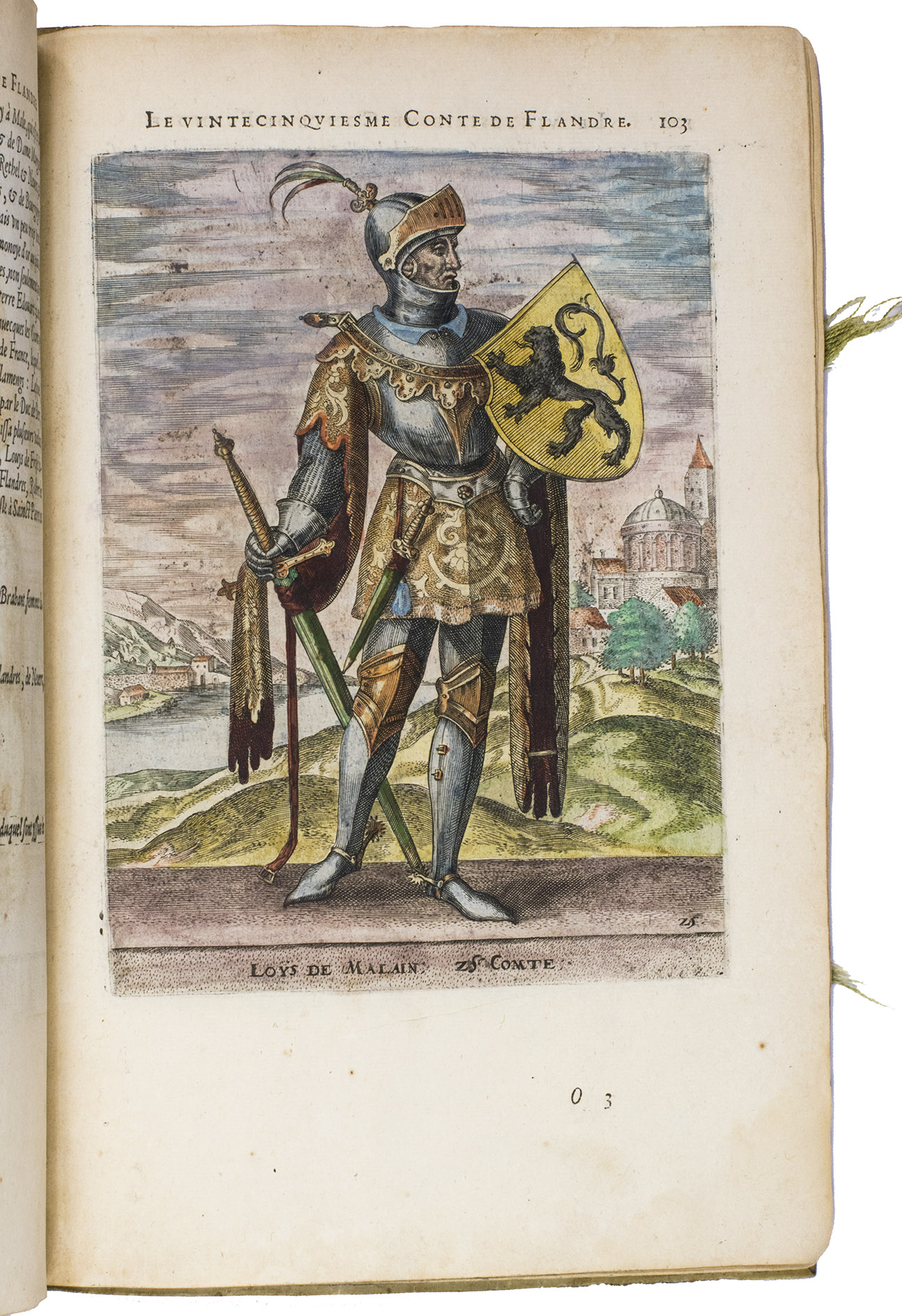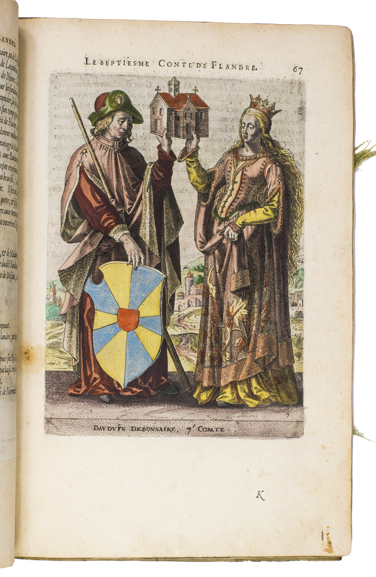 Antwerp, (colophon: Andre Bax for) Pierre Balthasar (also known as Pieter Balten), [1580]. Folio. With an engraved title-page, a full-page engraved plate with the dedication, a full-page engraved plate showing the coats-of-arms of the Foresters of Flanders and the counts of Flanders and a map of Flanders, a full-page engraving showing verse below an allegorical scene of death, 40 full-page engraved portraits of the Foresters and Counts of Flanders, 30 small coats-of-arms in the text, and numerous woodcut decorated initials. All illustrations (except for the initials) are expertly coloured by hand. Contemporary parchment, sewn on 4 supports laced through the joints, with remnants of green closing ties. [6], 119, [2], [1 blank] pp.