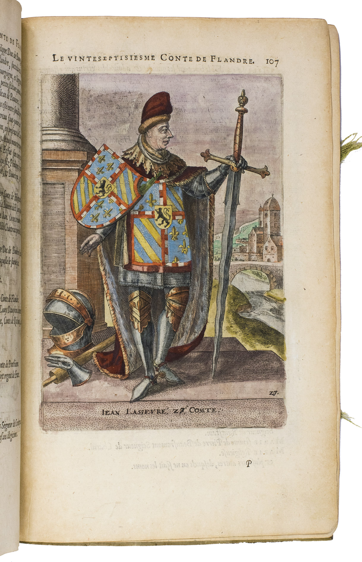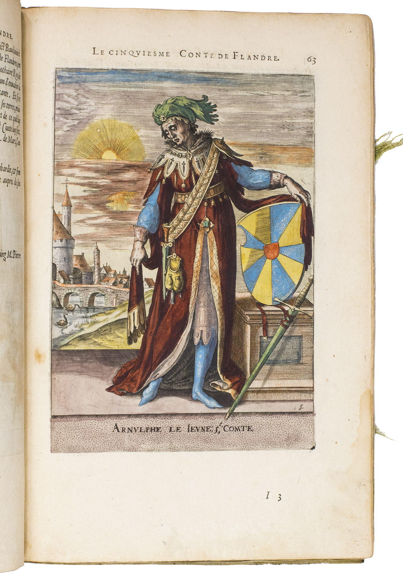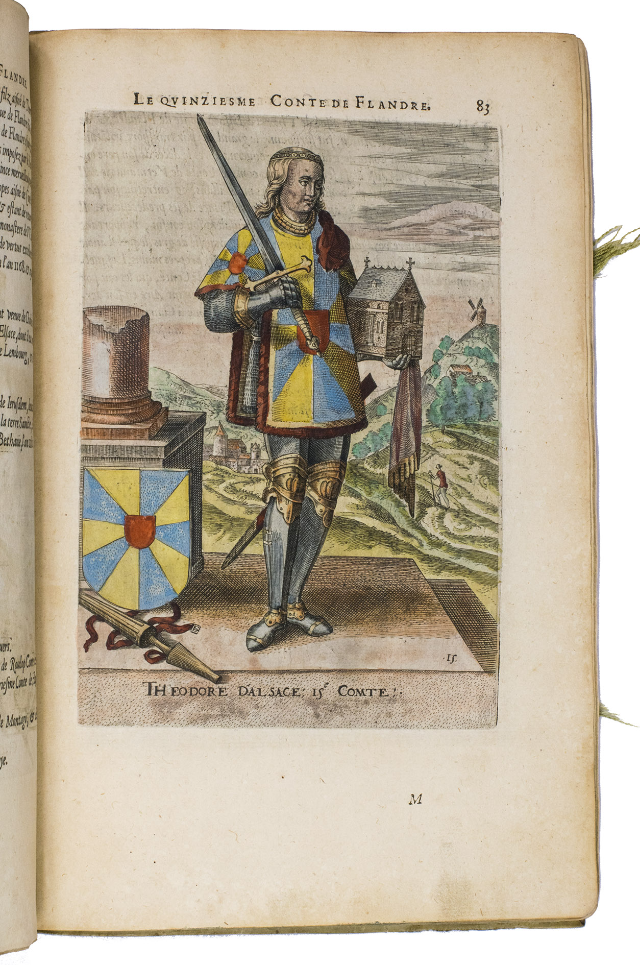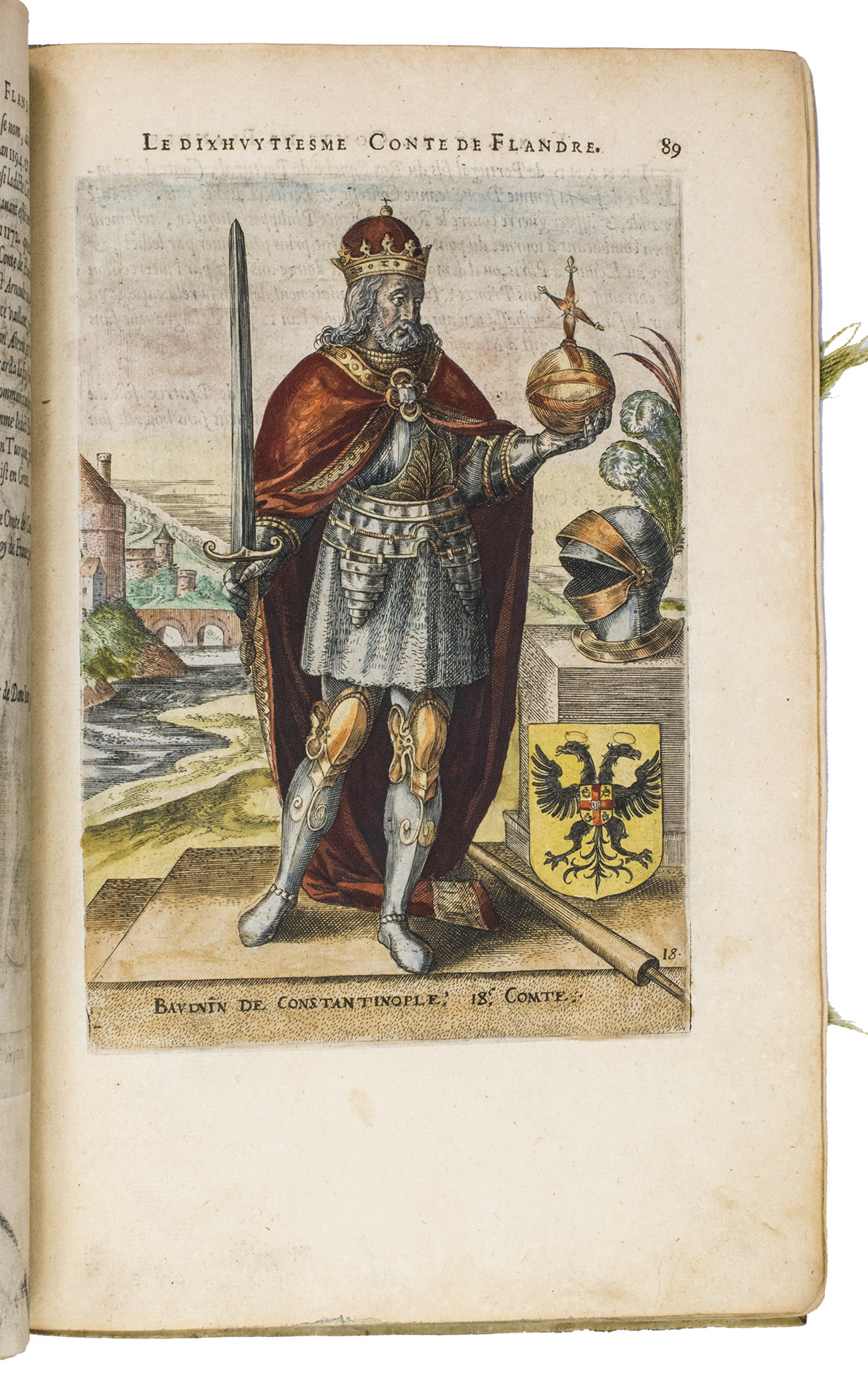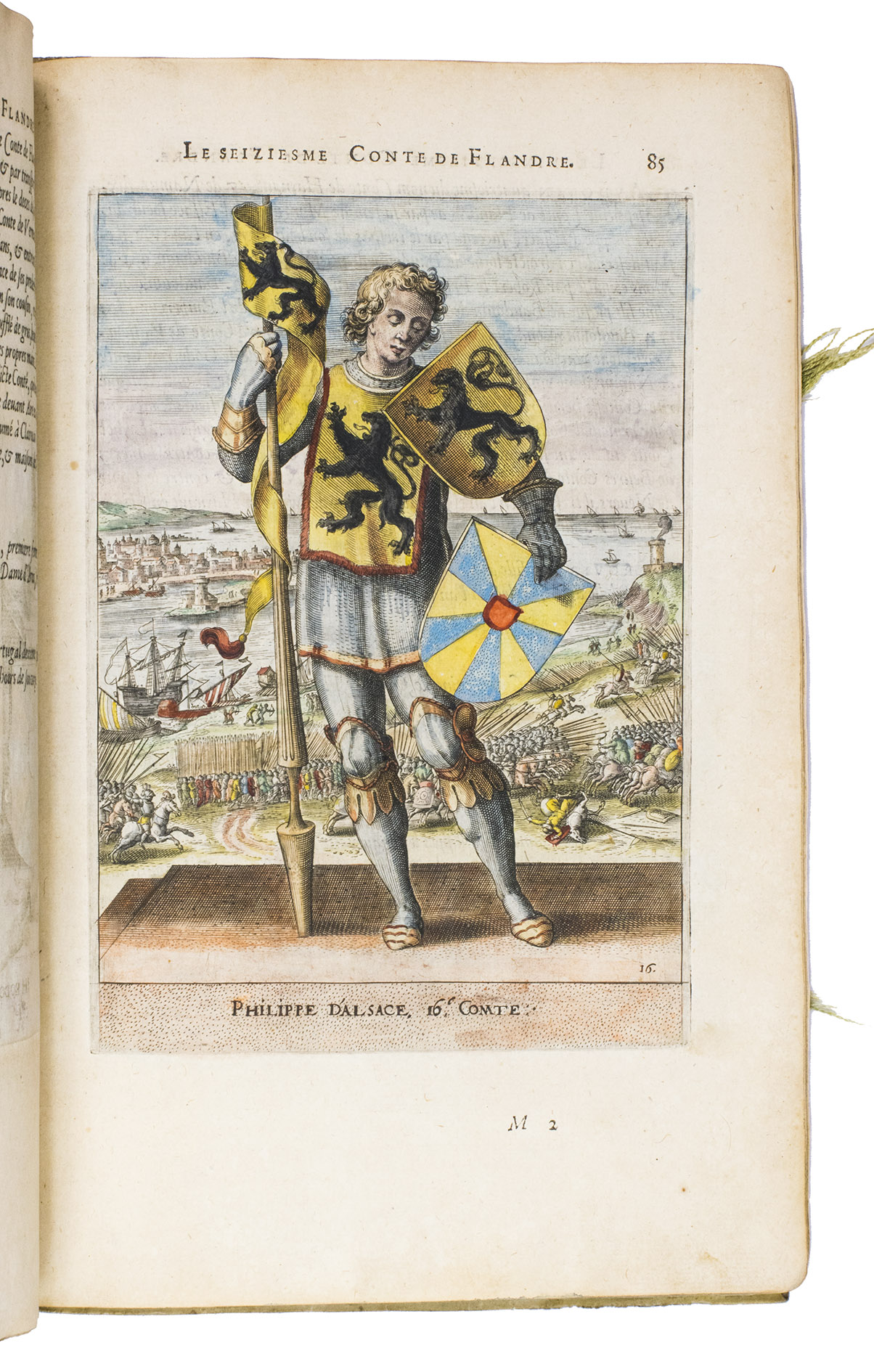 Antwerp, (colophon: Andre Bax for) Pierre Balthasar (also known as Pieter Balten), [1580]. Folio. With an engraved title-page, a full-page engraved plate with the dedication, a full-page engraved plate showing the coats-of-arms of the Foresters of Flanders and the counts of Flanders and a map of Flanders, a full-page engraving showing verse below an allegorical scene of death, 40 full-page engraved portraits of the Foresters and Counts of Flanders, 30 small coats-of-arms in the text, and numerous woodcut decorated initials. All illustrations (except for the initials) are expertly coloured by hand. Contemporary parchment, sewn on 4 supports laced through the joints, with remnants of green closing ties. [6], 119, [2], [1 blank] pp.