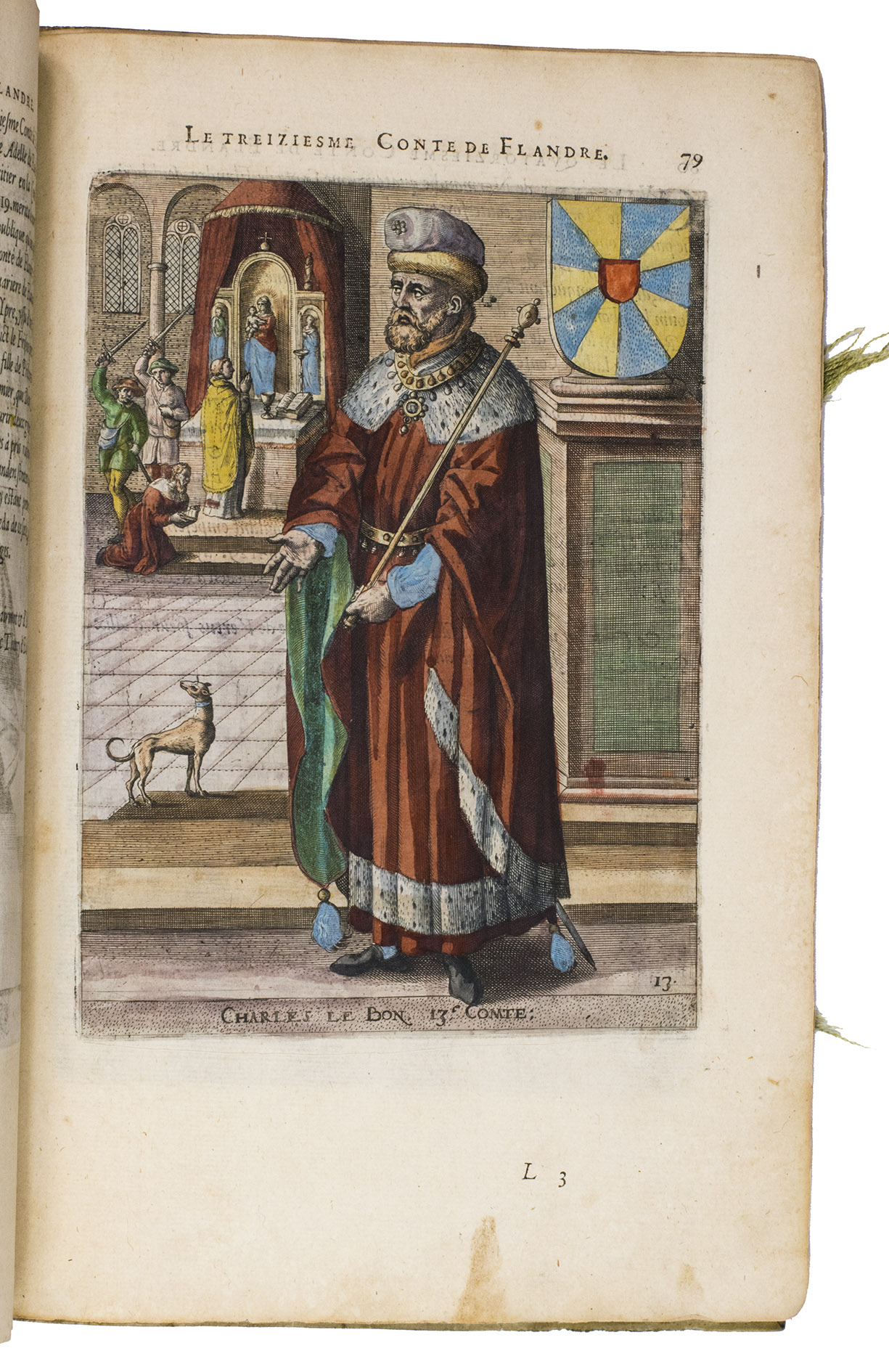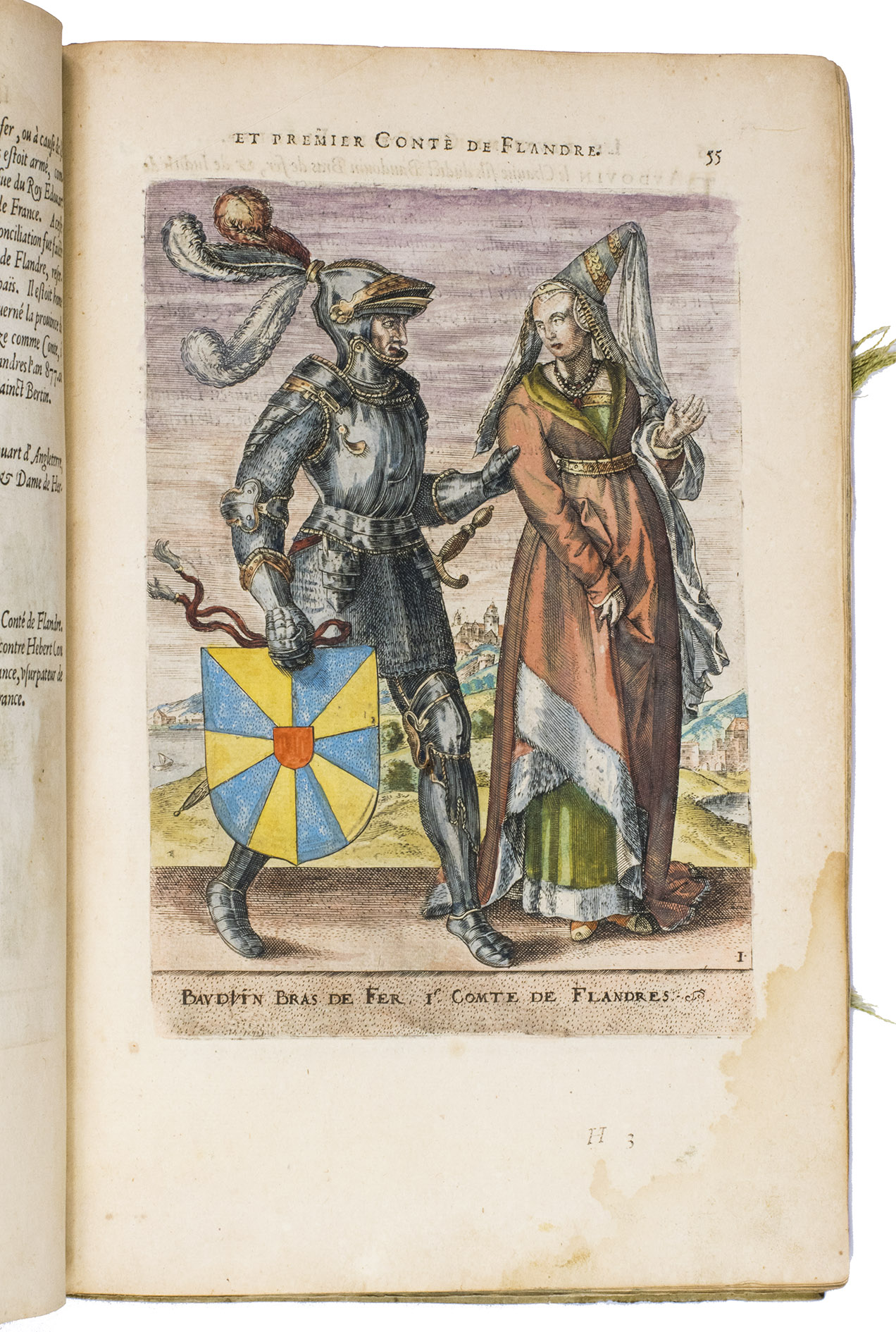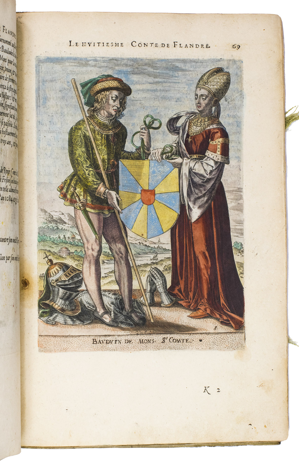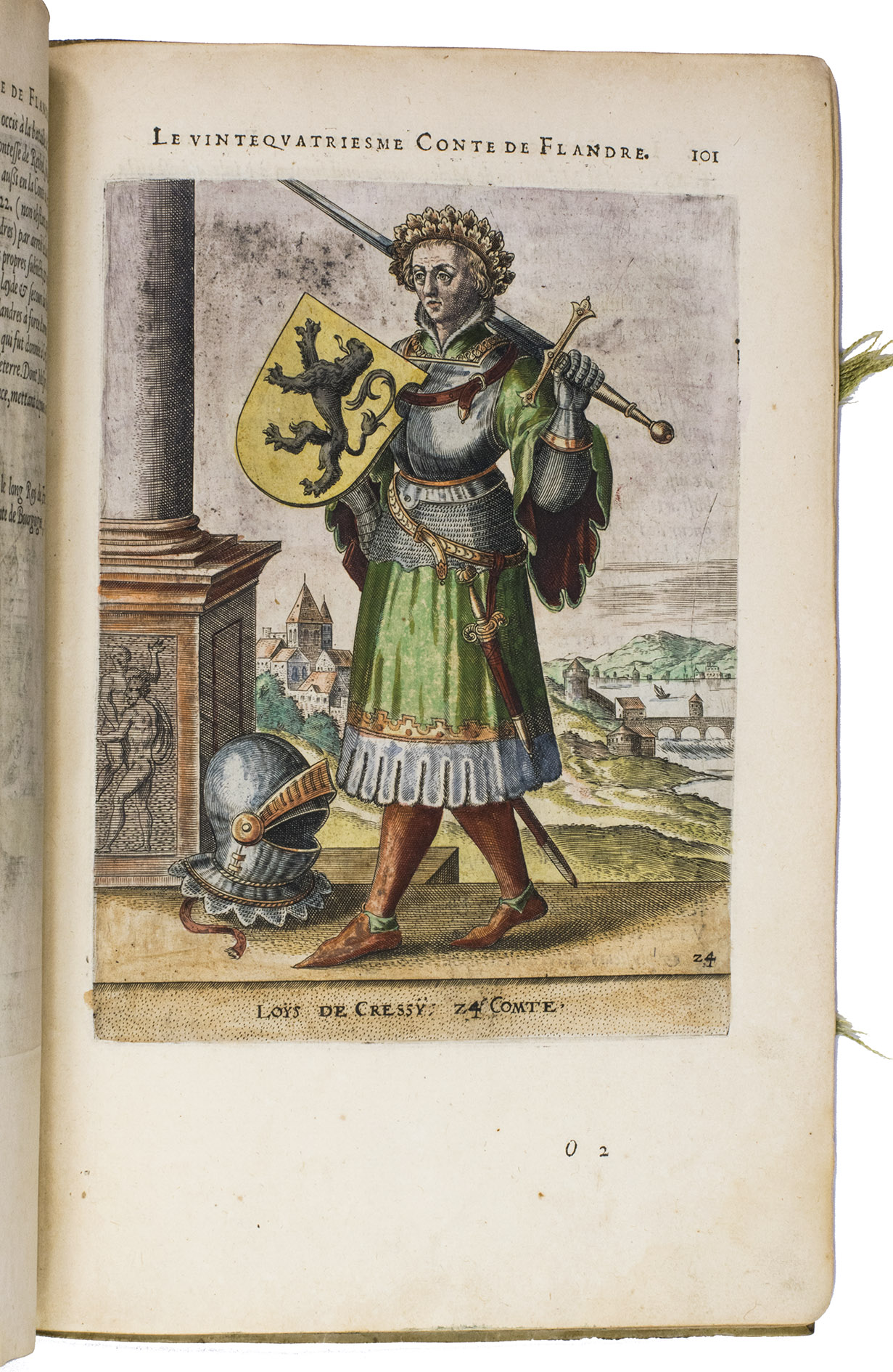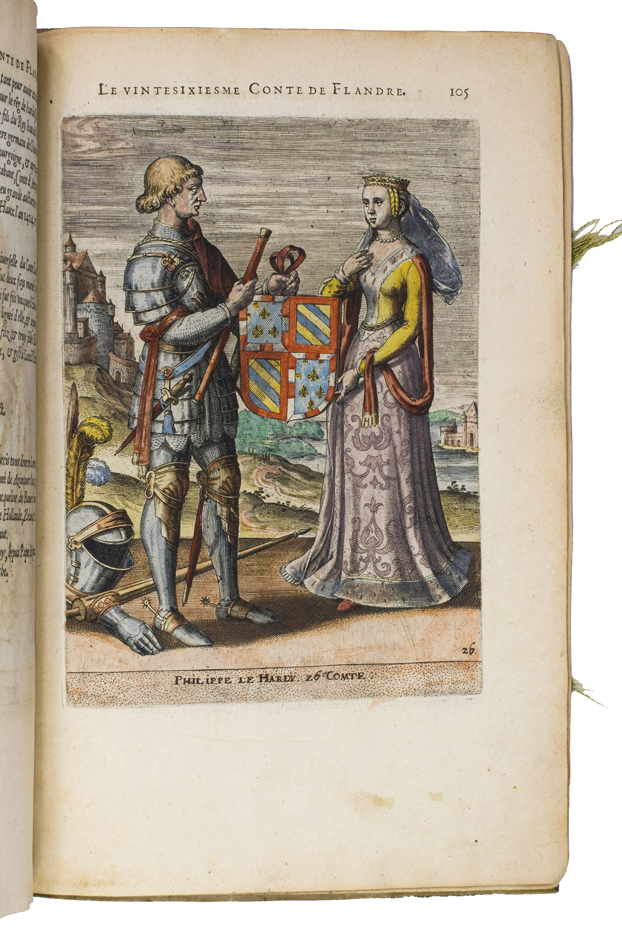 Antwerp, (colophon: Andre Bax for) Pierre Balthasar (also known as Pieter Balten), [1580]. Folio. With an engraved title-page, a full-page engraved plate with the dedication, a full-page engraved plate showing the coats-of-arms of the Foresters of Flanders and the counts of Flanders and a map of Flanders, a full-page engraving showing verse below an allegorical scene of death, 40 full-page engraved portraits of the Foresters and Counts of Flanders, 30 small coats-of-arms in the text, and numerous woodcut decorated initials. All illustrations (except for the initials) are expertly coloured by hand. Contemporary parchment, sewn on 4 supports laced through the joints, with remnants of green closing ties. [6], 119, [2], [1 blank] pp.