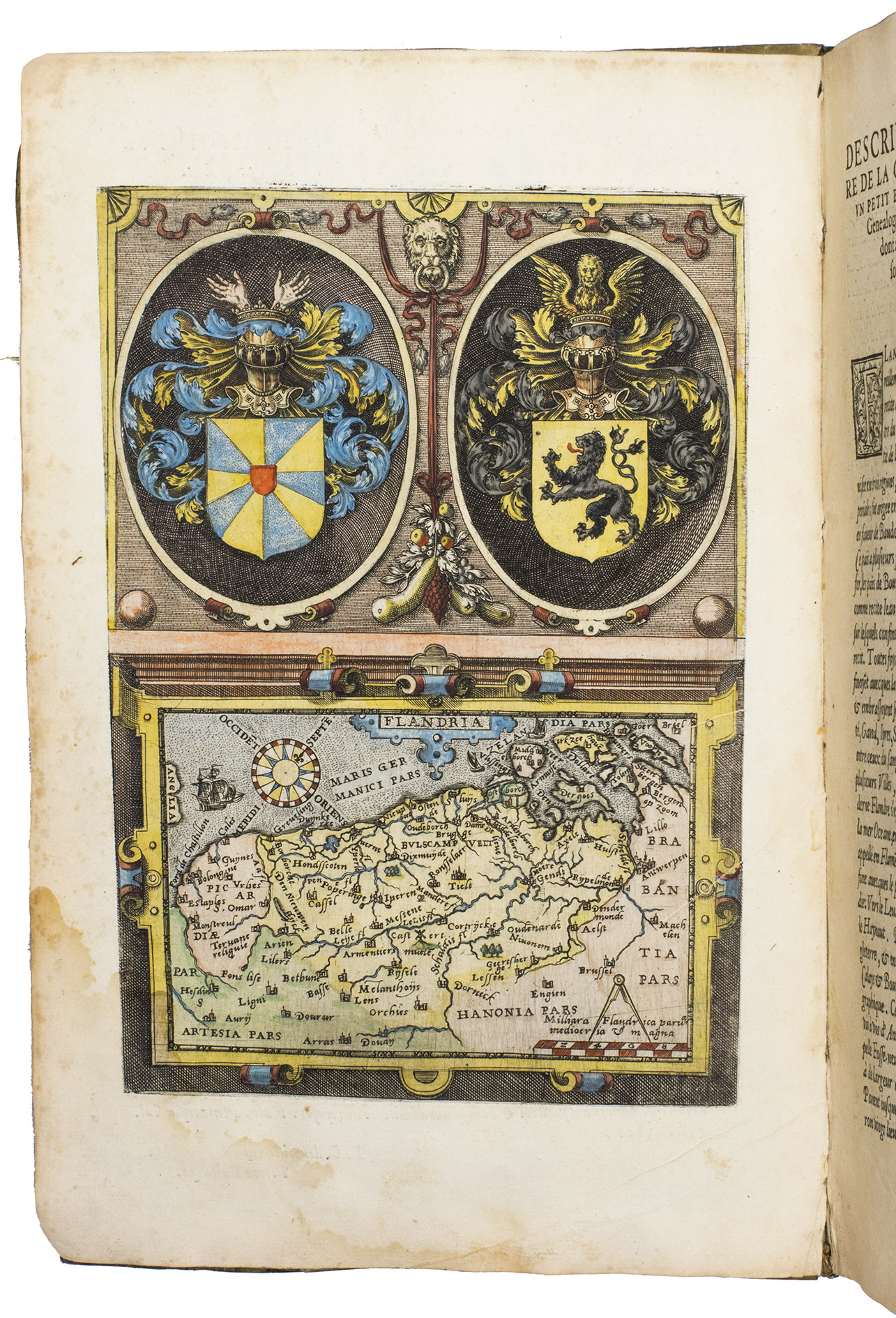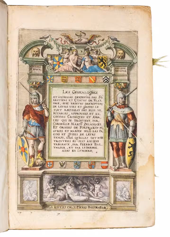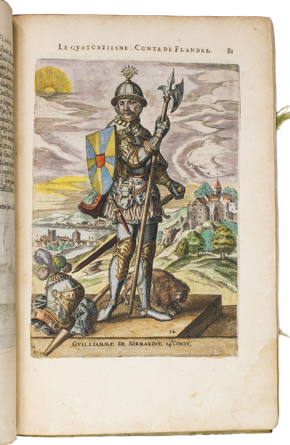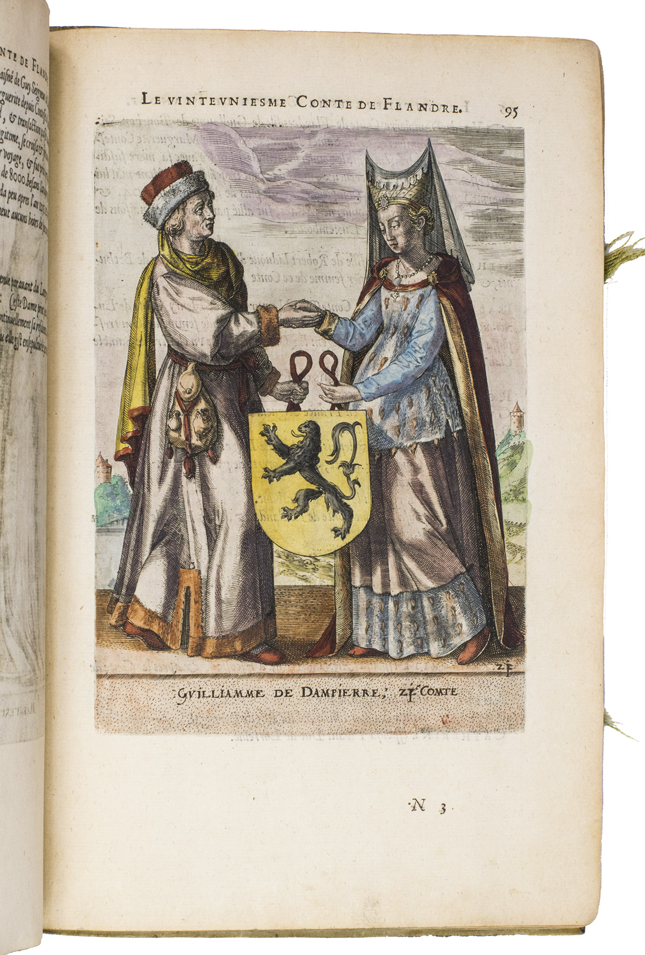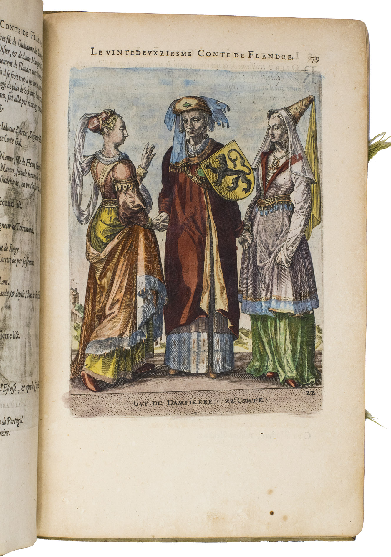 Antwerp, (colophon: Andre Bax for) Pierre Balthasar (also known as Pieter Balten), [1580]. Folio. With an engraved title-page, a full-page engraved plate with the dedication, a full-page engraved plate showing the coats-of-arms of the Foresters of Flanders and the counts of Flanders and a map of Flanders, a full-page engraving showing verse below an allegorical scene of death, 40 full-page engraved portraits of the Foresters and Counts of Flanders, 30 small coats-of-arms in the text, and numerous woodcut decorated initials. All illustrations (except for the initials) are expertly coloured by hand. Contemporary parchment, sewn on 4 supports laced through the joints, with remnants of green closing ties. [6], 119, [2], [1 blank] pp.