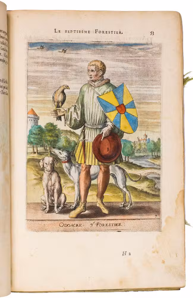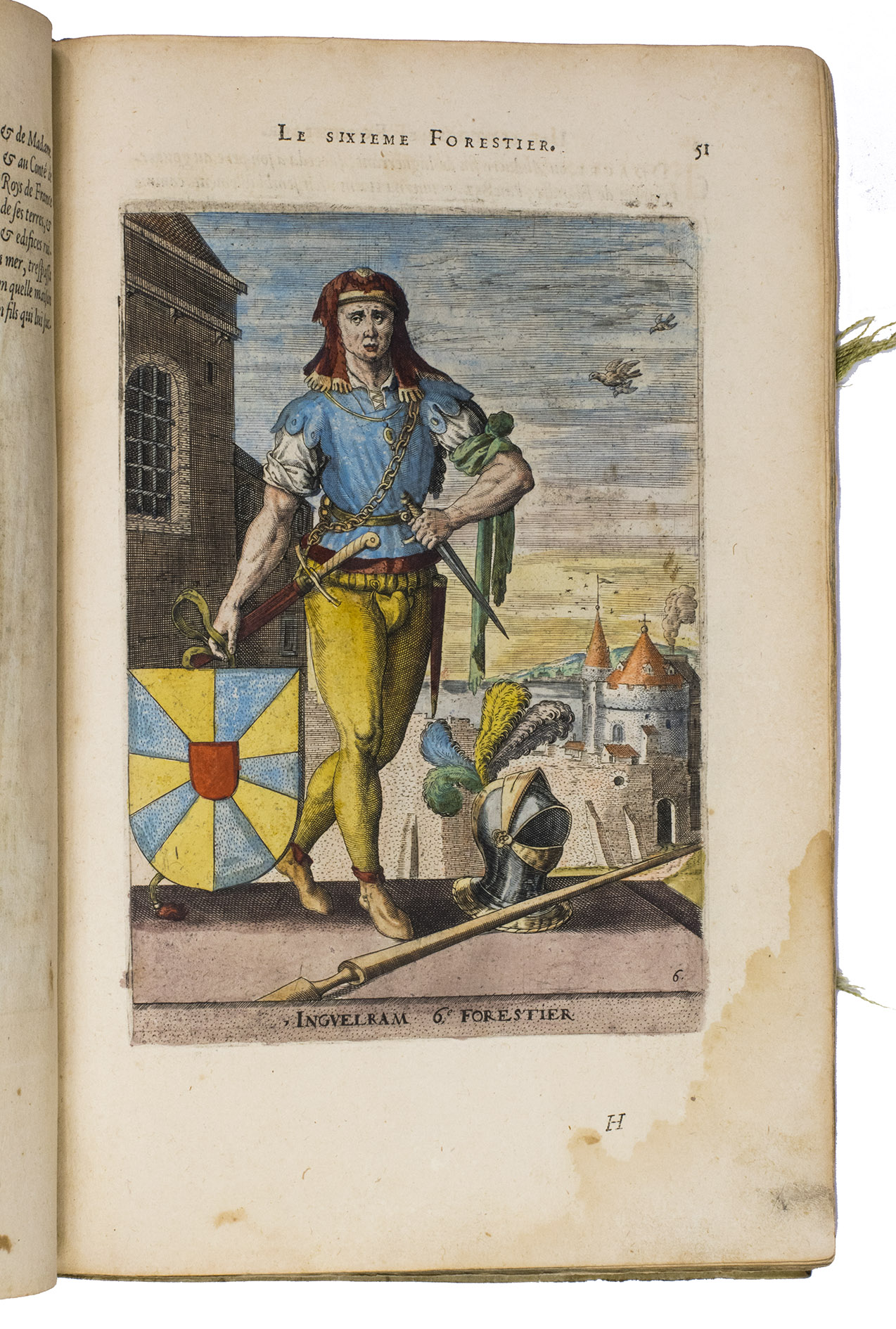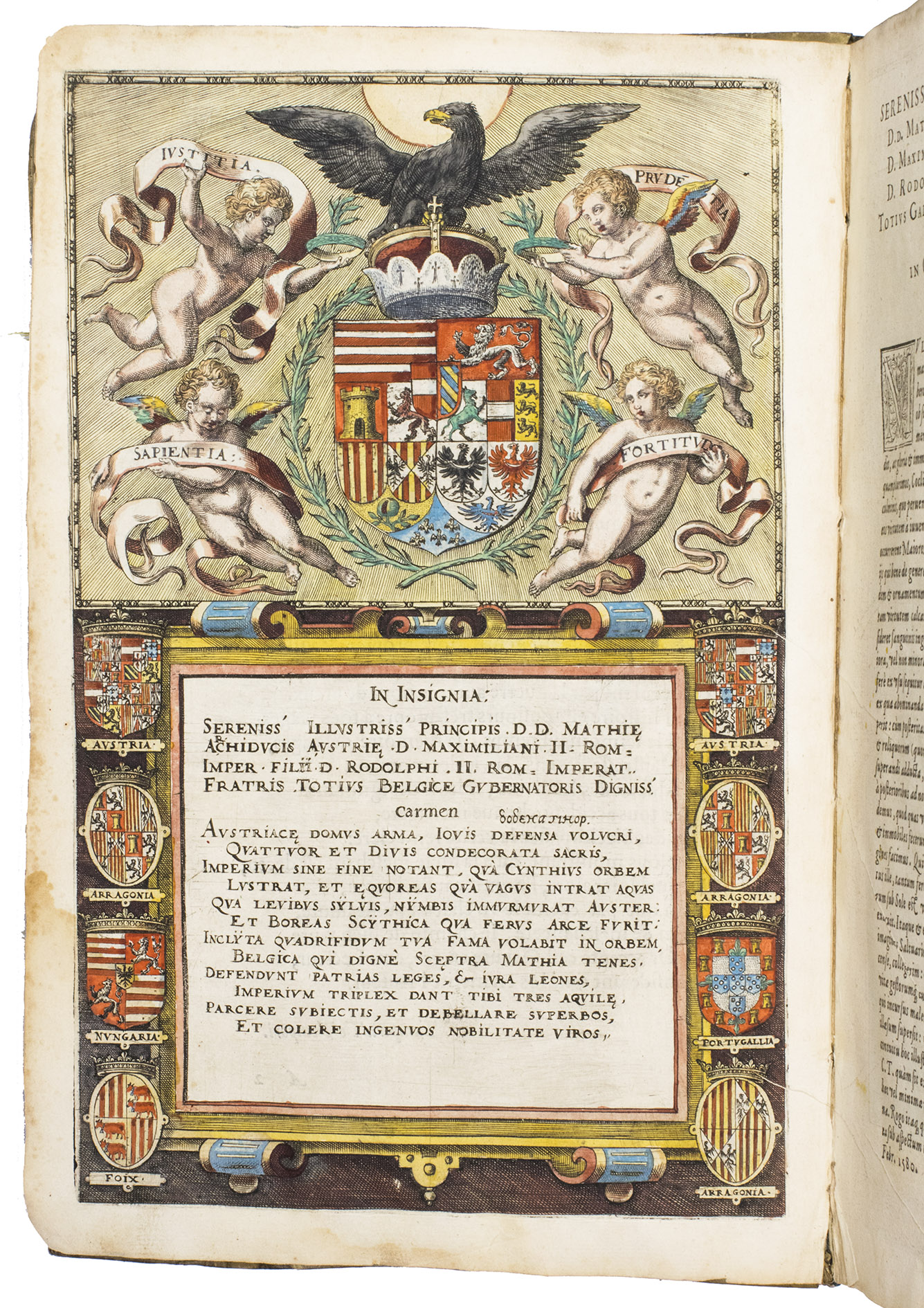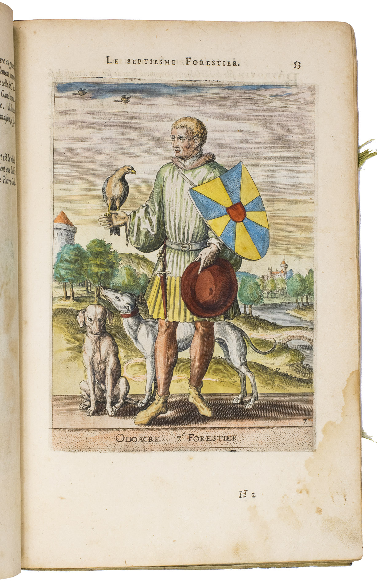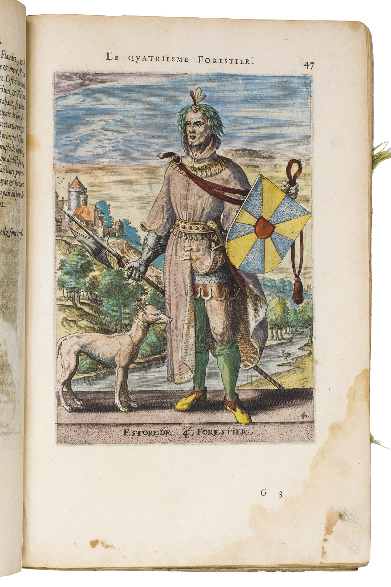 Antwerp, (colophon: Andre Bax for) Pierre Balthasar (also known as Pieter Balten), [1580]. Folio. With an engraved title-page, a full-page engraved plate with the dedication, a full-page engraved plate showing the coats-of-arms of the Foresters of Flanders and the counts of Flanders and a map of Flanders, a full-page engraving showing verse below an allegorical scene of death, 40 full-page engraved portraits of the Foresters and Counts of Flanders, 30 small coats-of-arms in the text, and numerous woodcut decorated initials. All illustrations (except for the initials) are expertly coloured by hand. Contemporary parchment, sewn on 4 supports laced through the joints, with remnants of green closing ties. [6], 119, [2], [1 blank] pp.