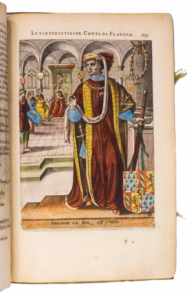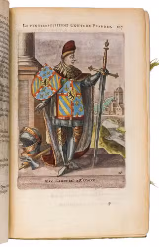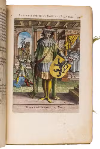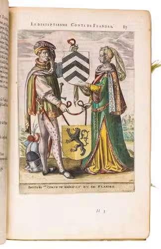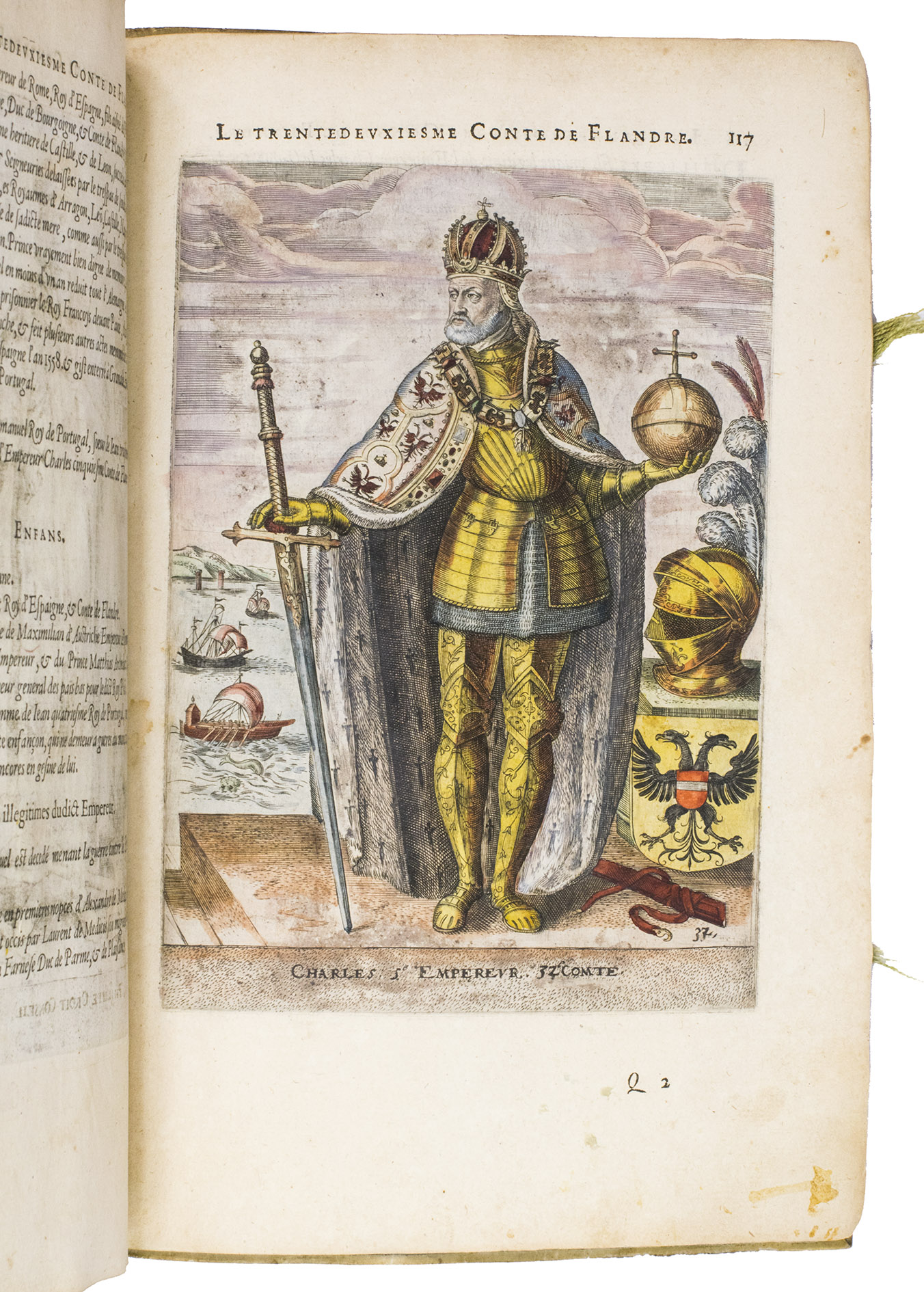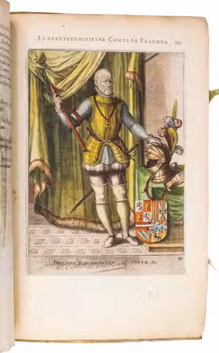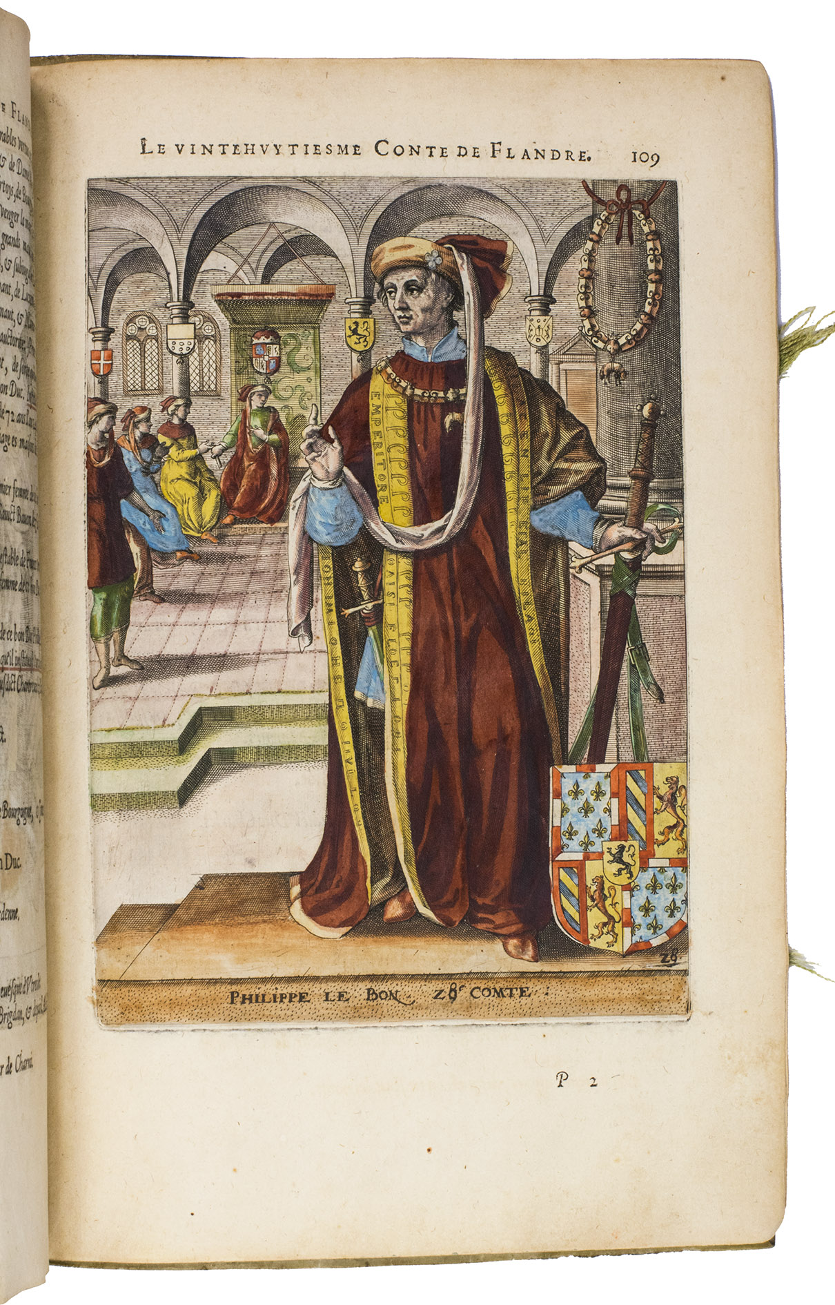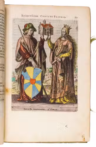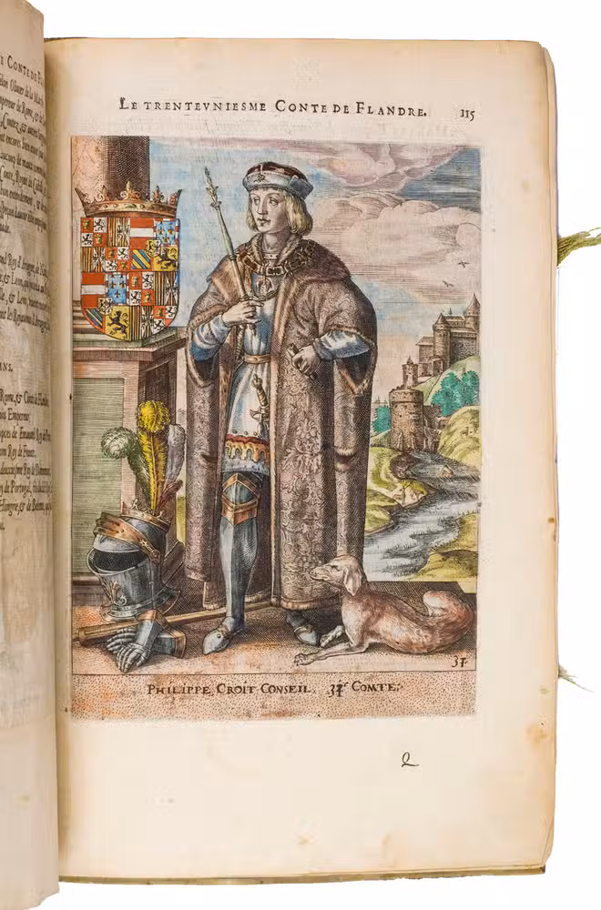 The present work is richly illustrated, most noticeably with the nearly full-page portraits of the Foresters and Counts of Flanders, beautifully contemporary hand coloured. Coats-of-arms also feature heavily in the present work, most of the portraits also show the coat-of-arms of the depicted person, but smaller hand coloured coats-of-arms also feature in the text. The coat-of-arms most often depicted is that of the Foresters of Flanders (blue, yellow, and red), which still prominently features on the flag of present-day West-Flanders. Other prominent coats-of-arms are, of course, the black lion on a yellow (gold) field of Flanders and the more intricate designs of the Houses of Burgundy and Habsburg.
