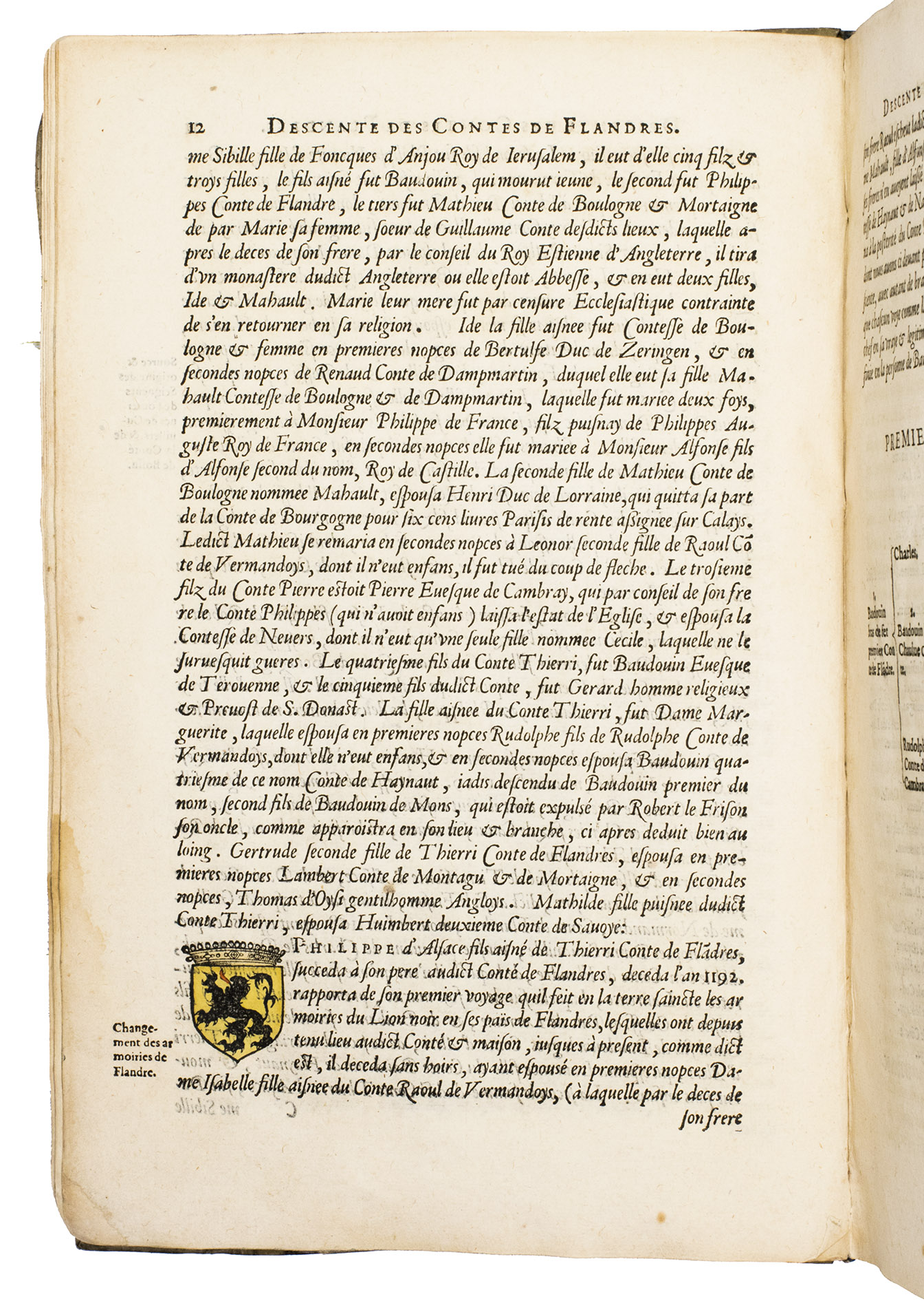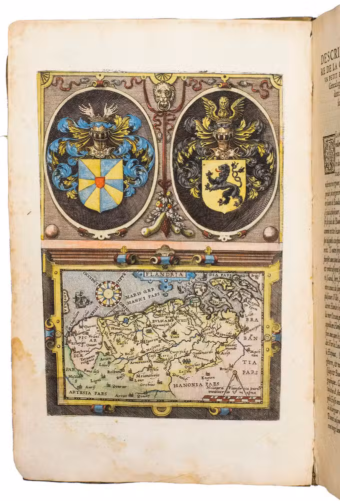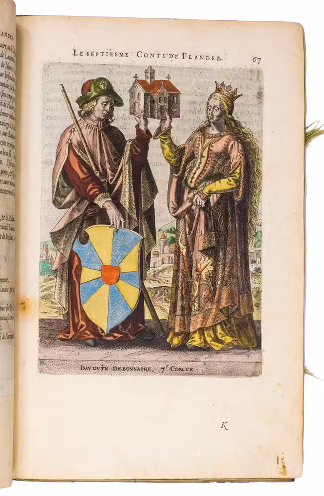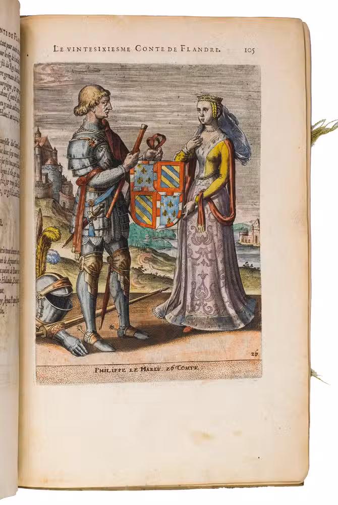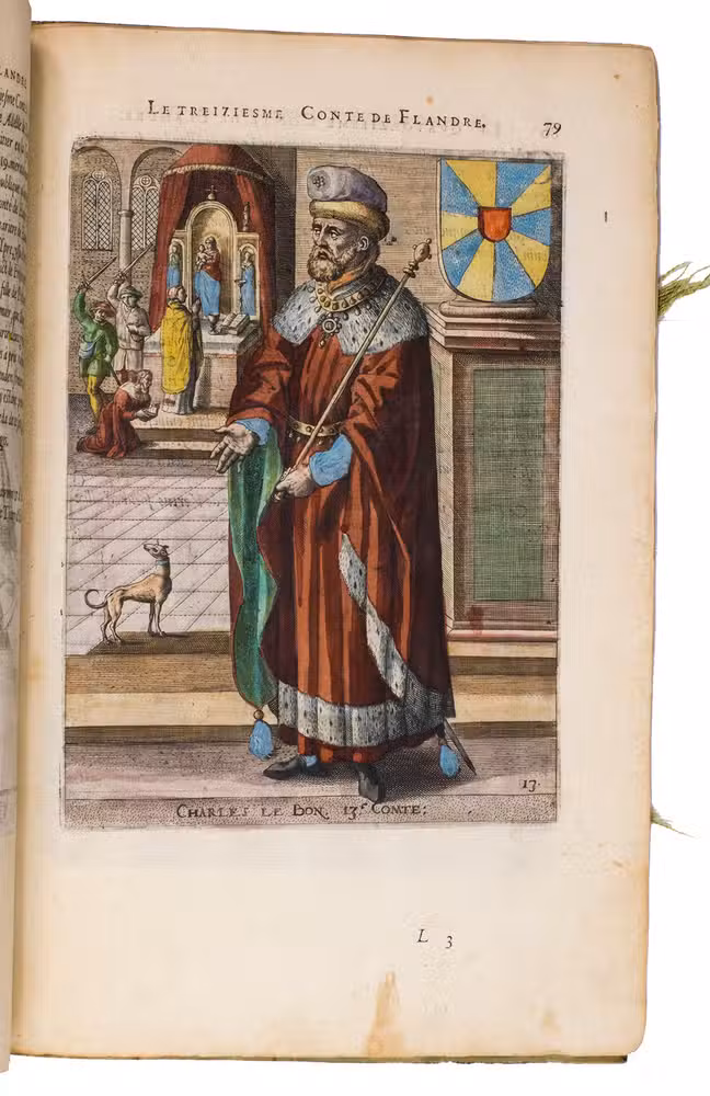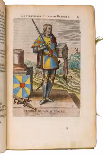 The present work is richly illustrated, most noticeably with the nearly full-page portraits of the Foresters and Counts of Flanders, beautifully contemporary hand coloured. Coats-of-arms also feature heavily in the present work, most of the portraits also show the coat-of-arms of the depicted person, but smaller hand coloured coats-of-arms also feature in the text. The coat-of-arms most often depicted is that of the Foresters of Flanders (blue, yellow, and red), which still prominently features on the flag of present-day West-Flanders. Other prominent coats-of-arms are, of course, the black lion on a yellow (gold) field of Flanders and the more intricate designs of the Houses of Burgundy and Habsburg.