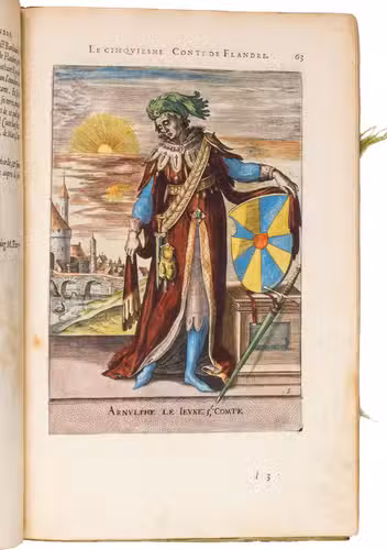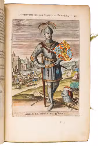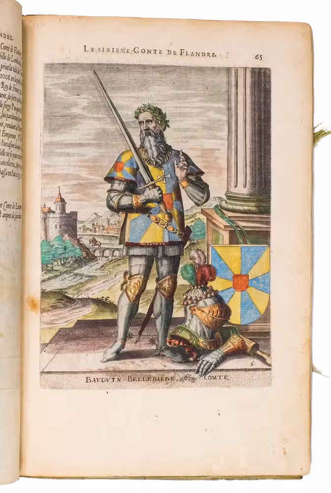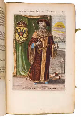 Rare, beautifully illustrated and contemporary hand coloured copy containing the biographies and portraits of the rulers of Flanders since the 9th century CE. The work details the genealogy of the Counts of Flanders, supposedly - according to the so-called Foresters legend - starting with Liederik (?-836), a Forester of the "Vlaanderengouw" (area of Flanders around Bruges). Via Baldwin I (or Baldwin Iron Arm, 830s?-879), the first margrave of Flanders, and his grandson Arnulf I (ca. 893/899-962) the first Count of Flanders, to Holy Roman Emperor Maximilian I (1459-1519) and Philip II King of Spain and Lord of the Seventeen Provinces of the Netherlands (1527-1598); it tells the story of the Mediaeval and 16th-century Counts of Flanders.