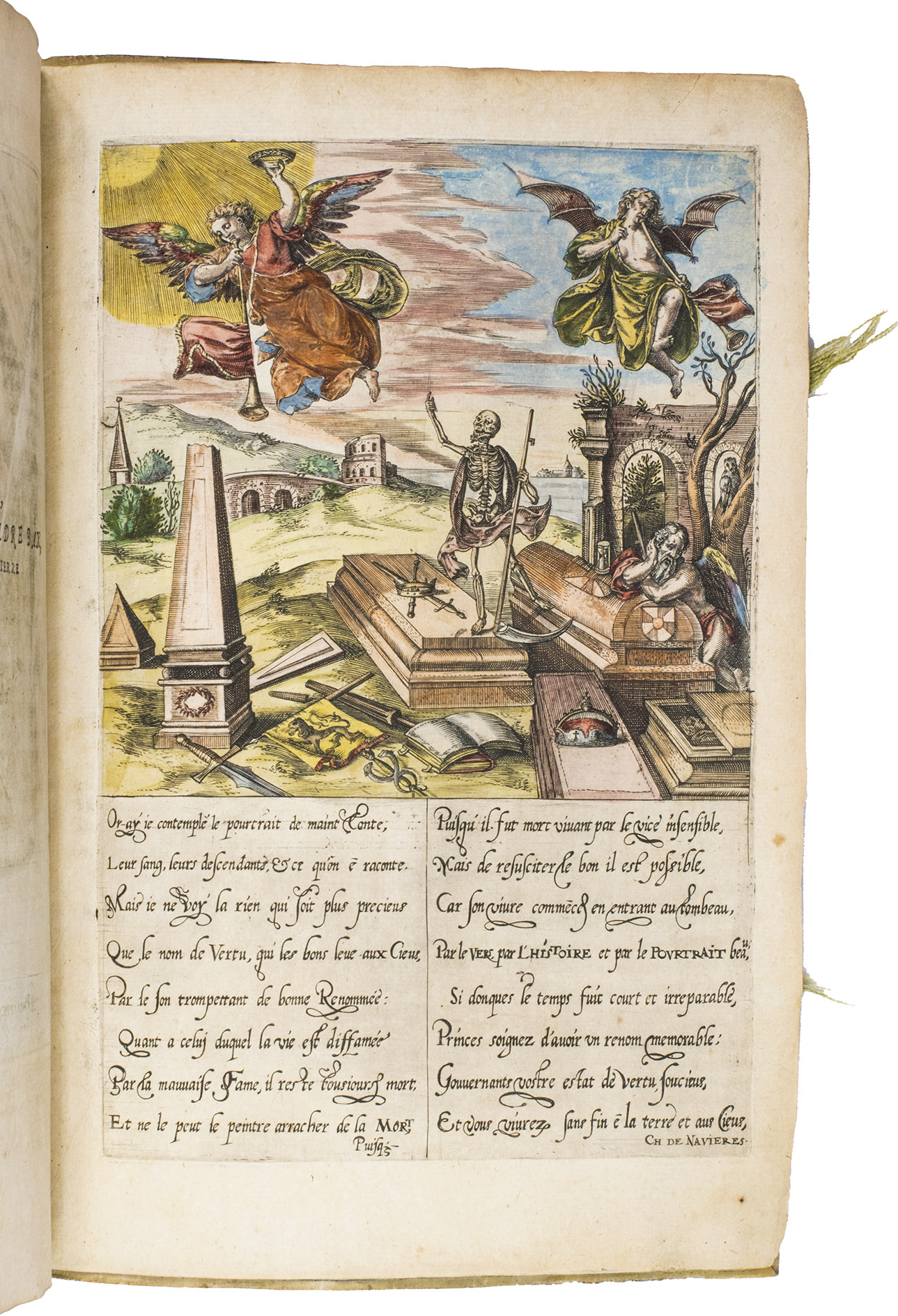 The extensive and scholarly genealogical text was written by Cornelis Martin (1500-?), a draughtsman and engraver from Zeeland, who is most known as a genealogist due to the publication of the present work. Les Genealogies starts with a laudatory verse by Jan van der Noot (ca. 1539-after 1595), famous early Renaissance poet from the Southern Netherlands, and dedicated by publisher and illustrator Pieter Balten to Matthias, Rudolf II, and Maximilian II, Archdukes of Austria and Holy Roman Emperors, dated Antwerp, February 1580. The portraits of the foresters and counts of Flanders are shown at full length, with their coat-of-arms and other symbols of their reign, sometimes accompanied by their wives, and all beautifully set against a background showing a palace, a city, a landscape or a battle-field. Underneath the name of the ruler is engraved on the plate with his number, and a short genealogical description is given on the opposite page, in fact printed on verso of the preceding plate. These illustrations were the work of Pieter Balten (ca. 1527-1584), a Flemish Renaissance painter, draughtsman, engraver, and publisher. According to the engraved title-page he also published the present work, from the colophon, however, becomes clear that it was printed in Antwerp by Andre Bax for distribution by Balten. The full-page illustrations were later reused in the Flandria Illustrata (1641). At the end of the work, a beautiful allegorical plate depicting death with a verse by Charles de Navieres (1544-1616) is added.