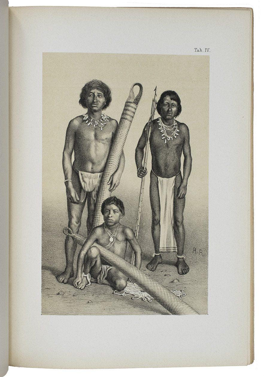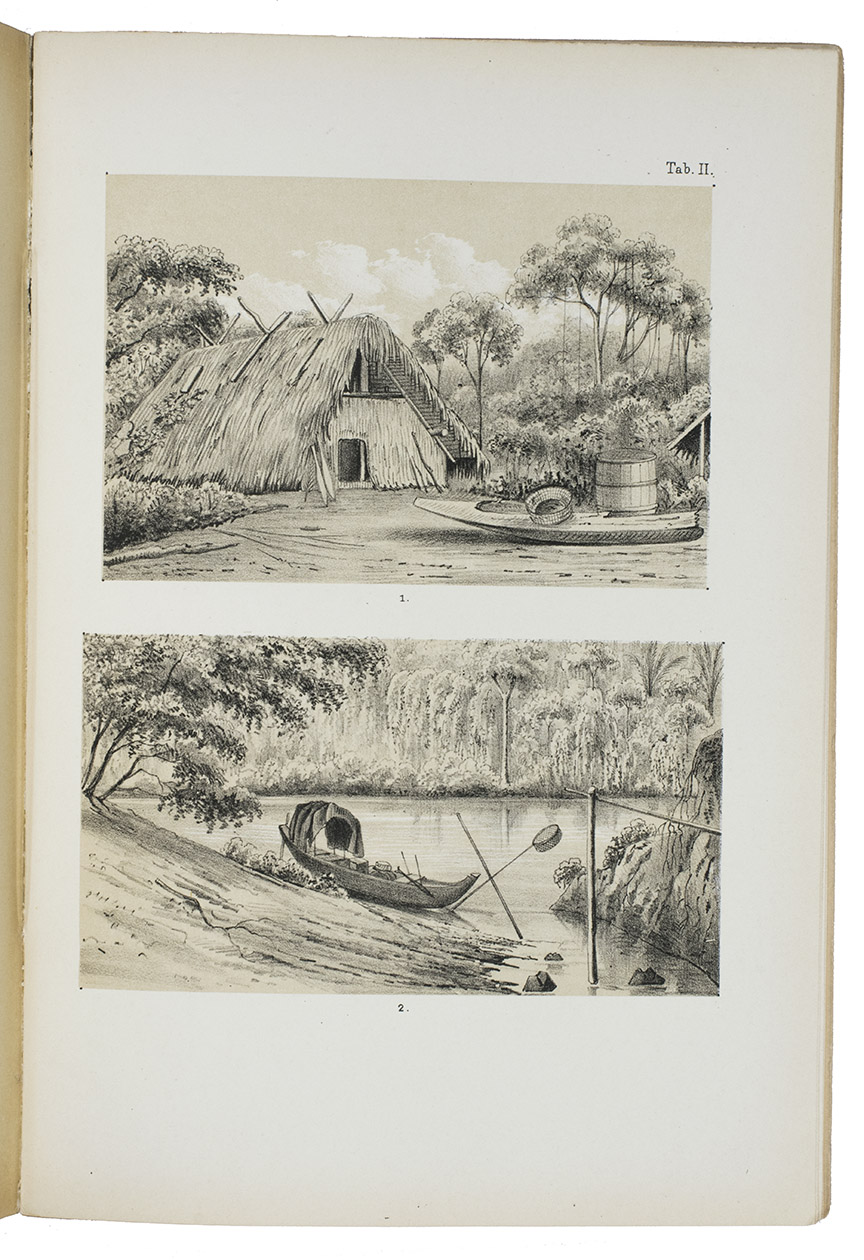 Leiden, E.J. Brill, 1887. 4to. 22 plates, of which 14 chromolithographs and 8 collotypes, and 1 folding lithographed map of the Surinam River by W.L. Loth. Original publisher's printed paper wrappers. VII, [1], 186 pp.