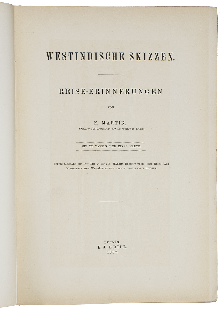 First and only separate edition of the first part of Karl Martin's research voyage to the Dutch West Indies. Johann Karl Ludwig Martin (1855-1942) was a leading German-Dutch geologist and professor of geology at Leiden. He is known for his geological research in the Dutch colonies, mostly the East Indies but the present work comprises only the Dutch West Indies and in particular inner Surinam. The present first part treats the land and people of Surinam. Martin went down the Surinam River, deep into the jungle, encountering native tribes and strange rock formations. Photographs were made, of which 8 are included as collotype plates at the end of the work. They depict mostly the coastal areas and one shows a train riding along a very steep cliff.