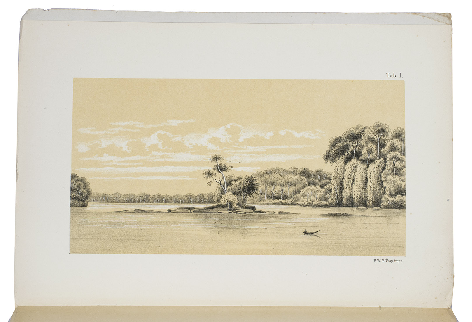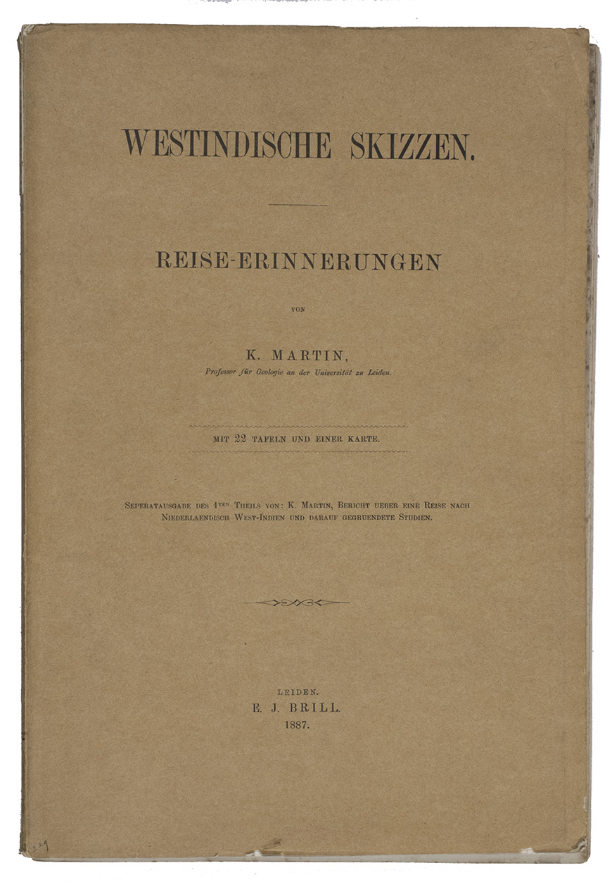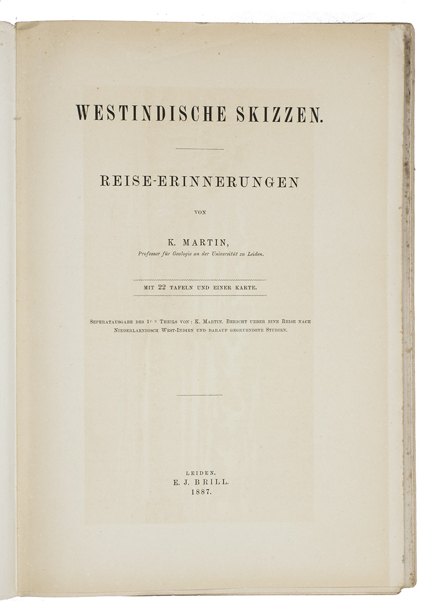 First and only separate edition of the first part of Karl Martin's research voyage to the Dutch West Indies. Johann Karl Ludwig Martin (1855-1942) was a leading German-Dutch geologist and professor of geology at Leiden. He is known for his geological research in the Dutch colonies, mostly the East Indies but the present work comprises only the Dutch West Indies and in particular inner Surinam. The present first part treats the land and people of Surinam. Martin went down the Surinam River, deep into the jungle, encountering native tribes and strange rock formations. Photographs were made, of which 8 are included as collotype plates at the end of the work. They depict mostly the coastal areas and one shows a train riding along a very steep cliff.