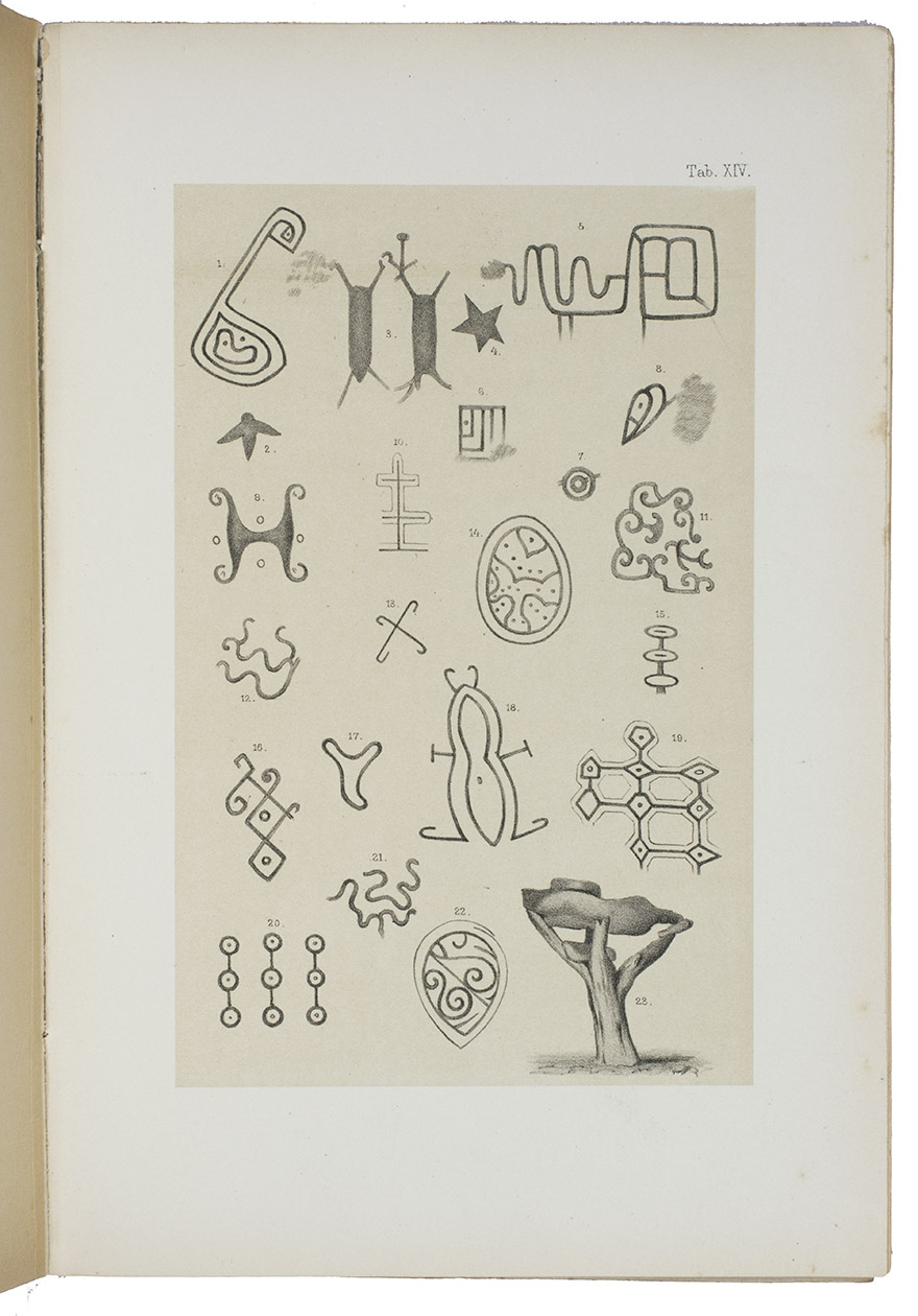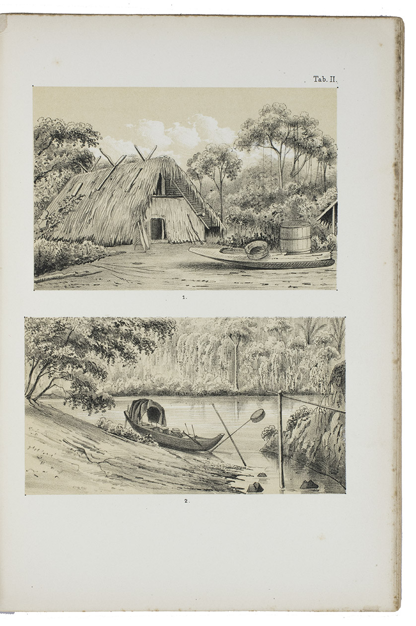 Leiden, E.J. Brill, 1887. 4to. 22 plates, of which 14 chromolithographs and 8 collotypes, and 1 folding lithographed map of the Surinam River by W.L. Loth. Original publisher's printed paper wrappers. VII, [1], 186 pp.