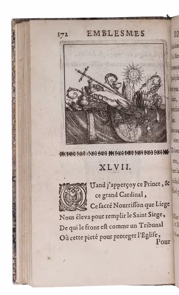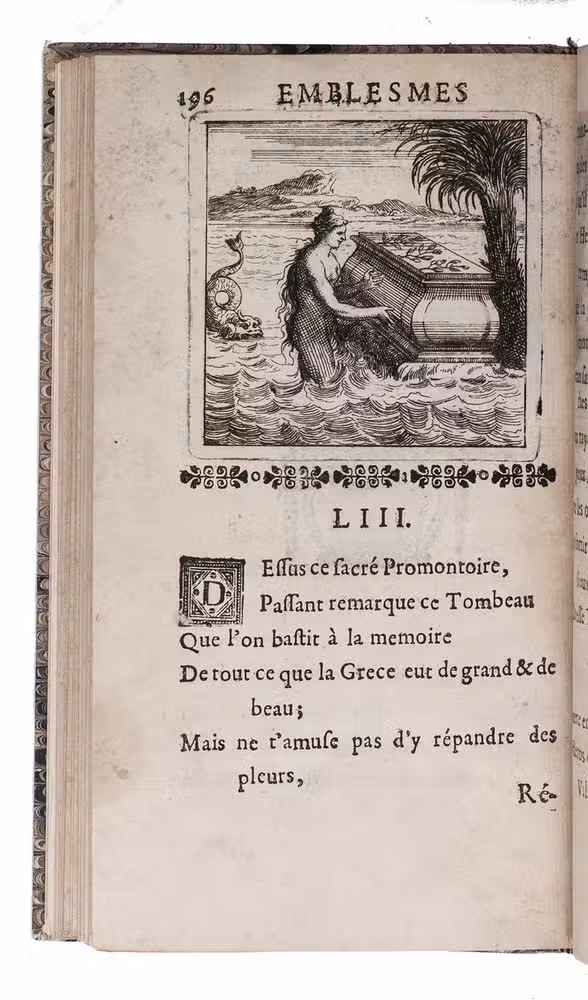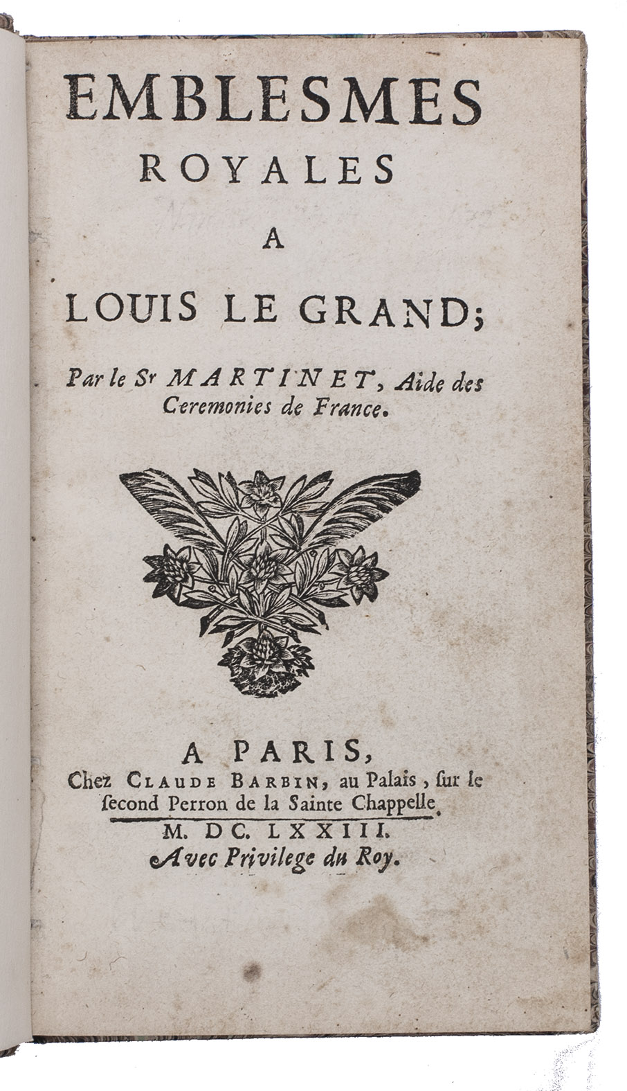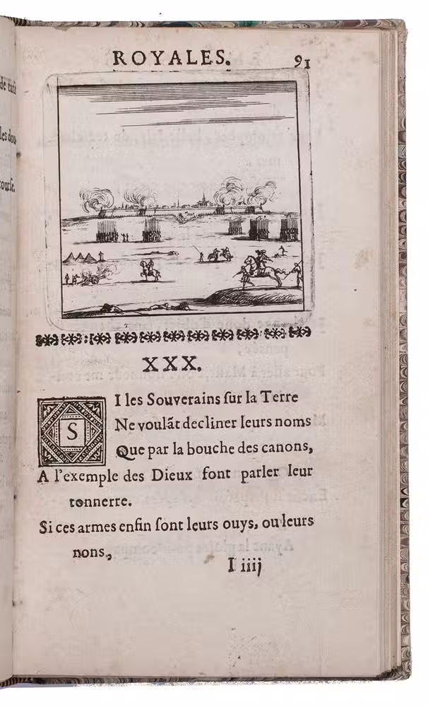 First and only edition of an emblem book devoted to the Sun-King Louis XIV of France. The book is nicely produced with a woodcut vignette on title, little woodcut initials, large woodcut tail-pieces, and with borders built up out of ornamental cast fleurons underneath each emblem. And at the end of the dedication to Louis le Grand, the King's personal emblem, a woodcut sun, is added. The engraved emblems depict ancient gods and heroes, plants, animals, buildings, scenes of battle, etc. and are followed by brief poems in French. Unfortunately the second leaf is lacking, containing a poem titled "L'Arc de Triomphe", however, our copy does include the rare extra inserted emblem to Madame de Longueville.