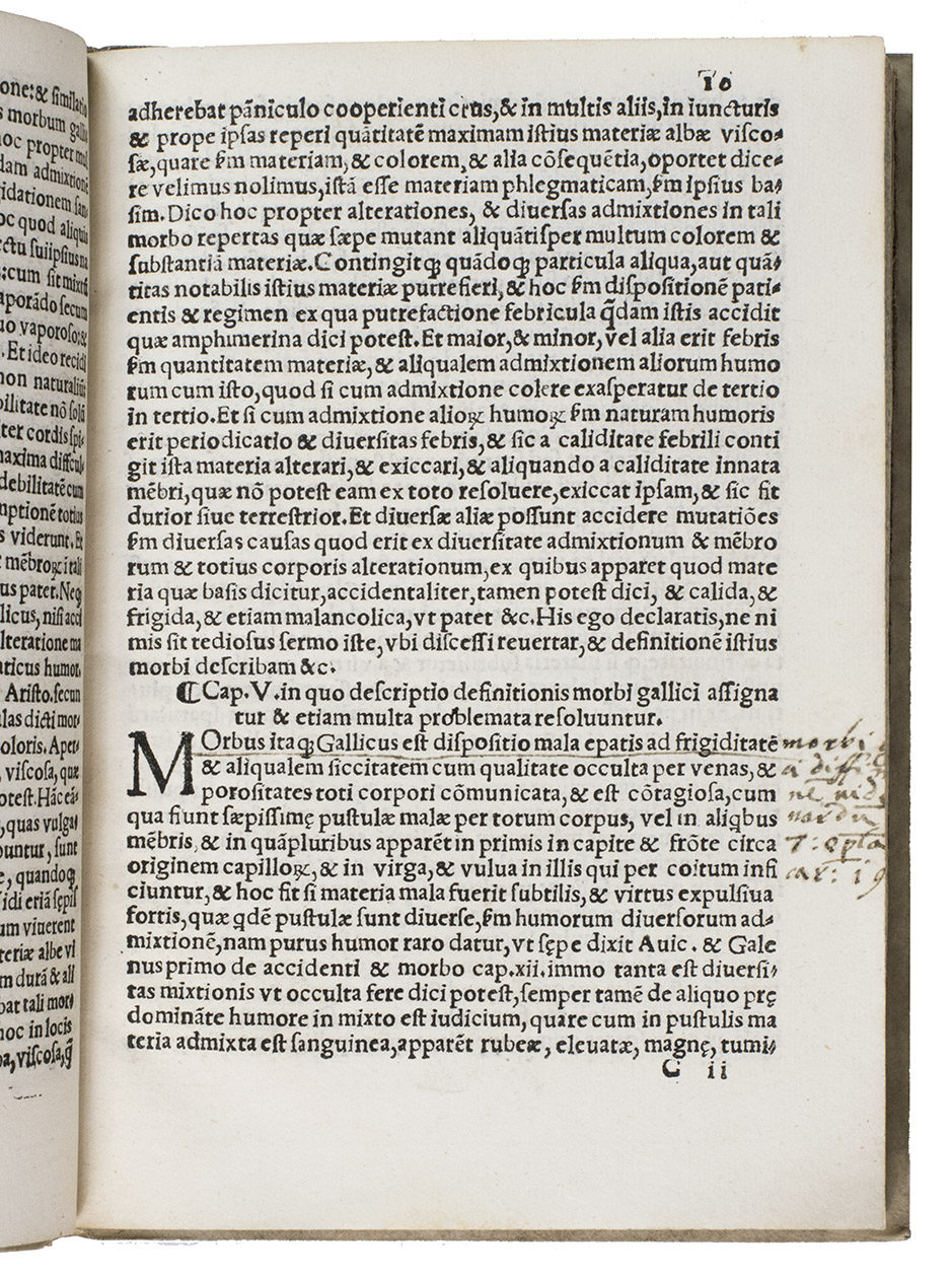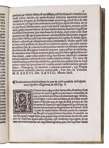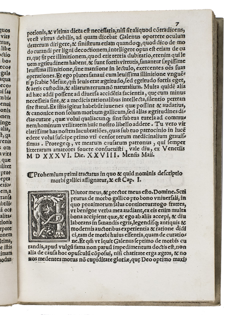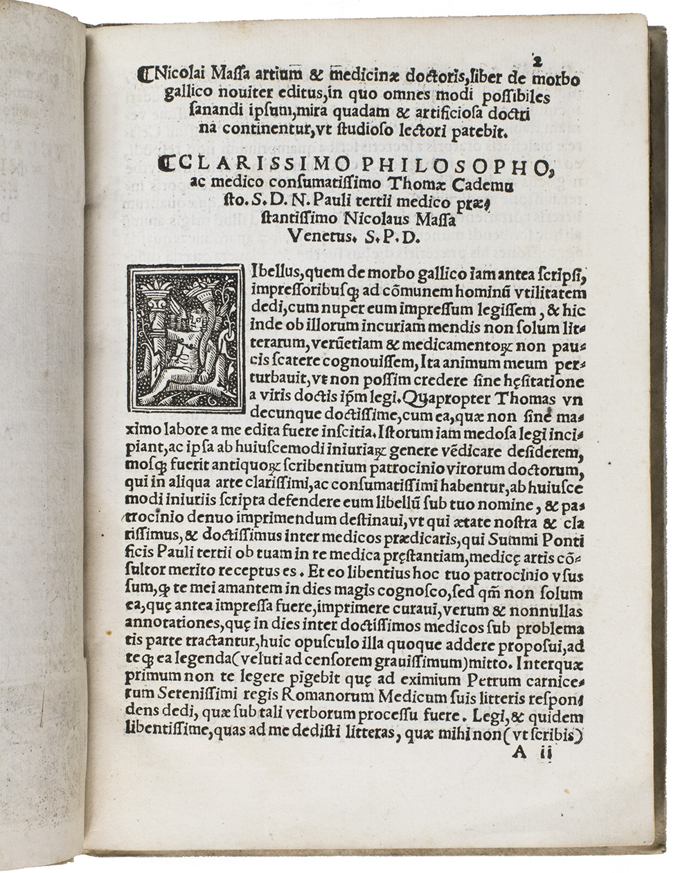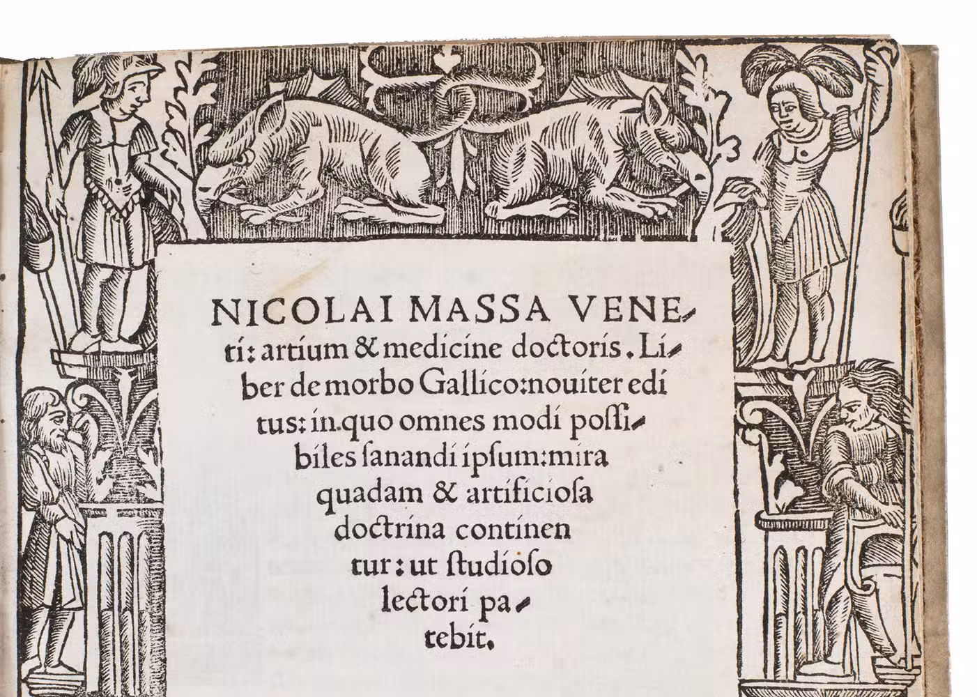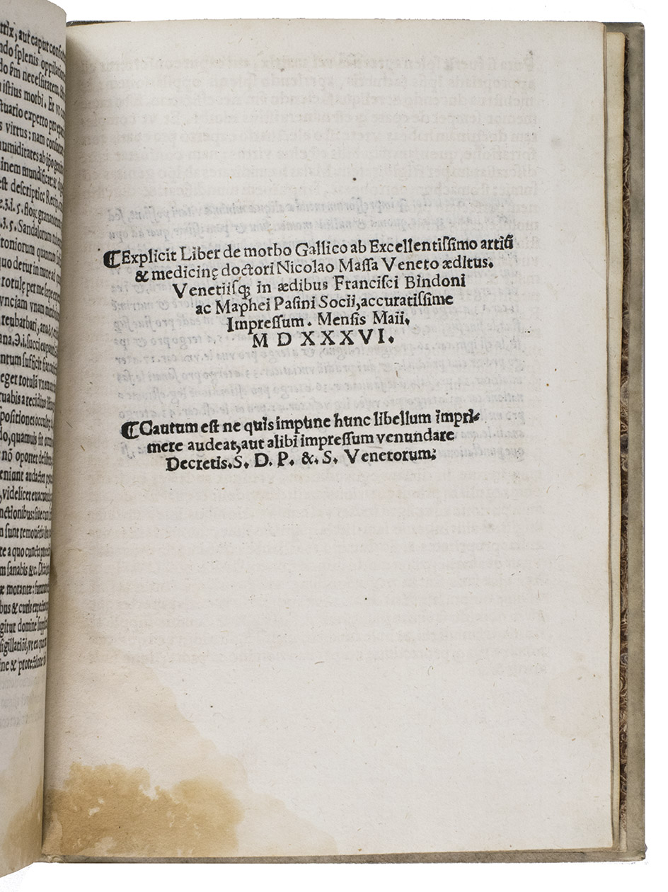 Third(?) edition, by the printers and publishers of the first, of a famous treatise on syphilis by the Italian physician Niccolò Massa (1489-1569), professor of anatomy in Venice. It stresses the important role sexual intercourse plays in the contraction of syphilis, though he also believes it could arise spontaneously without sexual contact. He gives a comprehensive description of the symptoms and effects of the so-called French disease (the French sometimes called it the Neapolitan disease), including its neurological manifestations, and discusses the role of diet, sleep and exercise, together with the use of drugs, bloodletting, leeches and guaiac in the treatment of syphilis. The first edition is dated 1507, but was actually published in 1527. It is Massa's best-known work and remained popular throughout his life.