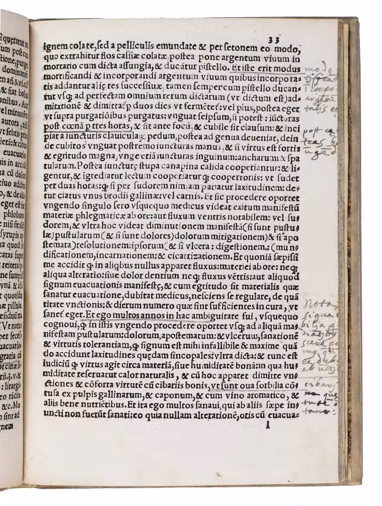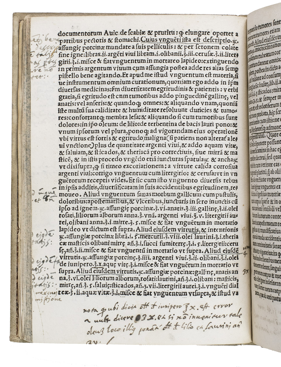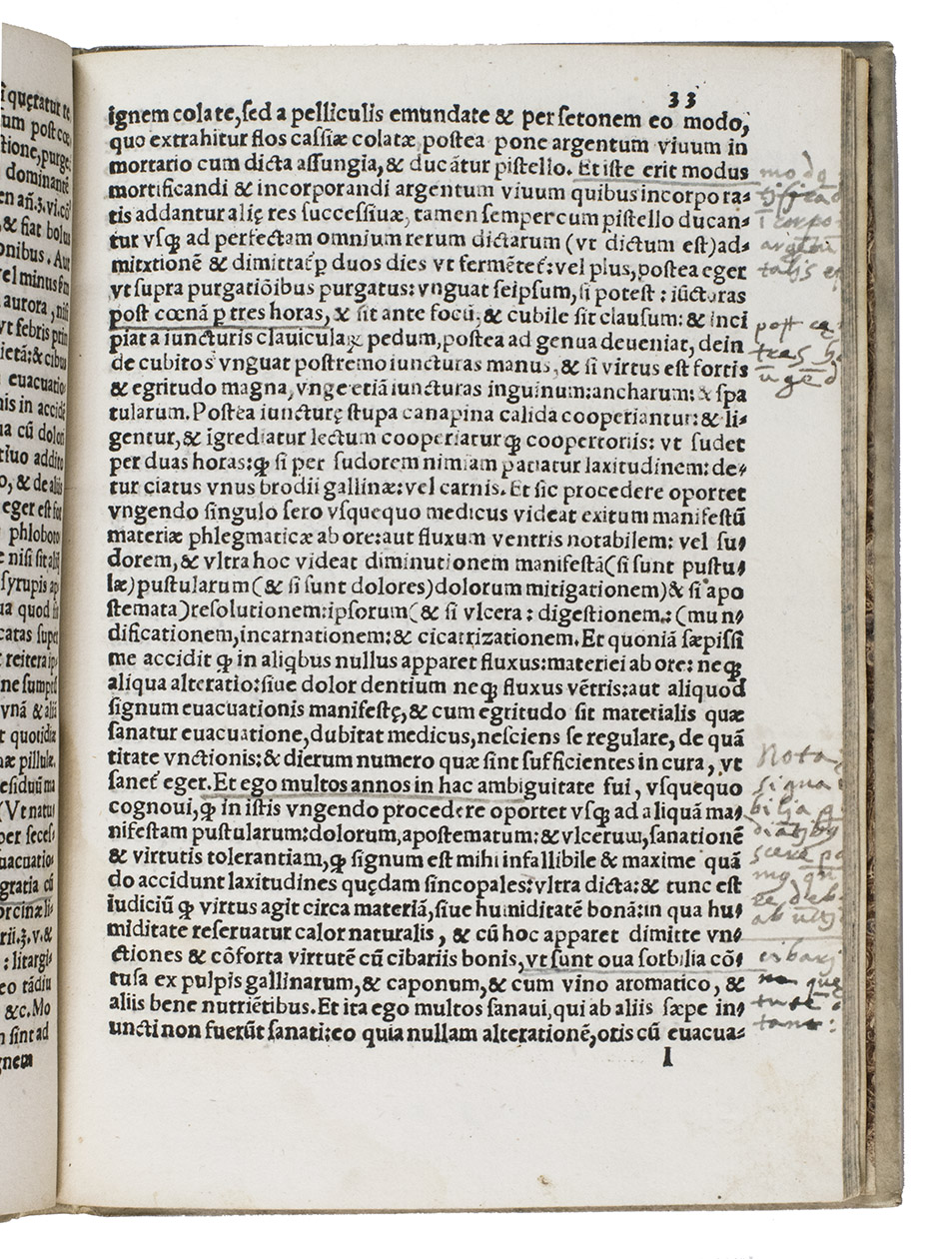 With numerous early manuscript annotations in the margins. These have been attributed to the pioneering French surgeon Ambroise Paré (ca. 1510-1590) but we have not confirmed the attribution. With the title-page border and some of the manuscript annotations very slightly shaved, but otherwise in good condition, with some water stains in the lower inside corner of the last 3 quires and a darker marginal stain in the last. The binding is rubbed and the boards slightly warped. Durling 2993; Hirsch IV, 160; ICCU (9 copies); Waller 6300.