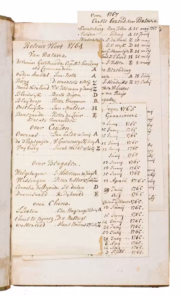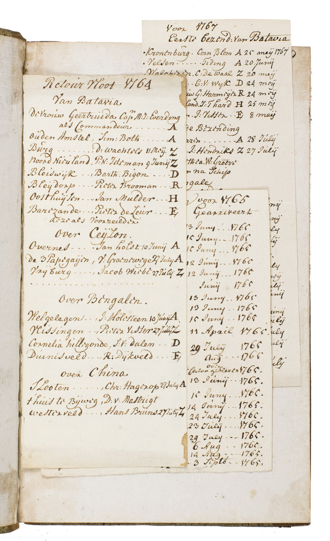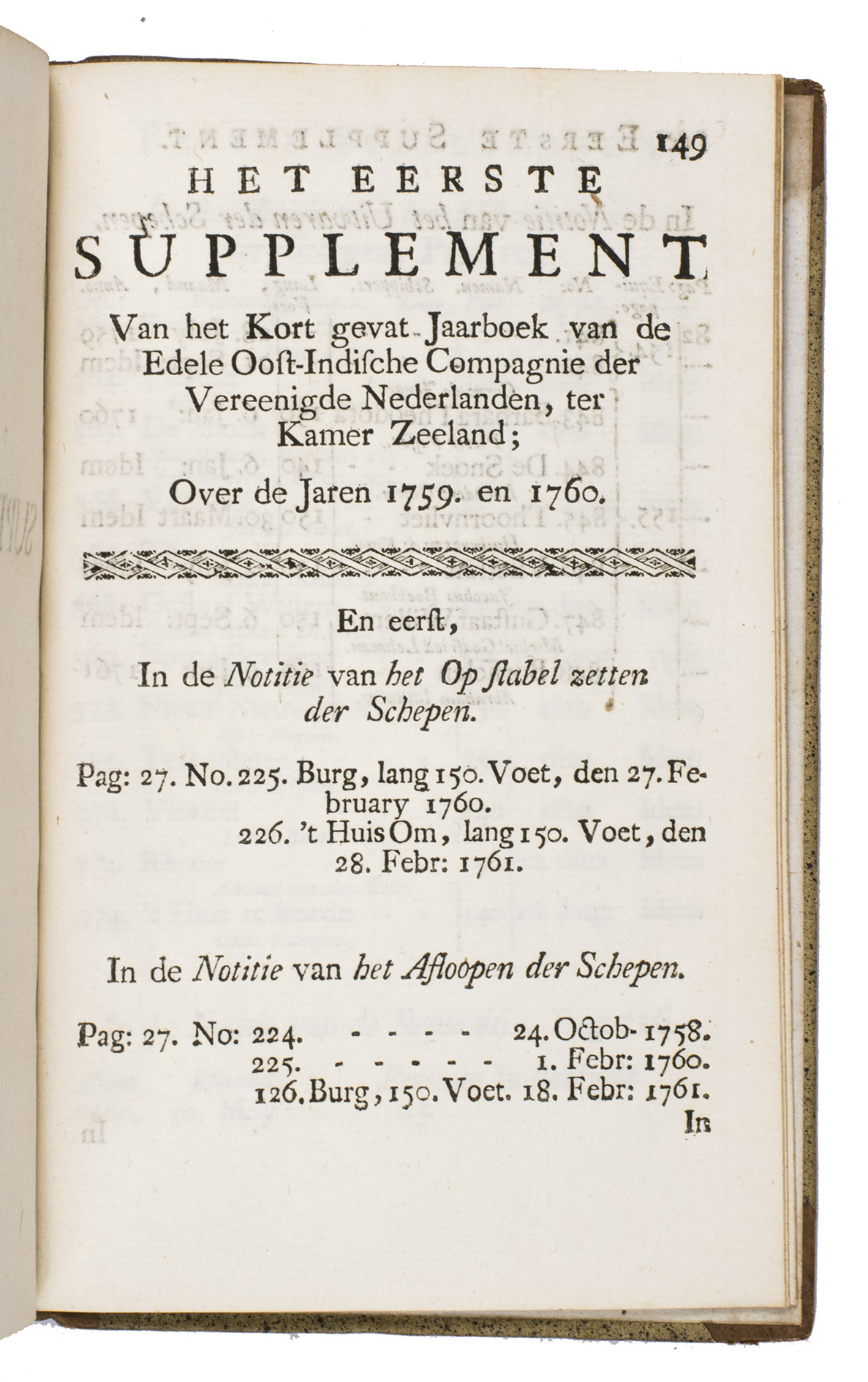 With an owner's inscription on the recto of the first free flyleaf ("... by S: de Wind"), contemporary manuscript corrections and additions in the text, 3 loosely inserted leaves listing arrival and departure information for ships to and from Batavia in 1764, 1765, and 1767, and the manuscript name of the publisher on the verso of the title-page (to authenticate the copy). The binding shows slight signs of wear, very slightly browned throughout. The errata on pp. 141-146 are bound after the supplement (pp. [147]-151, [1 blank]). Otherwise in very good condition. Cat. NHSM, I, p. 505; Landwehr, VOC, no. 1489; STCN 158551680 (9 copies, including 5 incomplete); WorldCat 966450161, 219447493, 122342190 (11 copies, including 8 also in STCN).