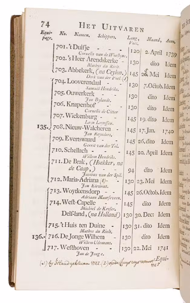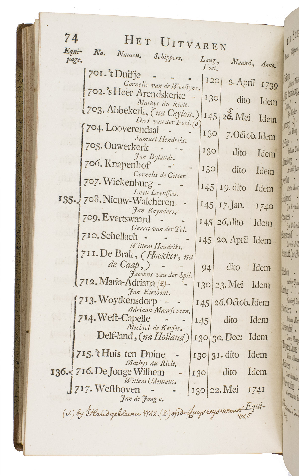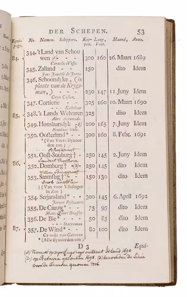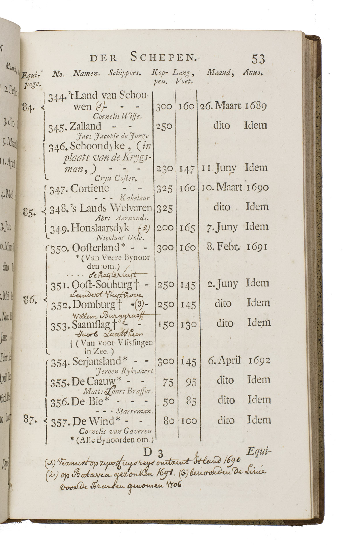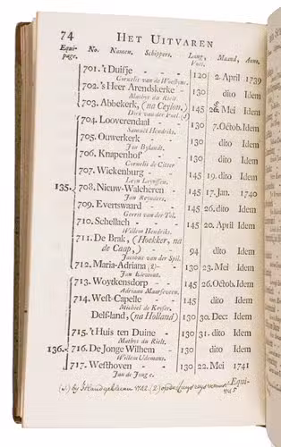 The VOC, one of the first capitalistic trade organisations in the world to issue shares, has been one of the principal organisations responsible for the unique prosperity and wealth of the Dutch Republic in the 17th century. The work lists (often with additional information provided in contemporary handwriting) names of directors, newly built ships including the size and the size of their respective crews, arrival and departure information for any Zeeland VOC ship including the name of its captain, and the dividends paid to VOC shareholders.