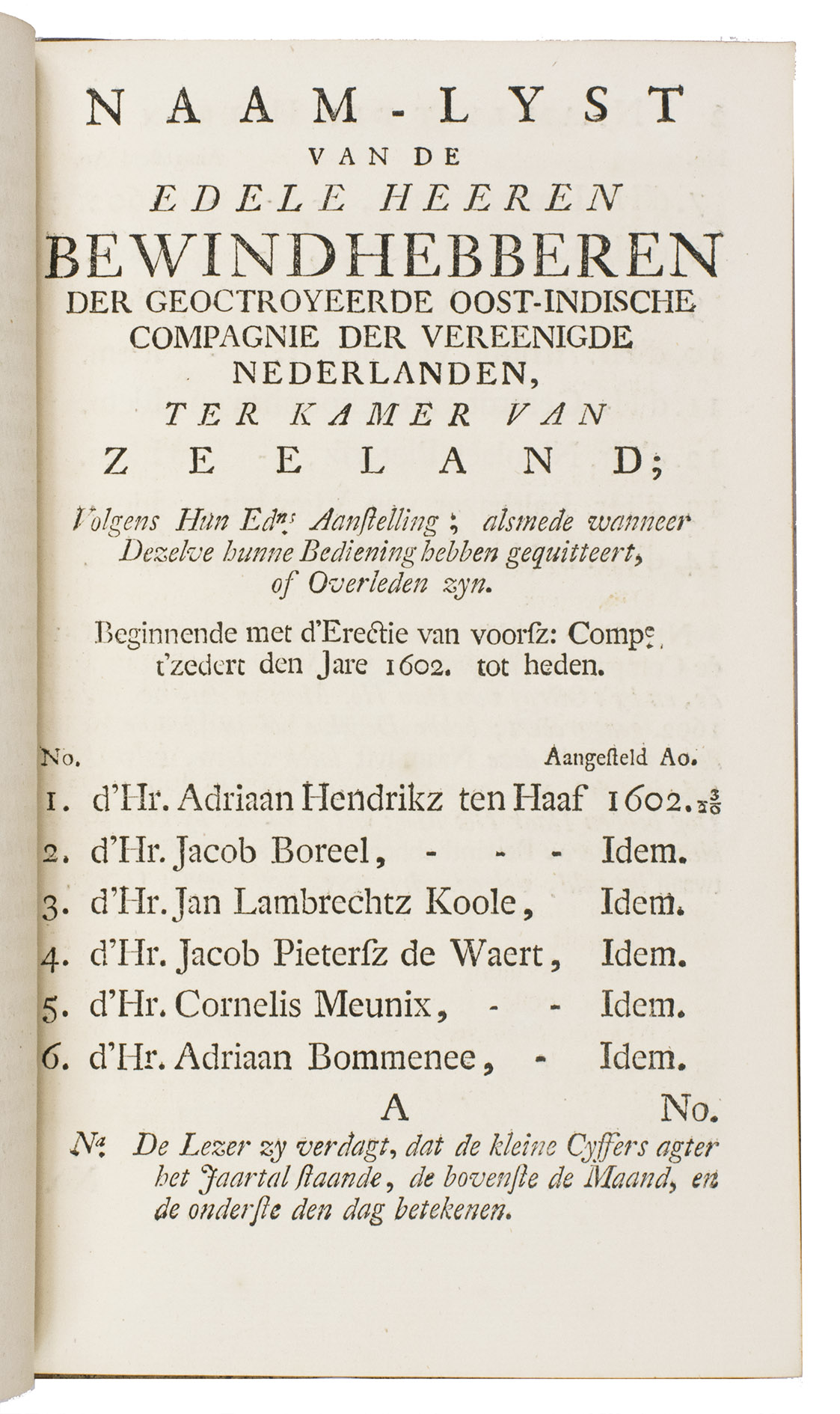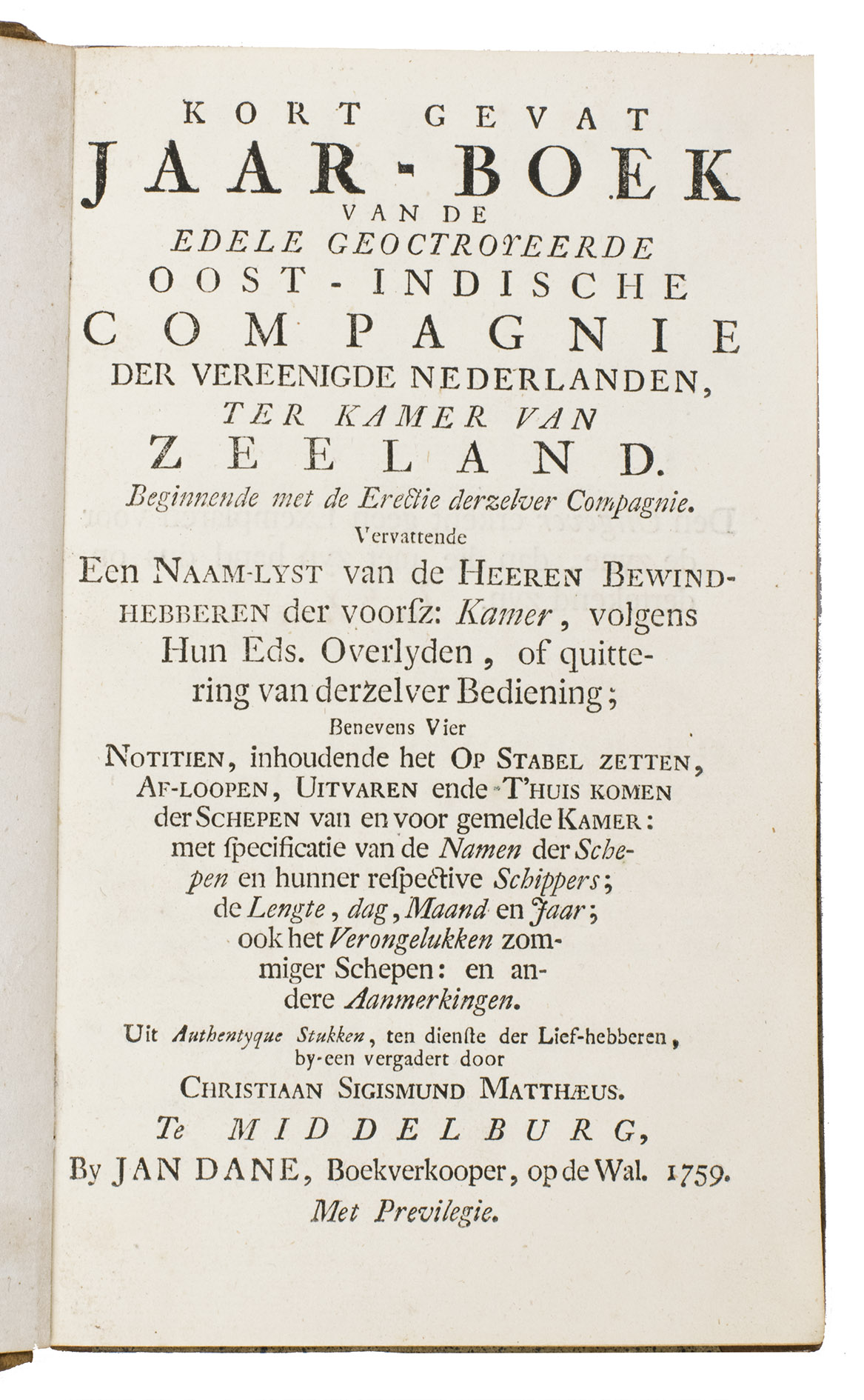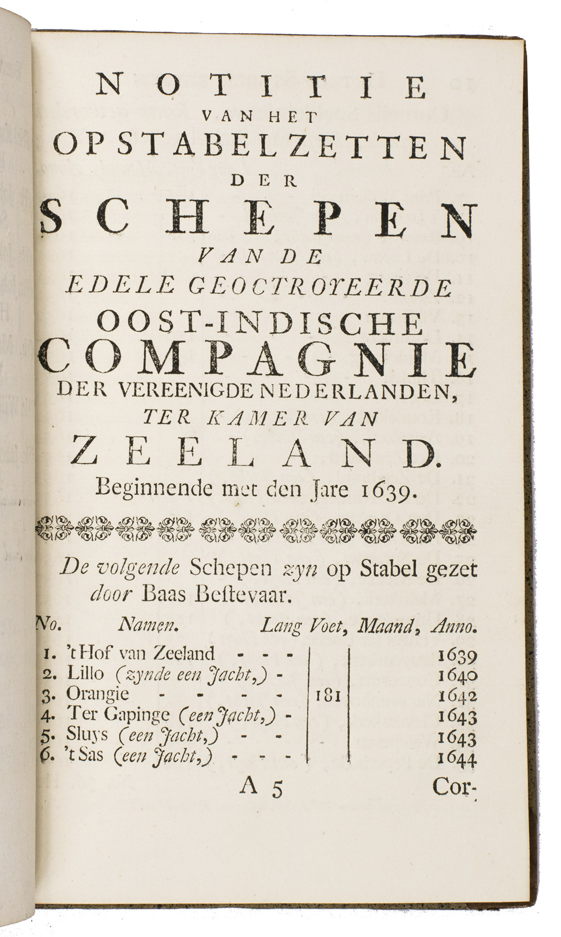 Rare complete first and only edition of a vital source of information on the organisation and functioning of the Zeeland Chamber of the Dutch East India Company (VOC) based in Middelburg, one of the 6 chambers of the VOC. The work is a gold mine for the maritime and economic history of Zeeland during the Dutch Golden Age.