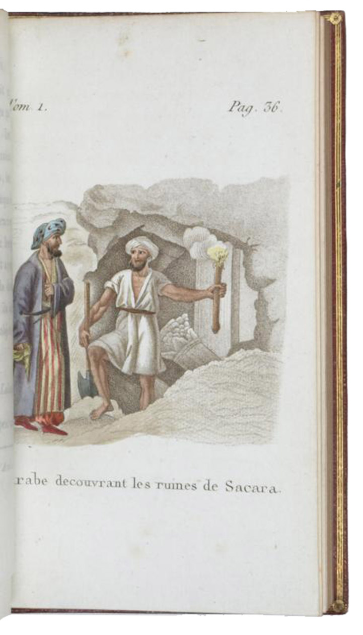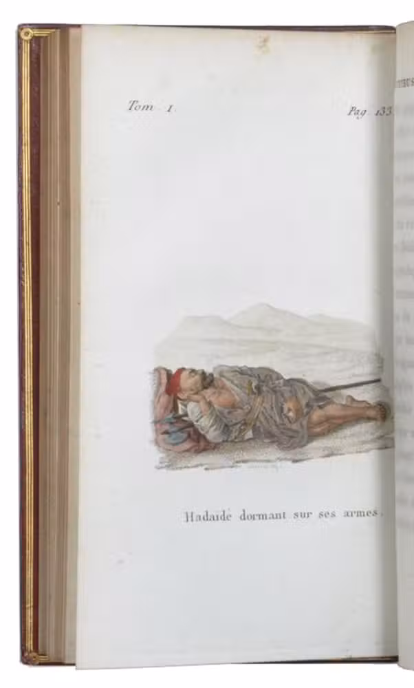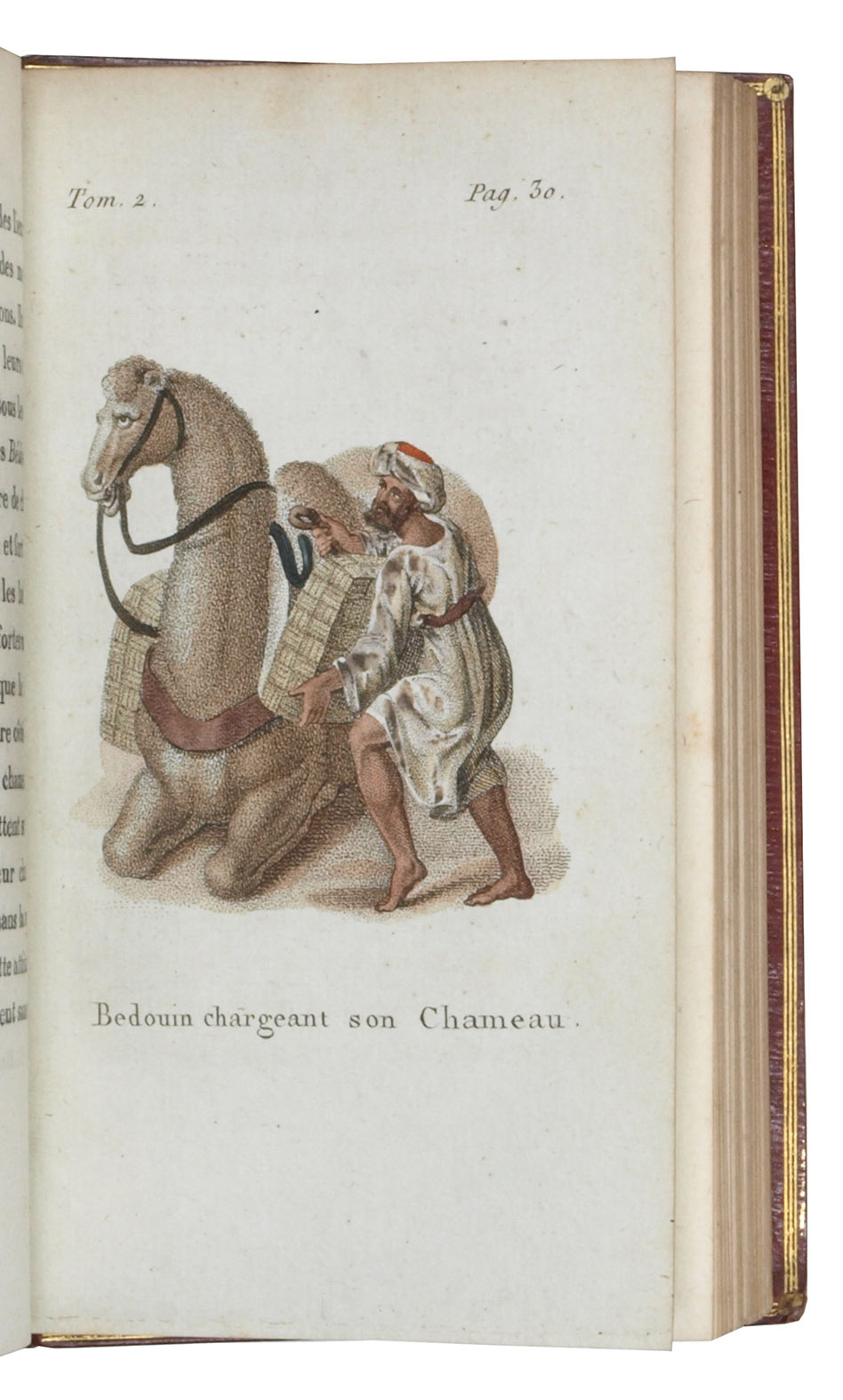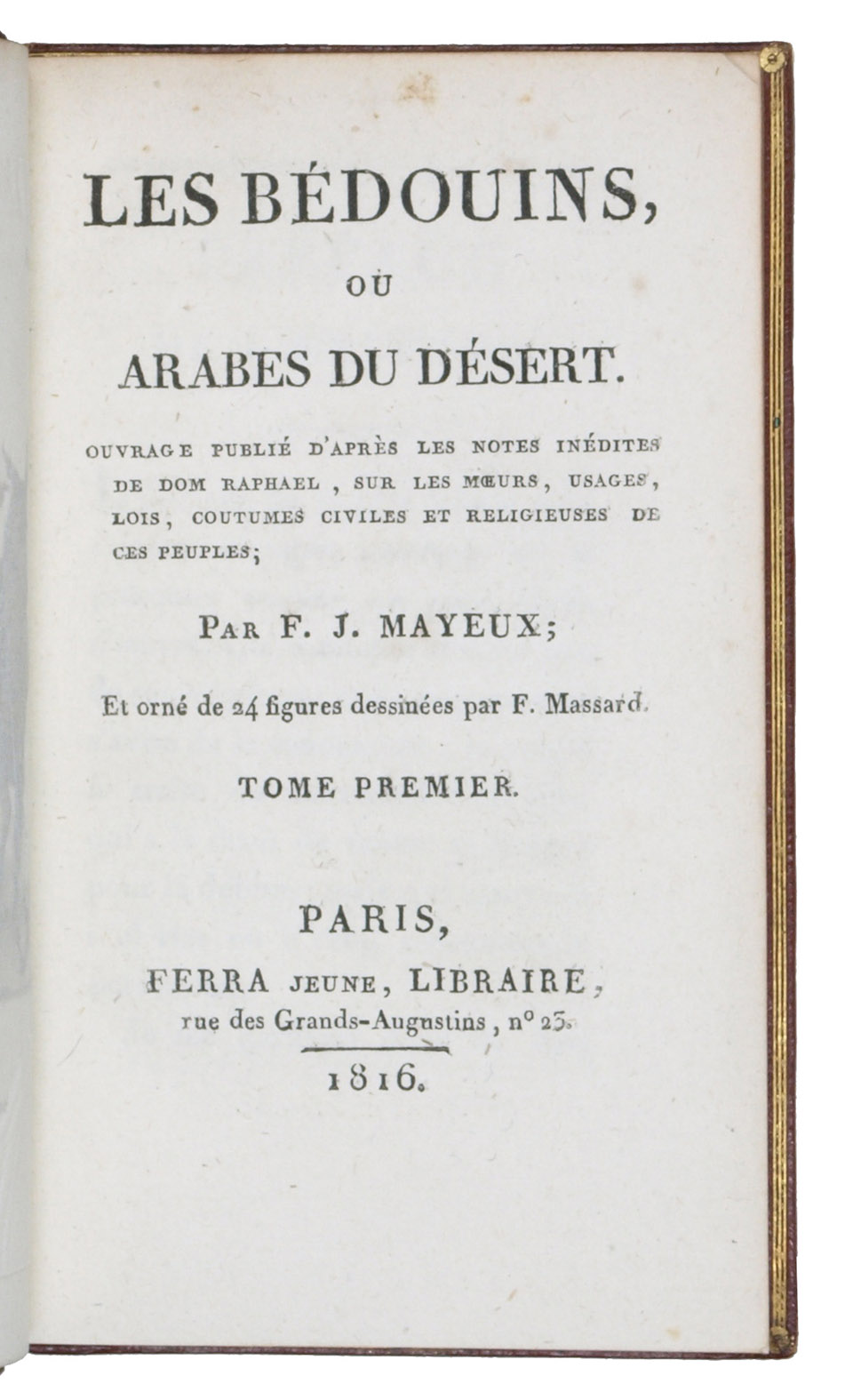 First edition of an early study of the Bedouins of Egypt and Syria, covering their manners, laws, civil and religious customs. Illustrated with 24 steel engraved plates by Charlin after F. Massart and finely coloured in watercolour by a contemporary hand. Dom Raphaël Monachis (Rufa'il Zakhûr) probably made his notes, published here for the first time, during the French occupation of Egypt. He was born in Egypt of Syriac ancestry and was a monk in the Greek community in Cairo. He was an Arab member of the French Institute of Egypte and the first interpreter of the Diwan from Cairo.
