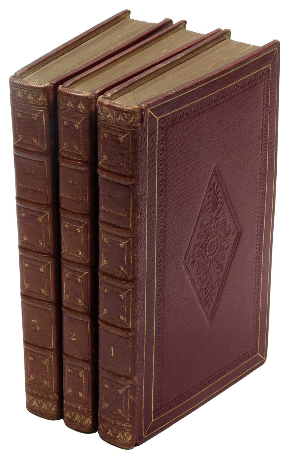 Paris, Ferra jeune, 1816. 3 volumes. 12mo. With 24 steel engraved plates, coloured by a contemporary hand. Contemporary long-grained gold-tooled red morocco, each board with fillets and decorative frames, decorations on the raised bands, gilt edges. X, 238; [4], 166; [4], 279 pp.