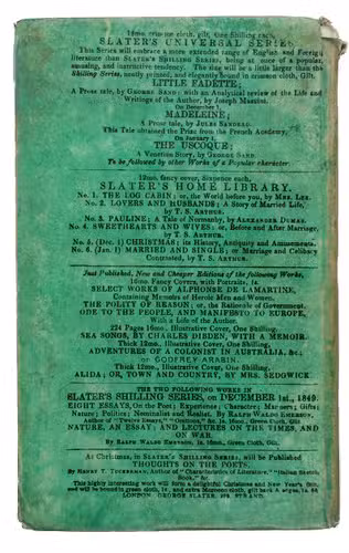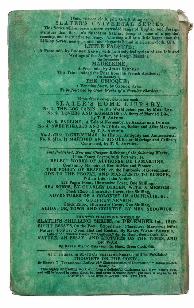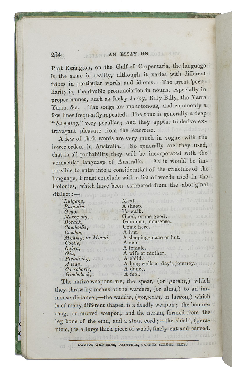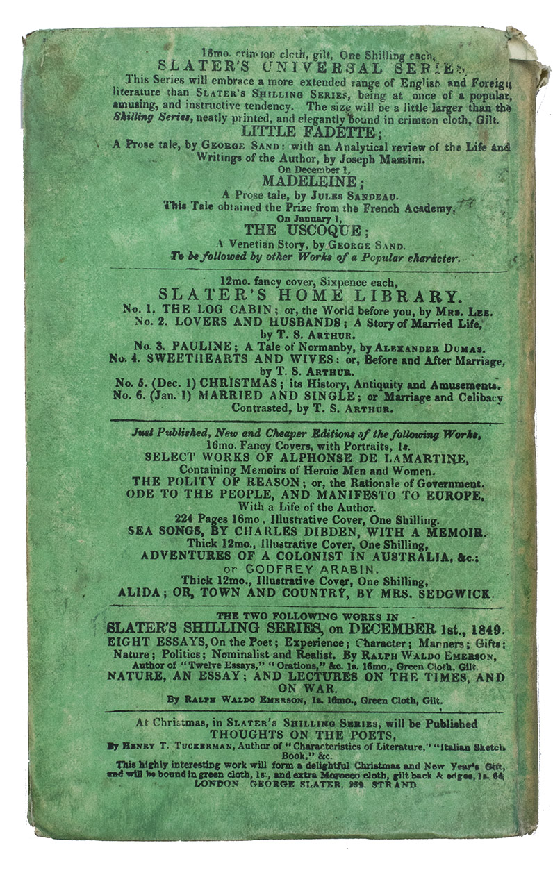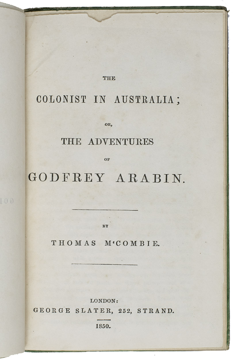 London, George Slater, 1850. Small 8vo. Title on binding in woodcut border, vignettes depicting Australian rural sceneries. Publishers original green paper boards. [4], 236, [2] pp.