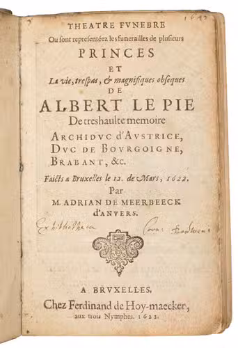 Impetus for the book was the Brussels funeral procession of Albert VII (1559-1621), Archduke of Austria, who in 1598 had married the Infanta Isabella, daughter of King Phillip II of Spain, who appointed them co-governors of the Spanish Low Countries. Meerbeeck dedicated the book to Aubert Lemire, dated 18 June 1622 and Adrian de Meerbeeck (1563-post 1627) wrote the text. In the same year the Ferdinand de Hoeymaker also published an edition in Dutch (Landwehr 72).