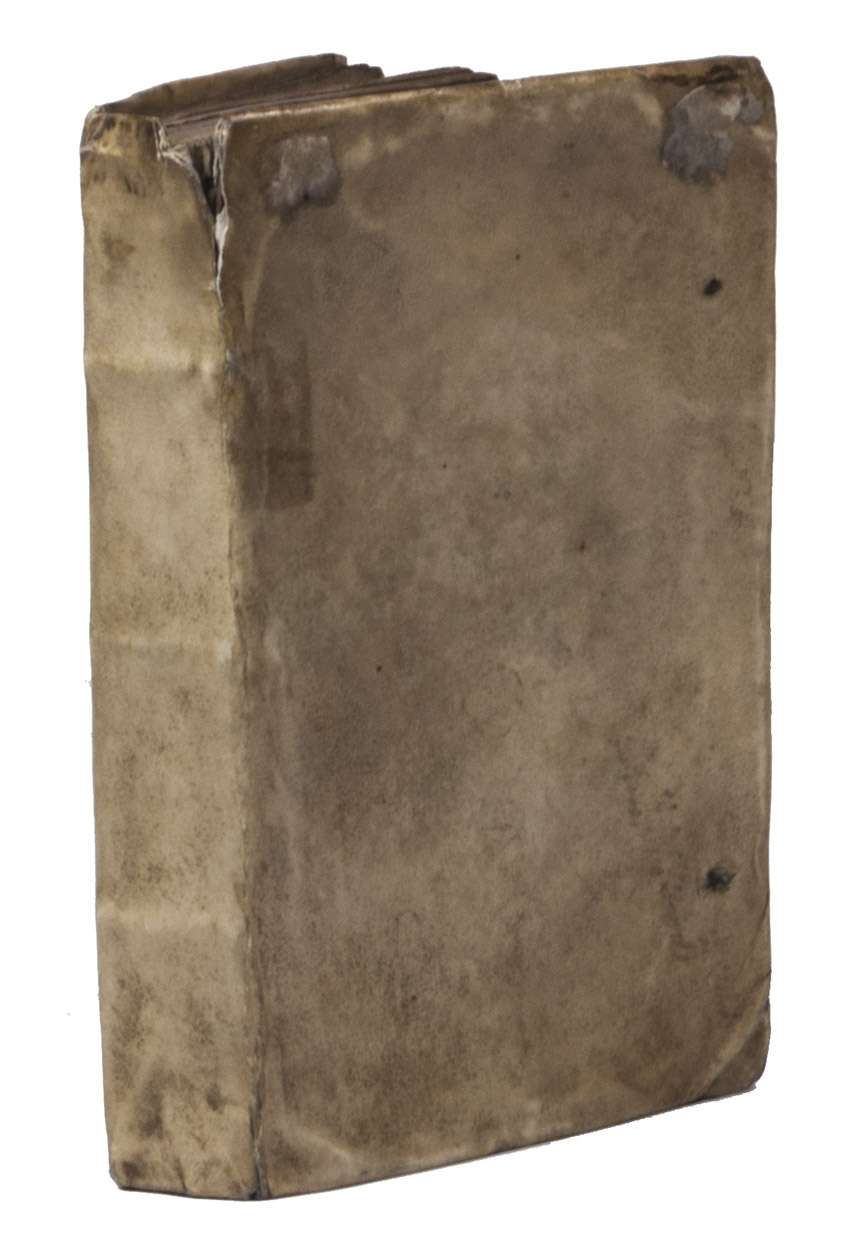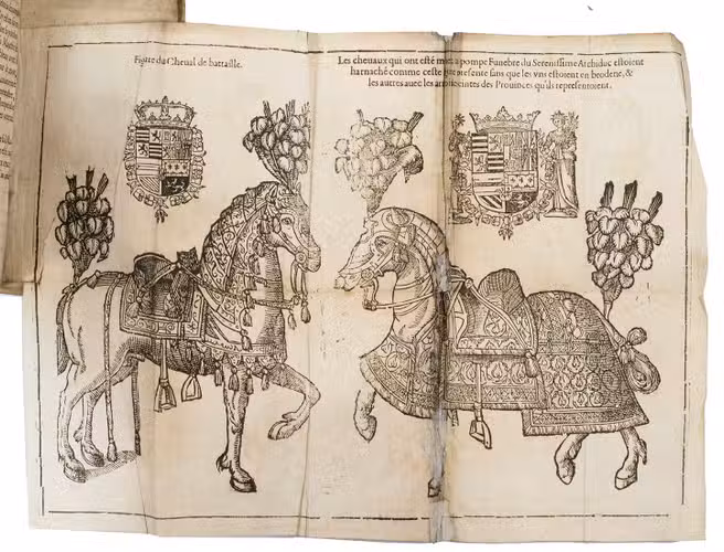 Brussels, Ferdinand de Hoeymaker [printed by Henrick van Hastens in Louvain], 1622. 8vo. With a small woodcut decoration on the title-page and a full-page woodcut representing a "chapelle ardente" on the verso; a large folding woodcut plate with two horses, one dressed as a "cheval de bataille" and the other as used "à la pompe funebre du ... Archiduc". Further with 3 woodcut decorated initials (2 series) and 2 woodcut factotums. Contemporary vellum, remnants of ties. [8], 278, [2] pp.
