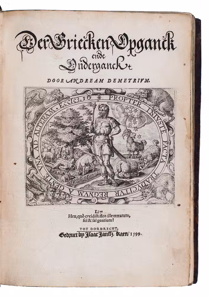 First edition of the history of Ancient Greece by Andries de Meester (d. 1611). An Antwerp minister of the Protestant church from about 1568, who fled to Frankfurt, Germany when Antwerp fell to Spain in 1585, and remained there until he was called as minister to Dordrecht in 1594. A tolerant man, he was highly esteemed but had to leave his office in 1609 due to poor health. His son Daniel succeeded him.