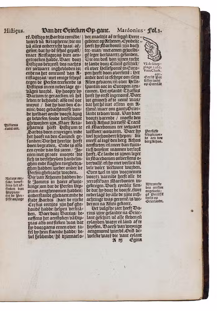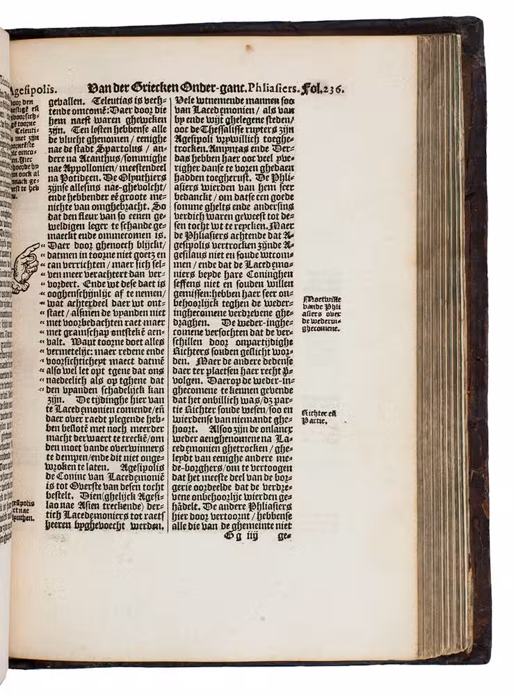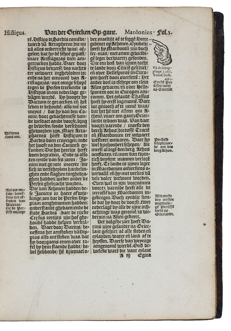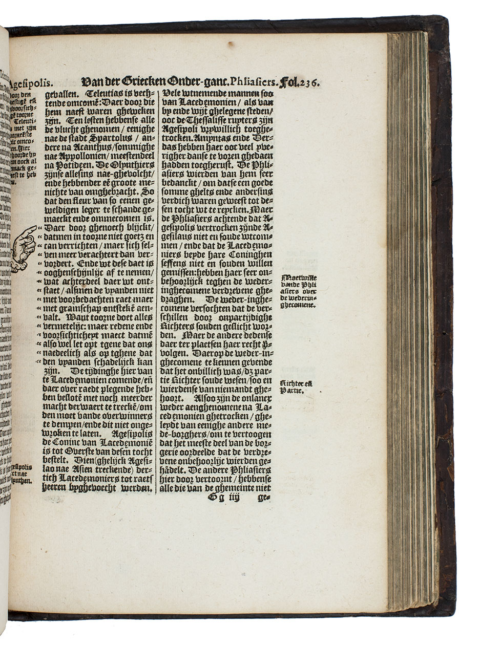 The present work treats the rise and fall of the Greek empire, from the Persian wars to Alexander the Great, and is dedicated to the States General of the Dutch Republic. De Meester intended it as an example for the Dutch, to inspire them with the courage of the Greeks and urge them not to commit the same errors. To facilitate reading, the important passages are marked with a woodcut pointing hand in the margin. Also of interest is the large, detailed map by Joannes van Doeticum, representing Italy, Sicily, Greece and a part of Asia.