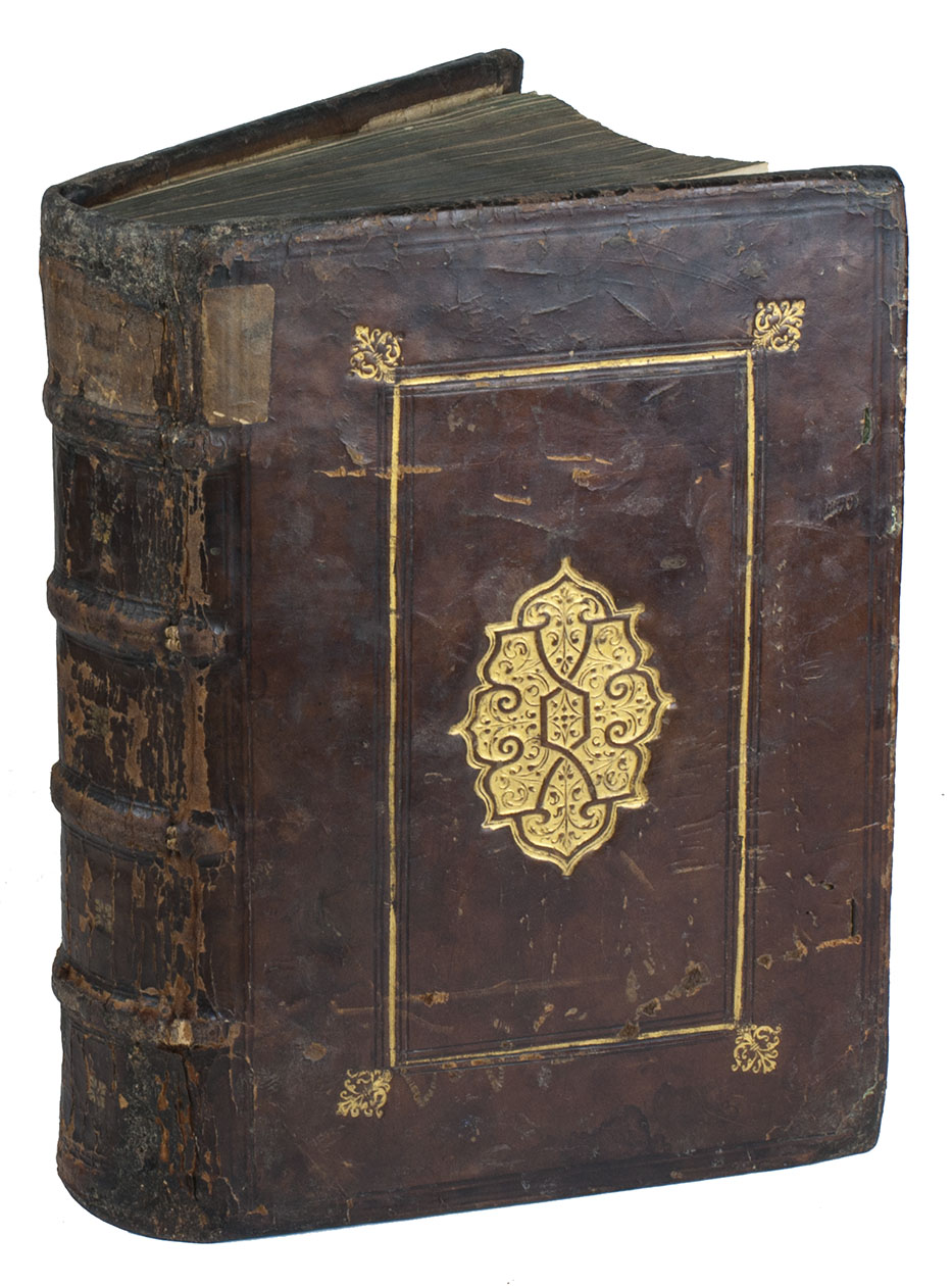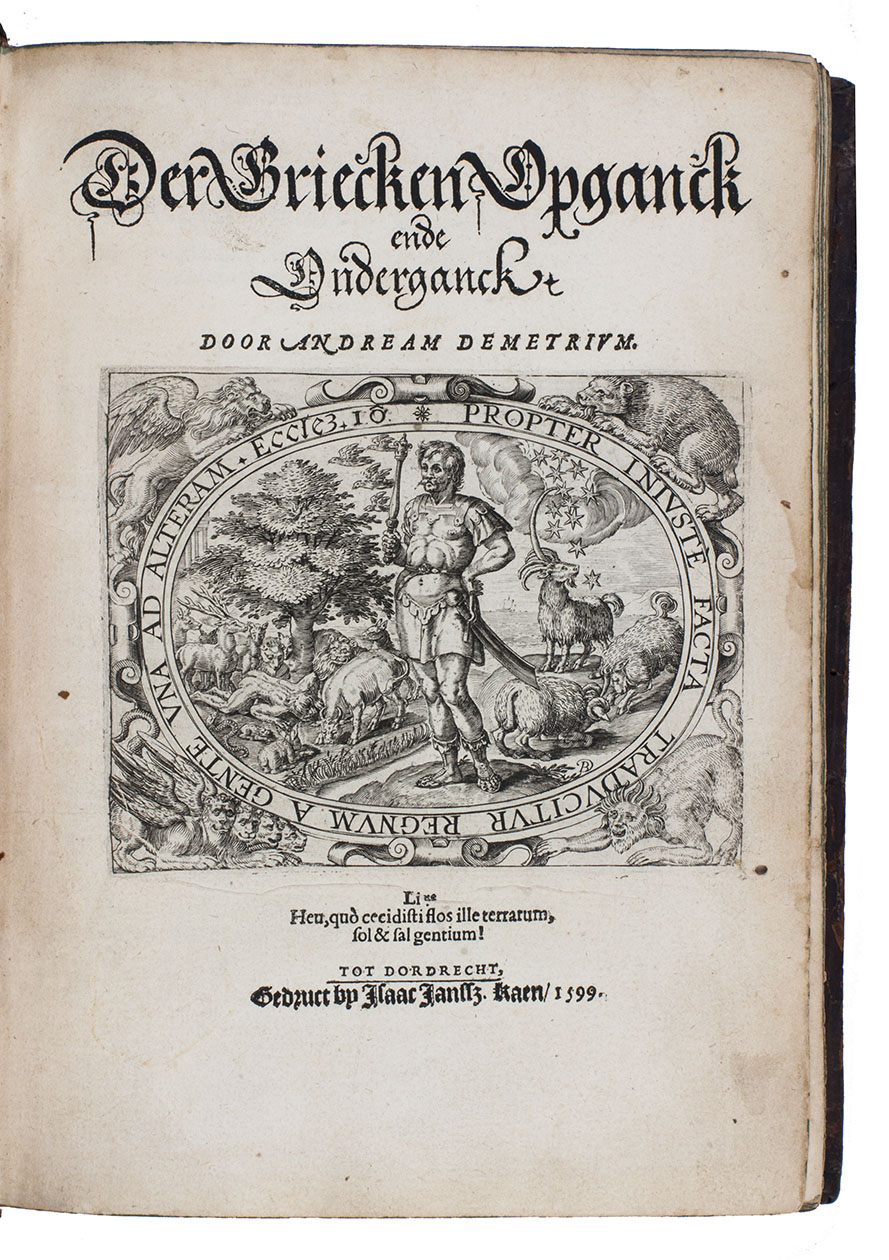 Dordrecht, Isaac Jansz. Canin, 1599. 4to. With the opening words of the title printed from a woodblock, a fine engraved biblical scene with a Latin motto apparently intended as Ecclesiastes 10:8 (a warning of the consequences of injustice) on title-page, and a folding engraved map of Ancient Greece by Joannes van Doetecum (not included in all copies). Contemporary gold-tooled calf. [10], 288, [19] ll.