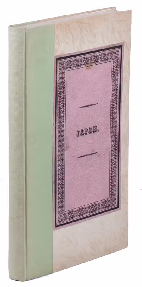 Amsterdam, M. Westerman & son, 1830. 8vo. With engraved title-page with hand-coloured vignette lightened with gold and 2 folding aquatint plates. Modern green half cloth, with the front of the original letterpress-printed wrappers mounted on front board and the back wrapper loosely inserted. [12], 190, [2 blank] pp.