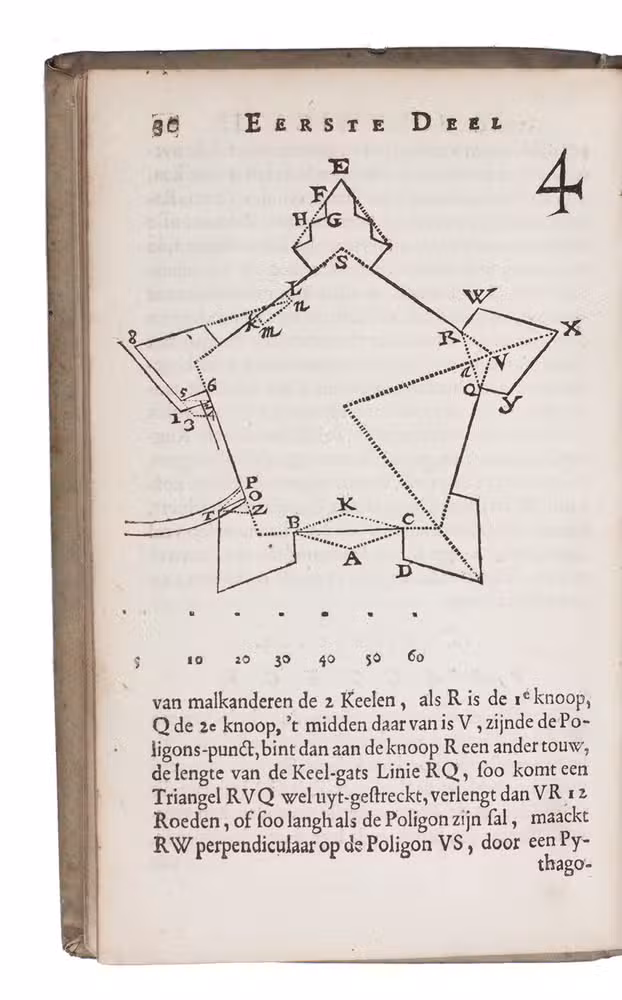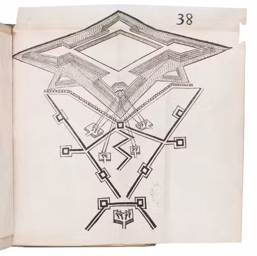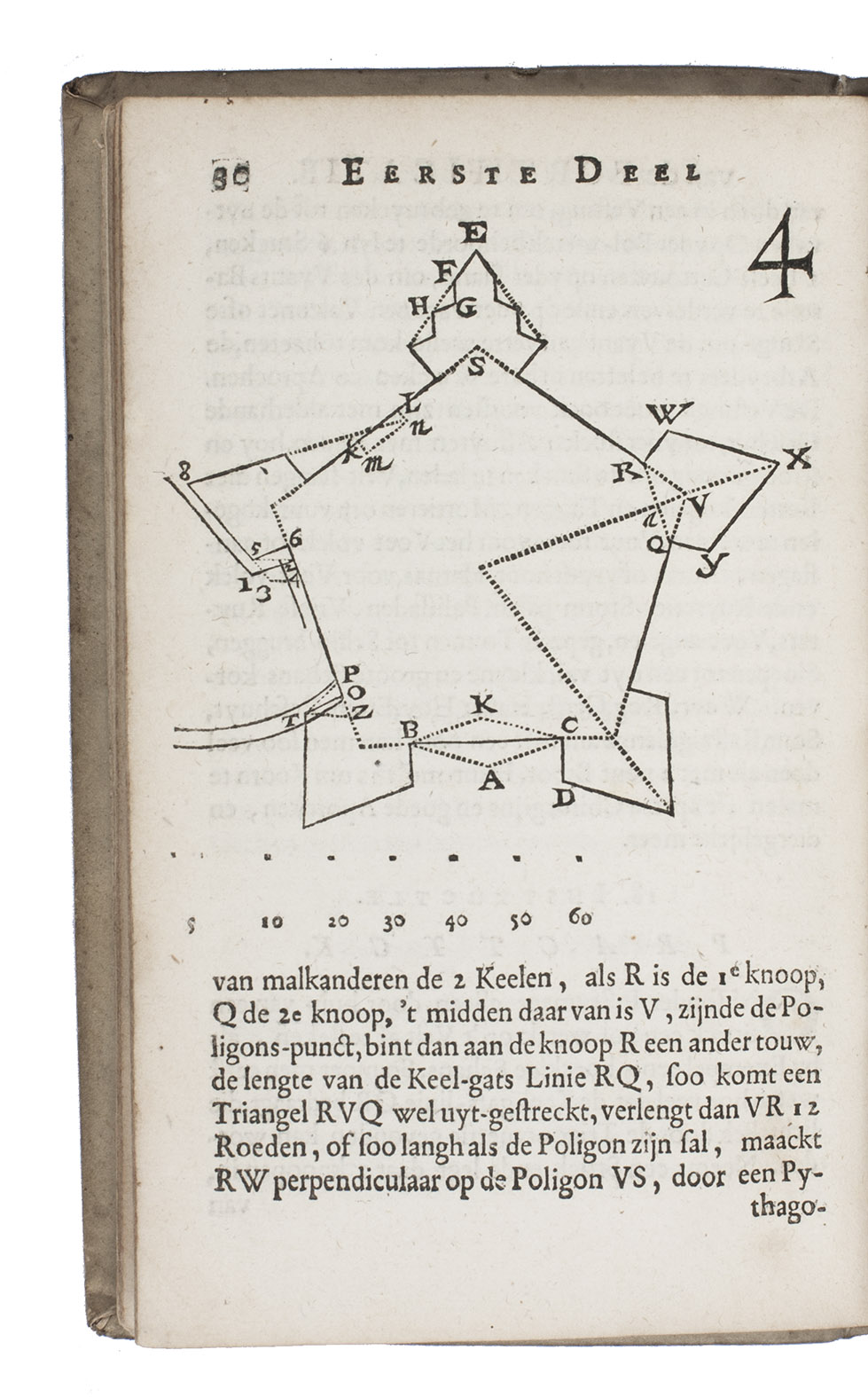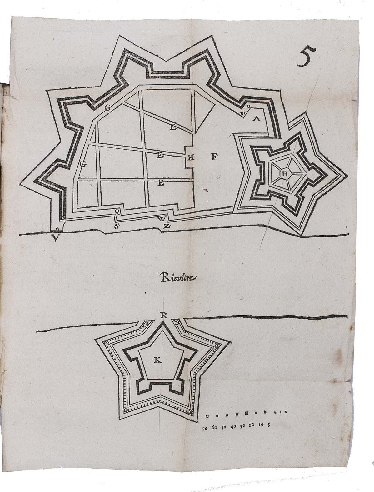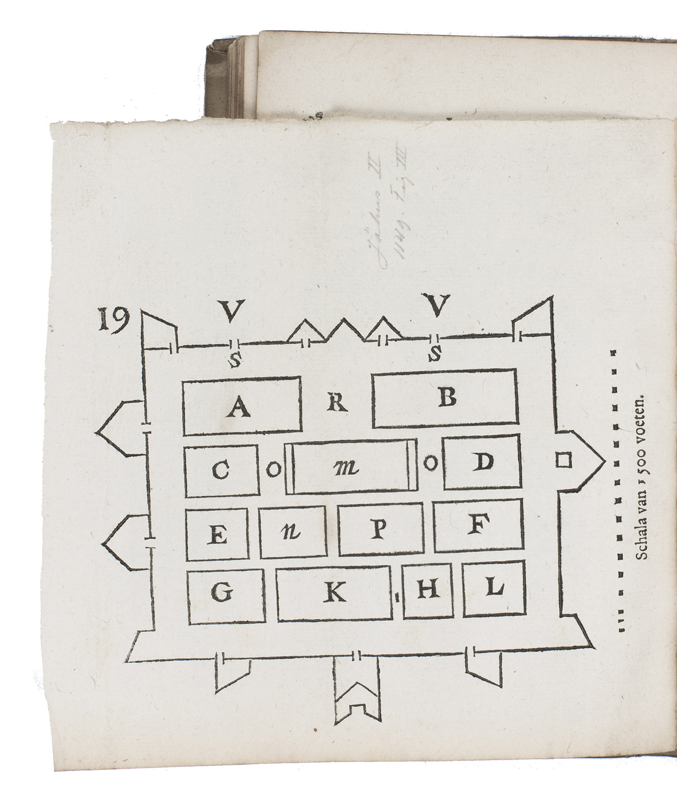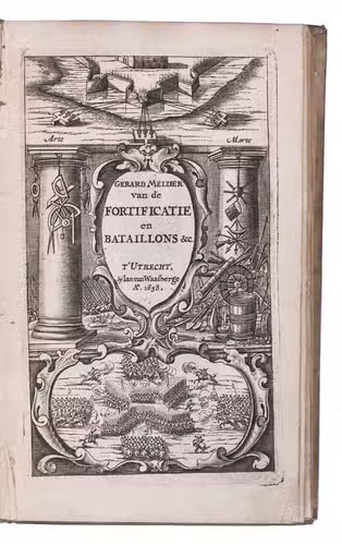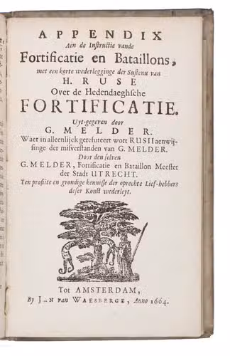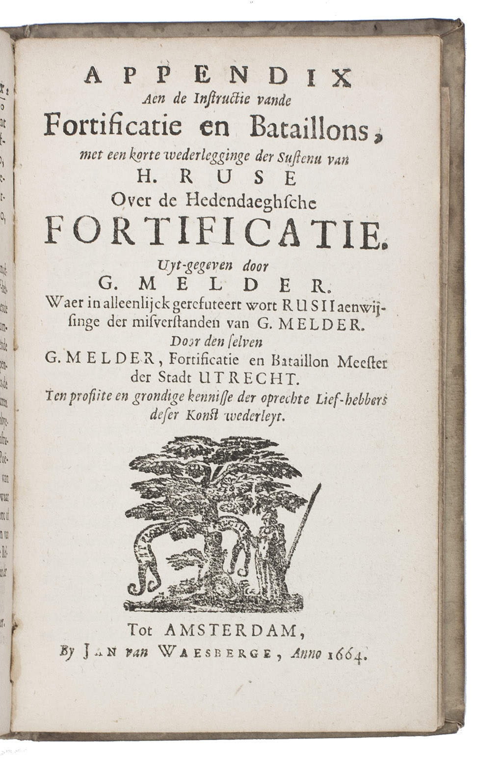 Second edition of a popular and richly illustrated text book on fortification by Gerard Melder, with 50 assignments for the pupils to solve included at the end. Also included is the Appendix, containing the author's answer to his Amsterdam colleague Henrick Ruse discussing the proper system of fortification fit for education. Ruse, engineer of the fortifications and head of the battalion at Amsterdam, published his Versterckte vesting in 1654, in which he broke with the traditional views on fortification of Freitag and Marolois. In answer to Ruse, Gerard Melder, director of the fortifications and the battalion of the city of Utrecht, published the present "Short and clear instruction" in which he clearly taught and illustrated the well-tried Dutch system of fortification, which had helped the Dutch win their war of independence from Spain. Ruse answered this with Aenwijsinge der misverstanden van G. Melder, published in 1658, to which Melder again responded with the present Appendix. Some occasional underscoring with red pencil, quire O ("register") bound before the text within quire *, and a few smudges. Otherwise a very good copy. Jähns, p. 1340; Jordan 2461; STCN (4 copies); WorldCat (8 copies).